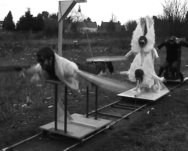 Video installation with: 5 HD screens, 5 speakers, a platform, wall painting