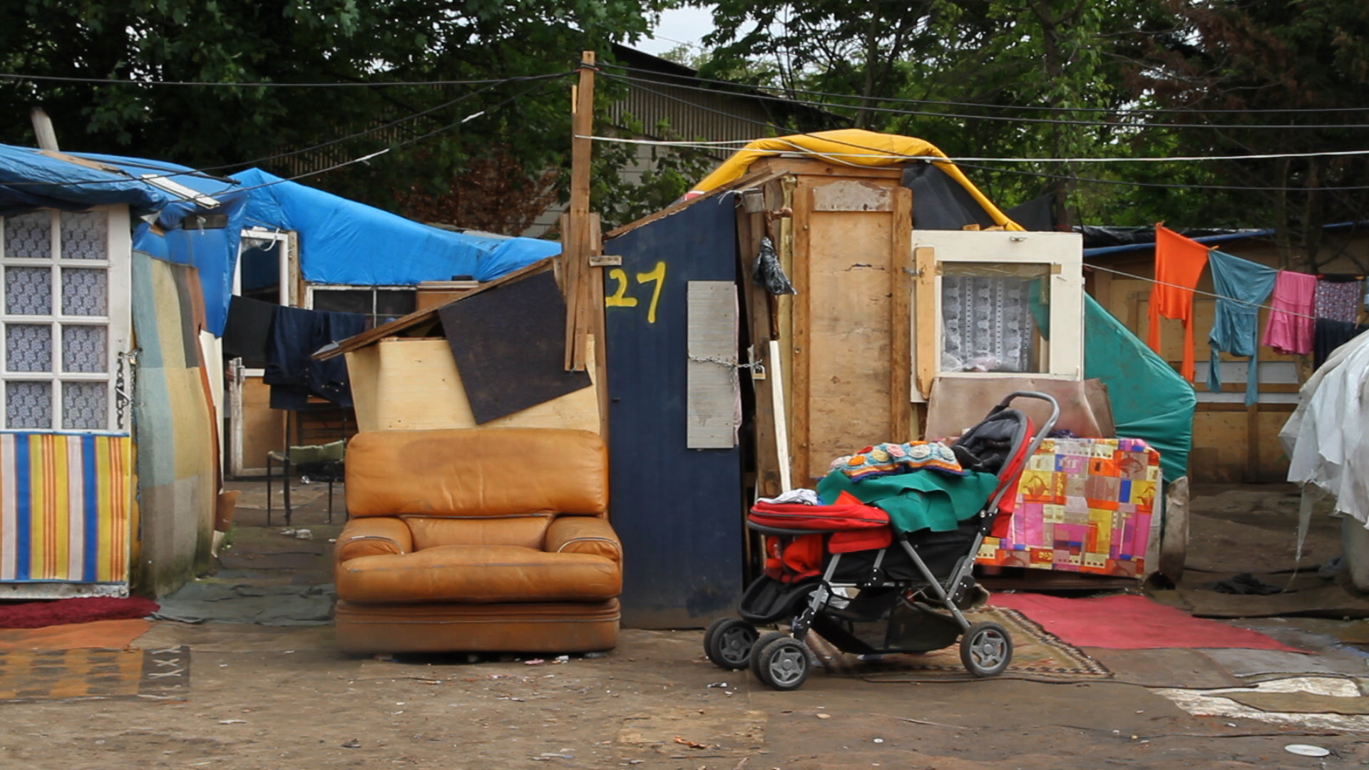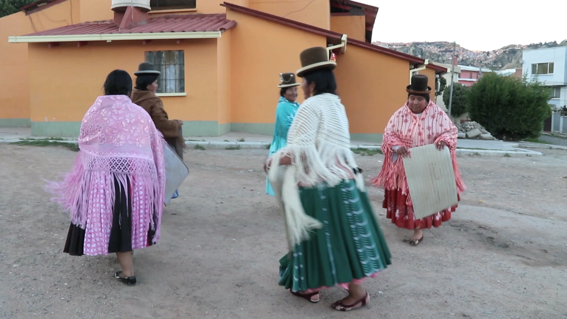 Bertille Bak, La Brigada, 2018-2022 vidéo, couleur, son, 12 min 28 sec, écran, structure métal, 24 boîtes de cireurs collectées à La Paz, Bolivie, dimension variables