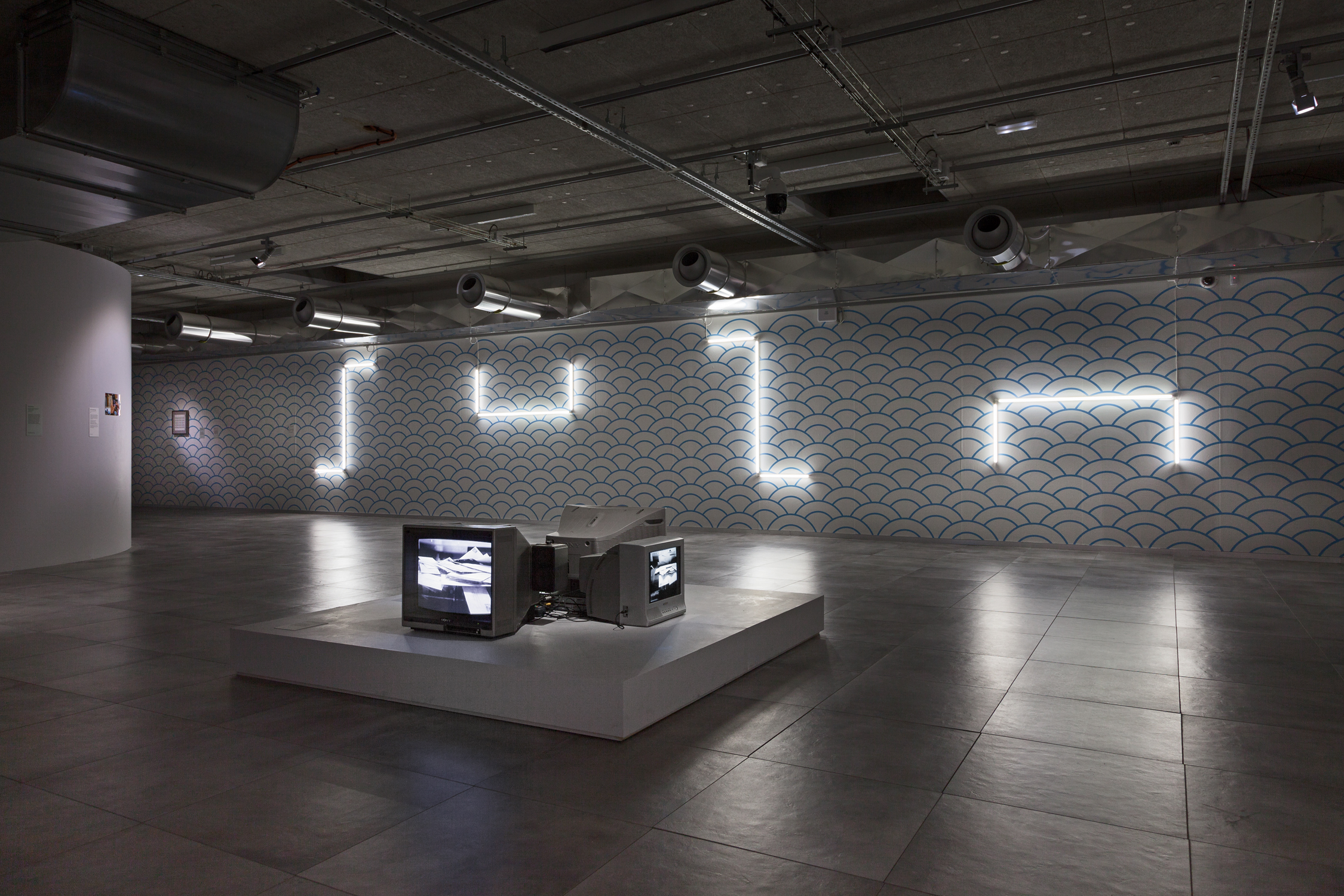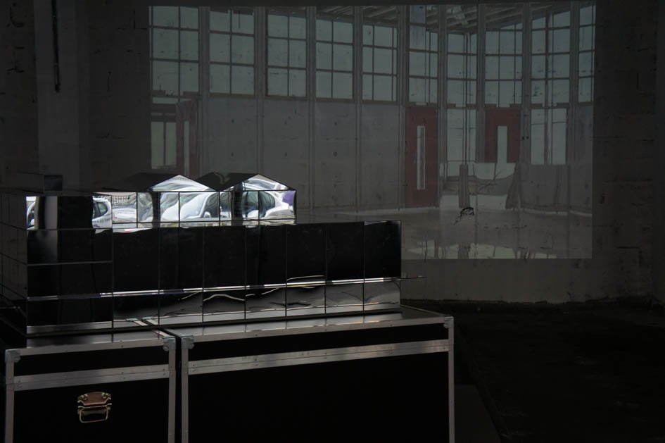 Sculpture (PMMA mirror bricks, flight cases, motor), HD movie, video projector