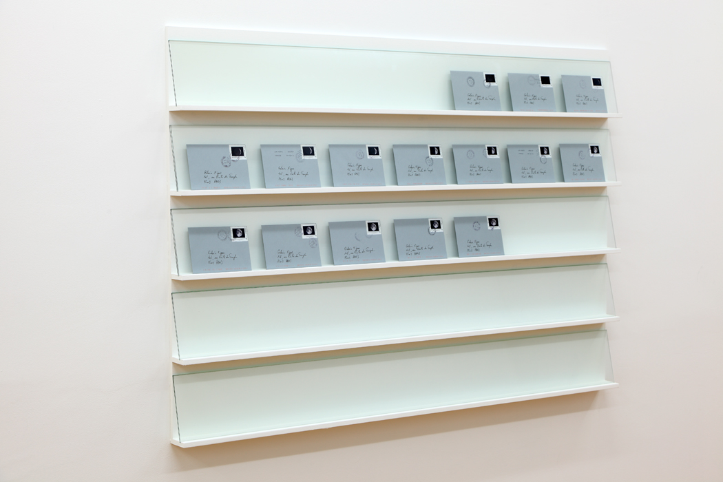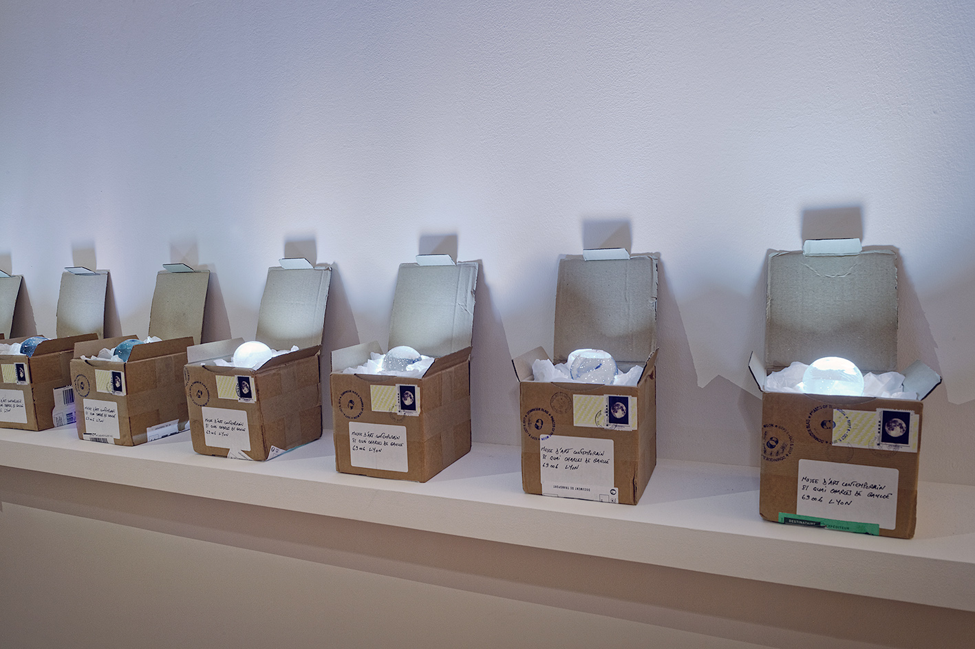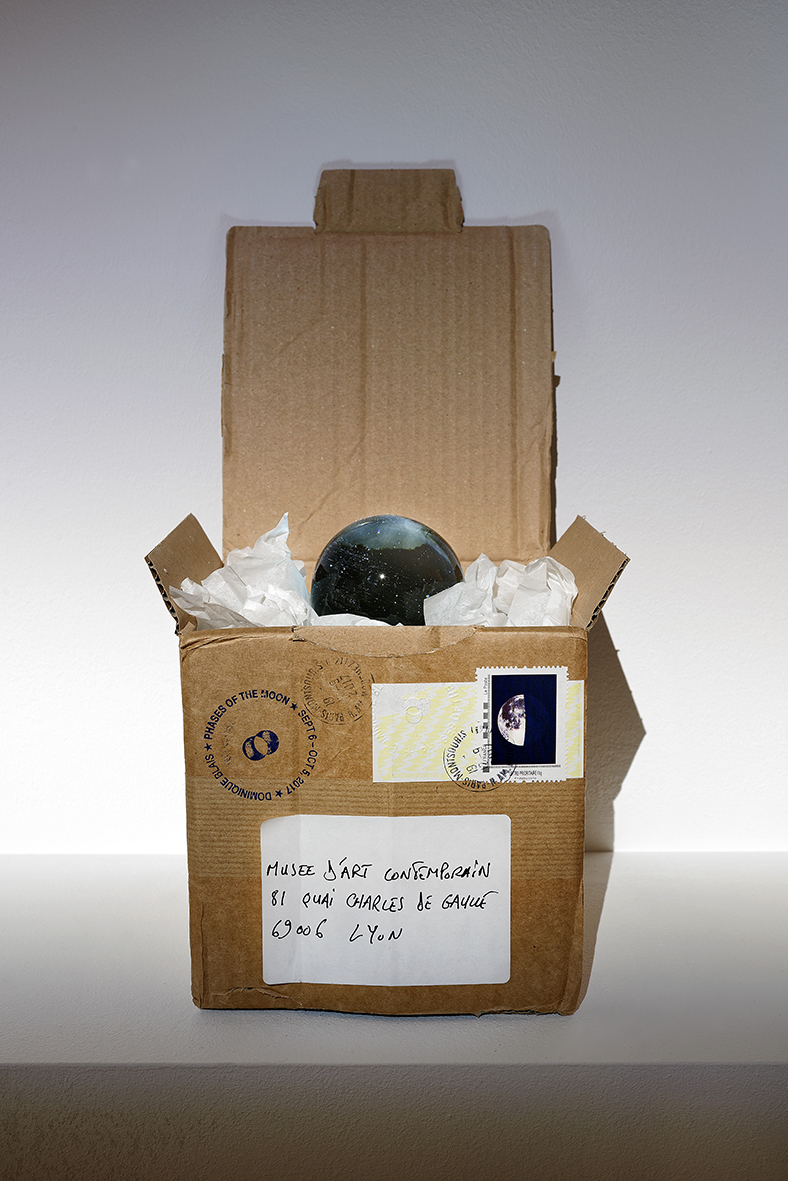 30 boîtes en carton timbrées et oblitérées (format 15x15x15 cm) contenant 30 sphères en verre massif teinté emballées avec des feuilles de papier de soie, et envoyées par l'artiste au Mac Lyon via les services postaux.