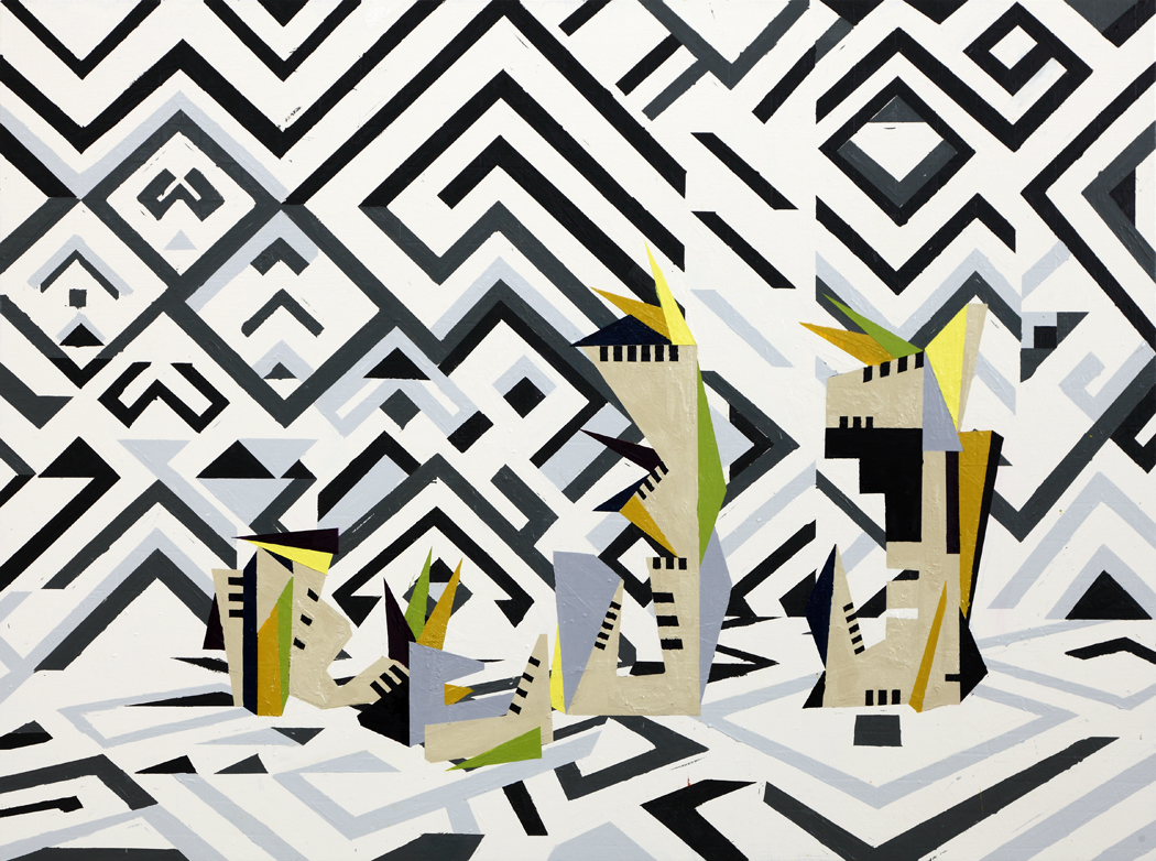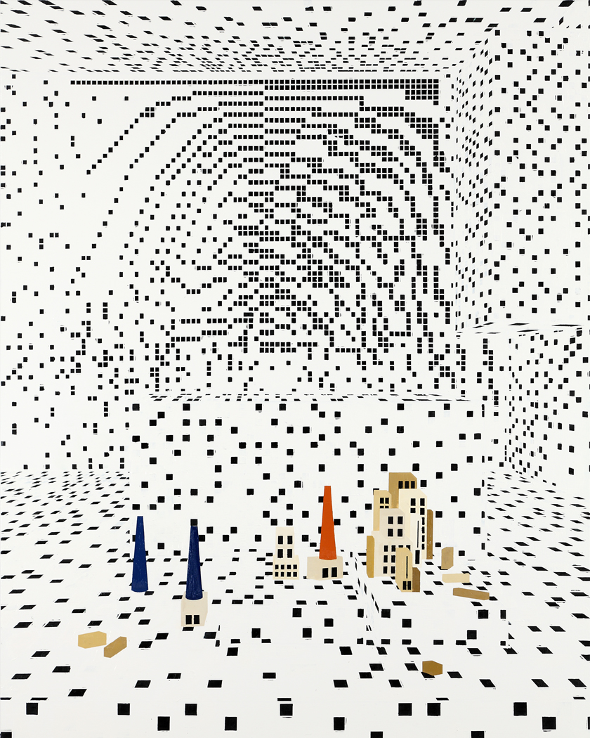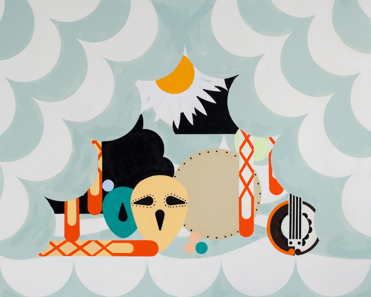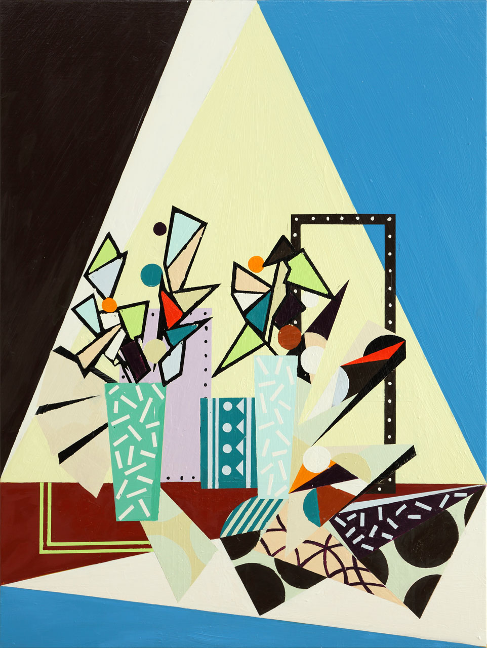 Farah Atassi develops a figurative painting using the vocabulary of abstract painting: the geometric shapes that efficiently make up the composition create spaces in which the objects are put on “display”. Her paintings deals with thick layers and repentance that contrast with the rigidity of straight lines. Similar to a collage, they meticulously combine anachronistic forms with contradictory appearances, borrowed from sculpture, painting, and design. Through her complete dedication to this media, Farah Atassi develops a painting style that is simultaneously conceptual and joyful.