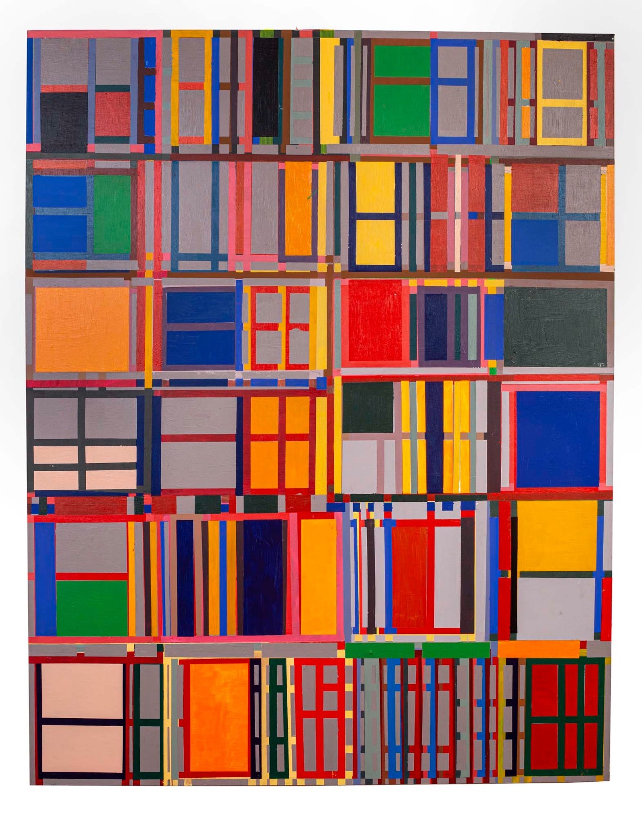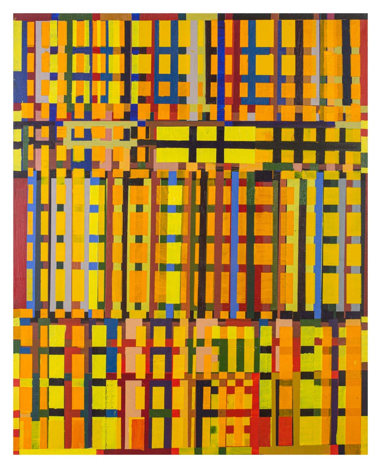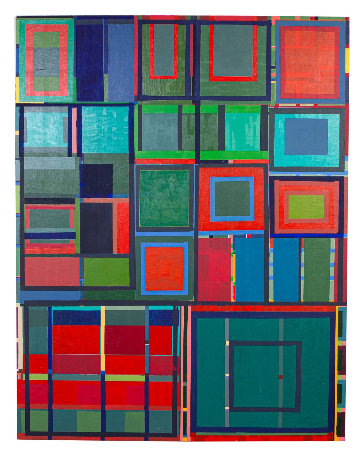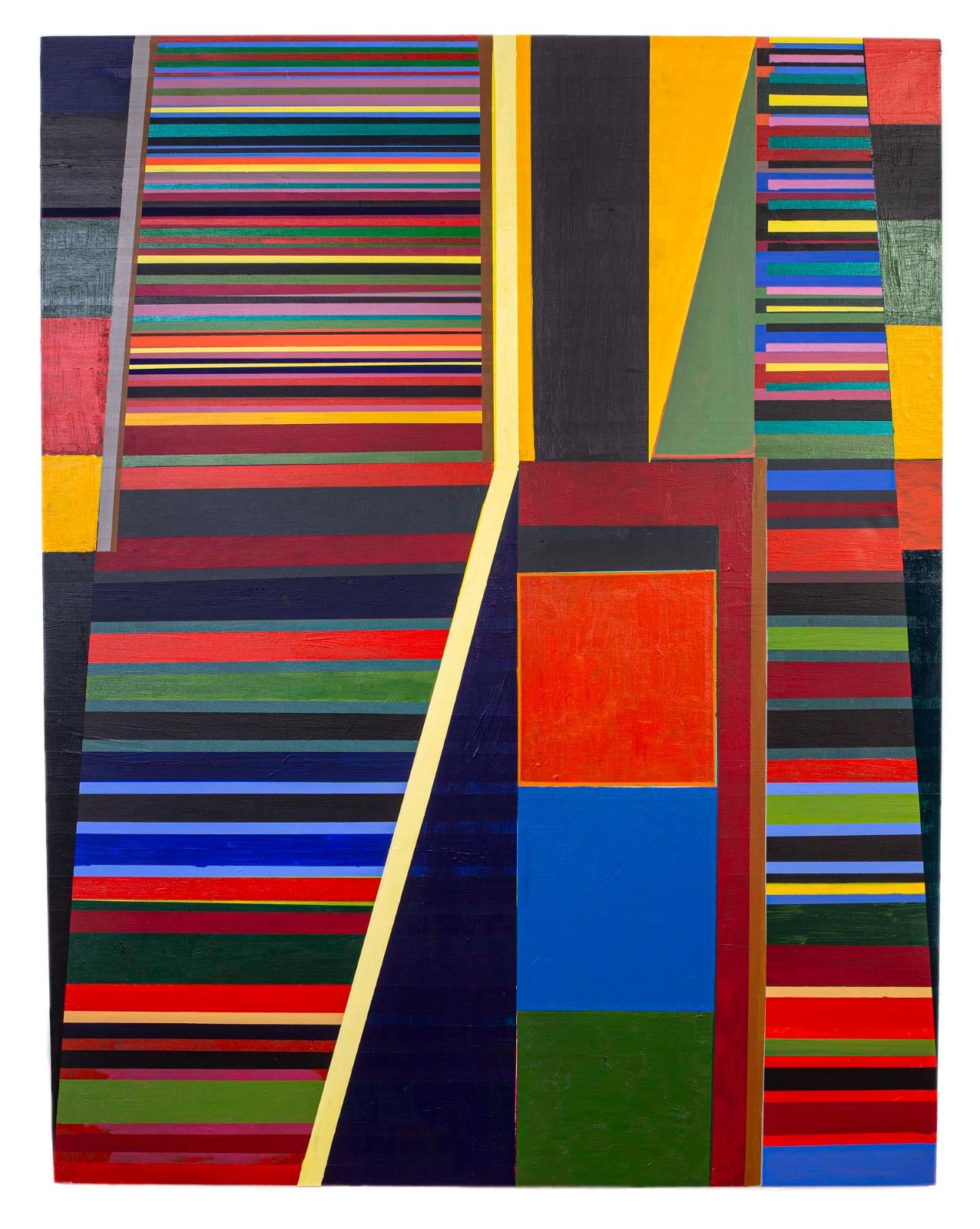 “López Lage highlights the irregularity, underlines the very rich and diverse formal games in each of the spaces, privileges the syncopated rhythms and highlights a geometry in which the gesture of the hand and the brush always plays: the artist’s mark is noticeable, the matter and texture are present, that makes his work so dense and distances it from any coldness. The color is what gives entity to his painting, it plays the role of drawing, perspective, shadow, volume and is always ready to impose itself on the material. The pleasure of painting in large format and intense colors is essential for López Lage.”