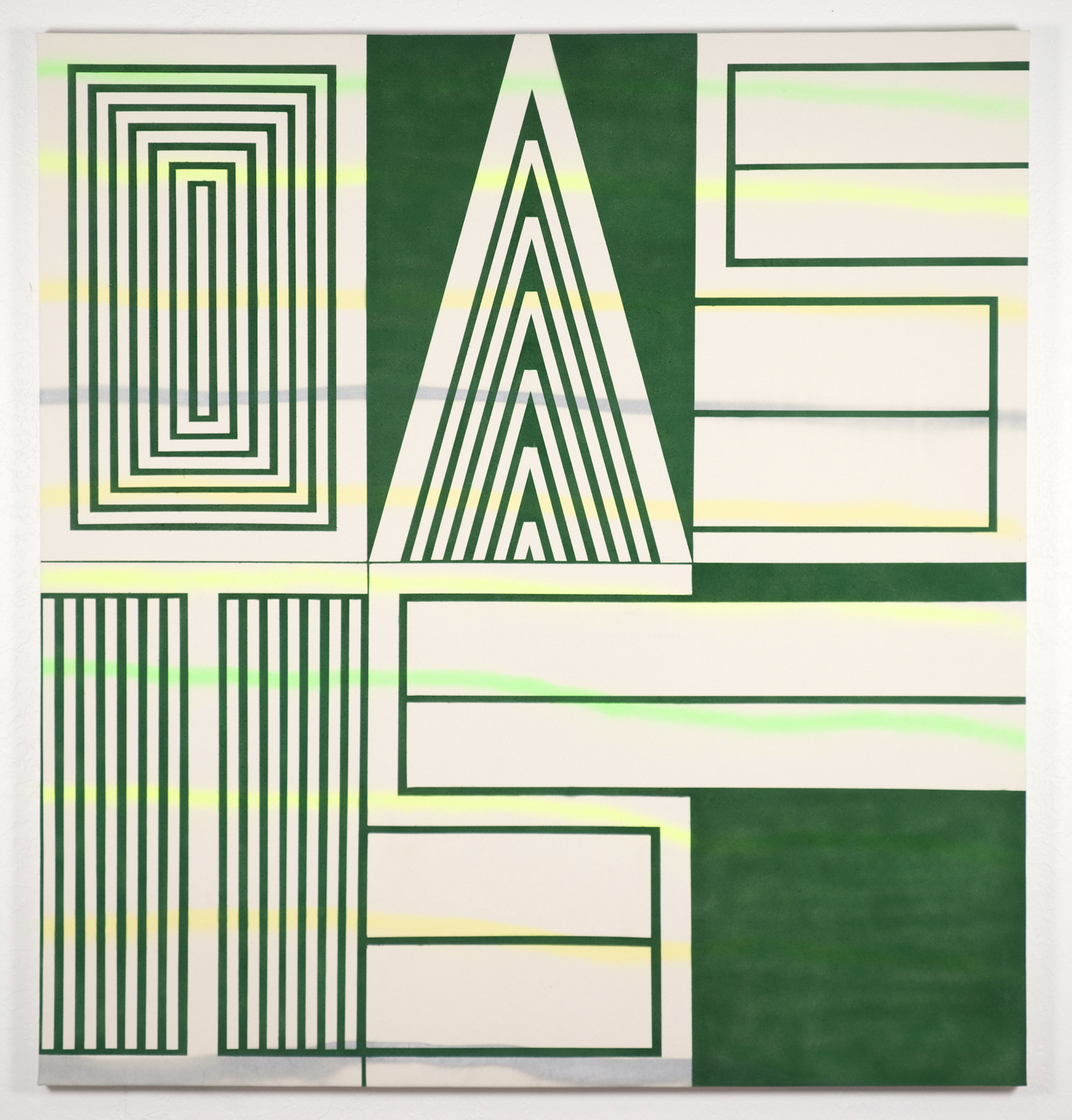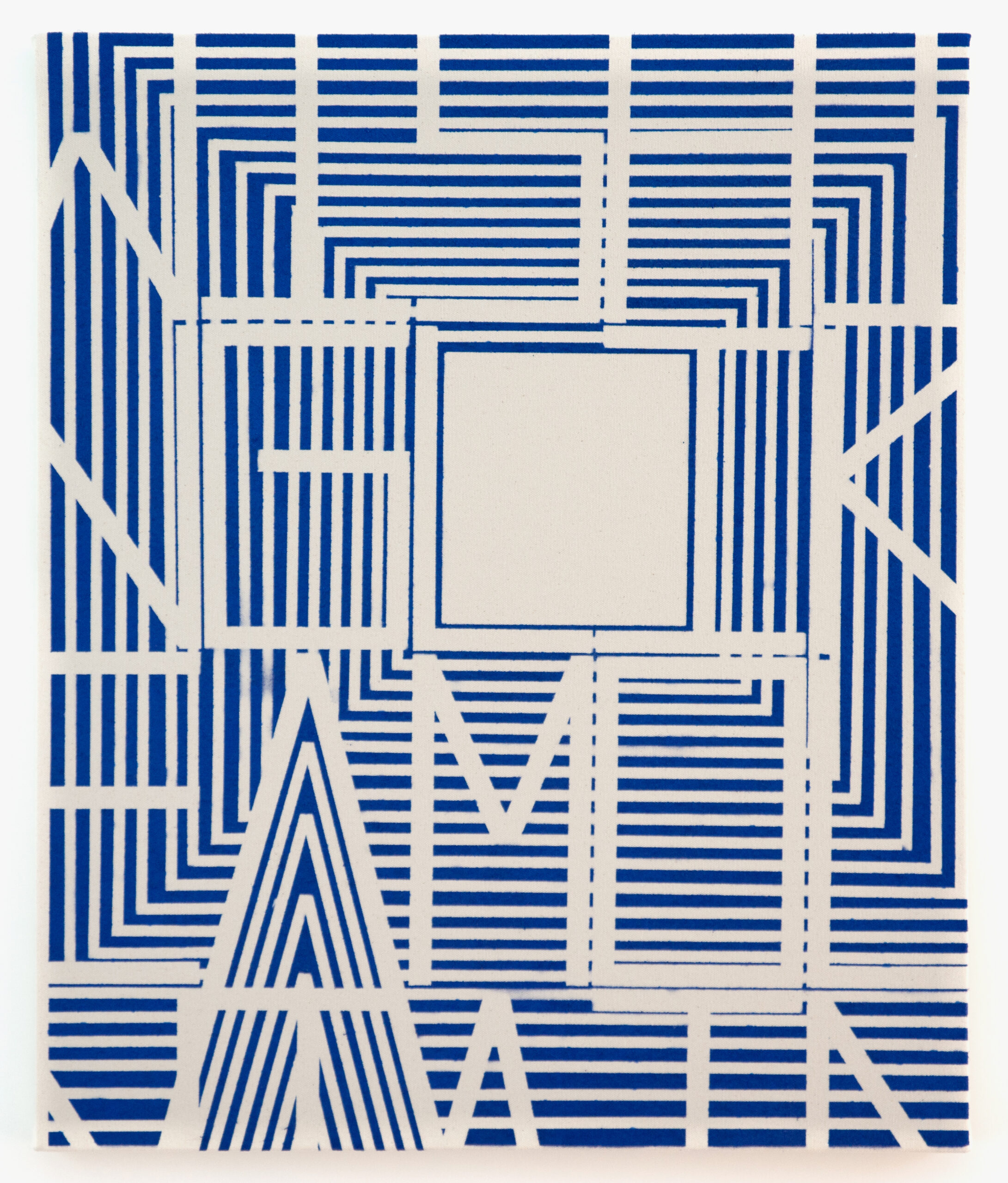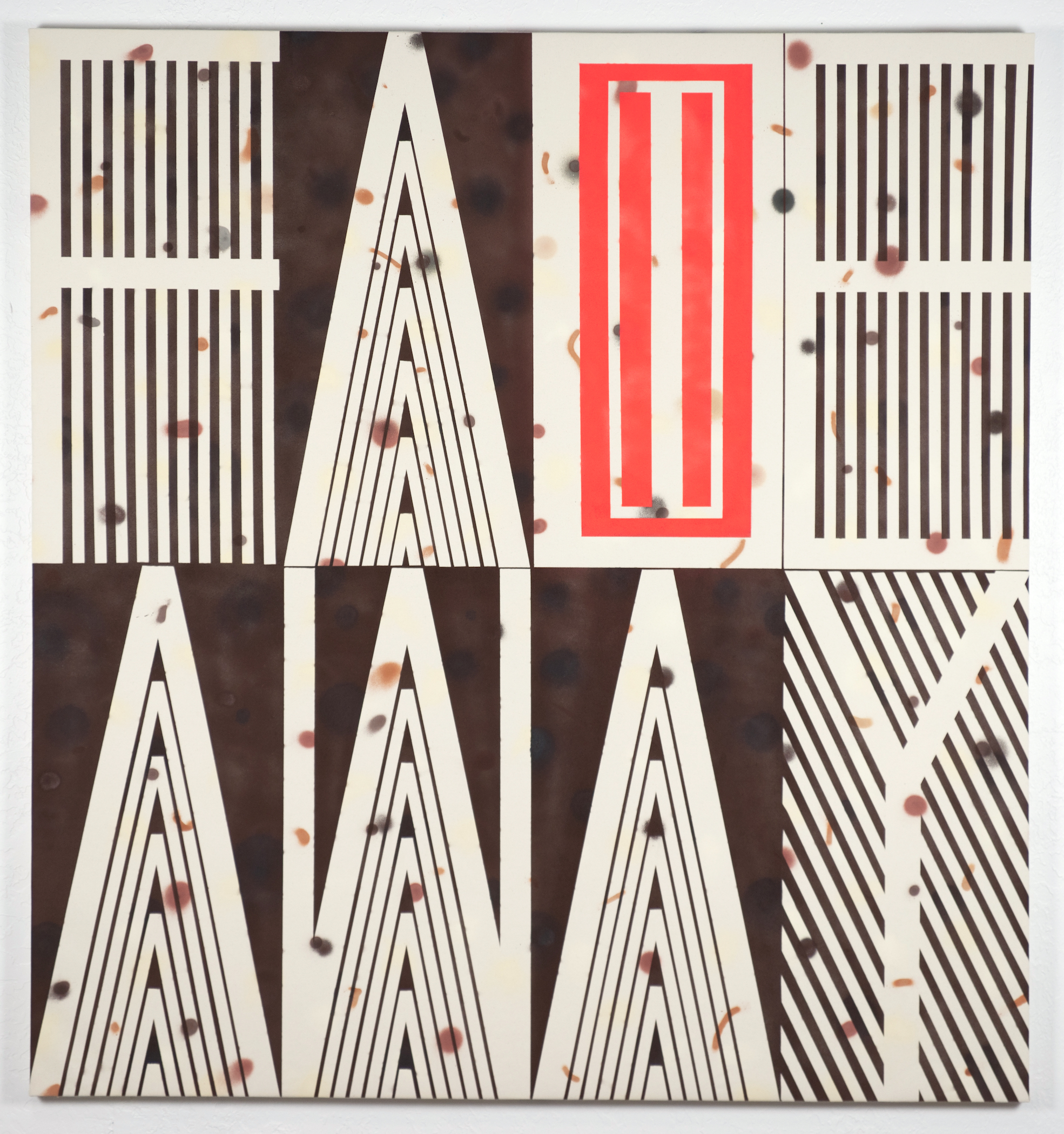 Made primarily with spray paint, his paintings spell out ideas through a calligraphic vocabulary, composed of geometric elements, such as stripes, rectangles, diamonds or pyramids. Although Abbott’s word-paintings are initially inspired by personal experiences and past memories, they are not solely diaristic, but take on a more general meaning. They are open for interpretation and welcome the viewer to invent his or her own brand new narratives.