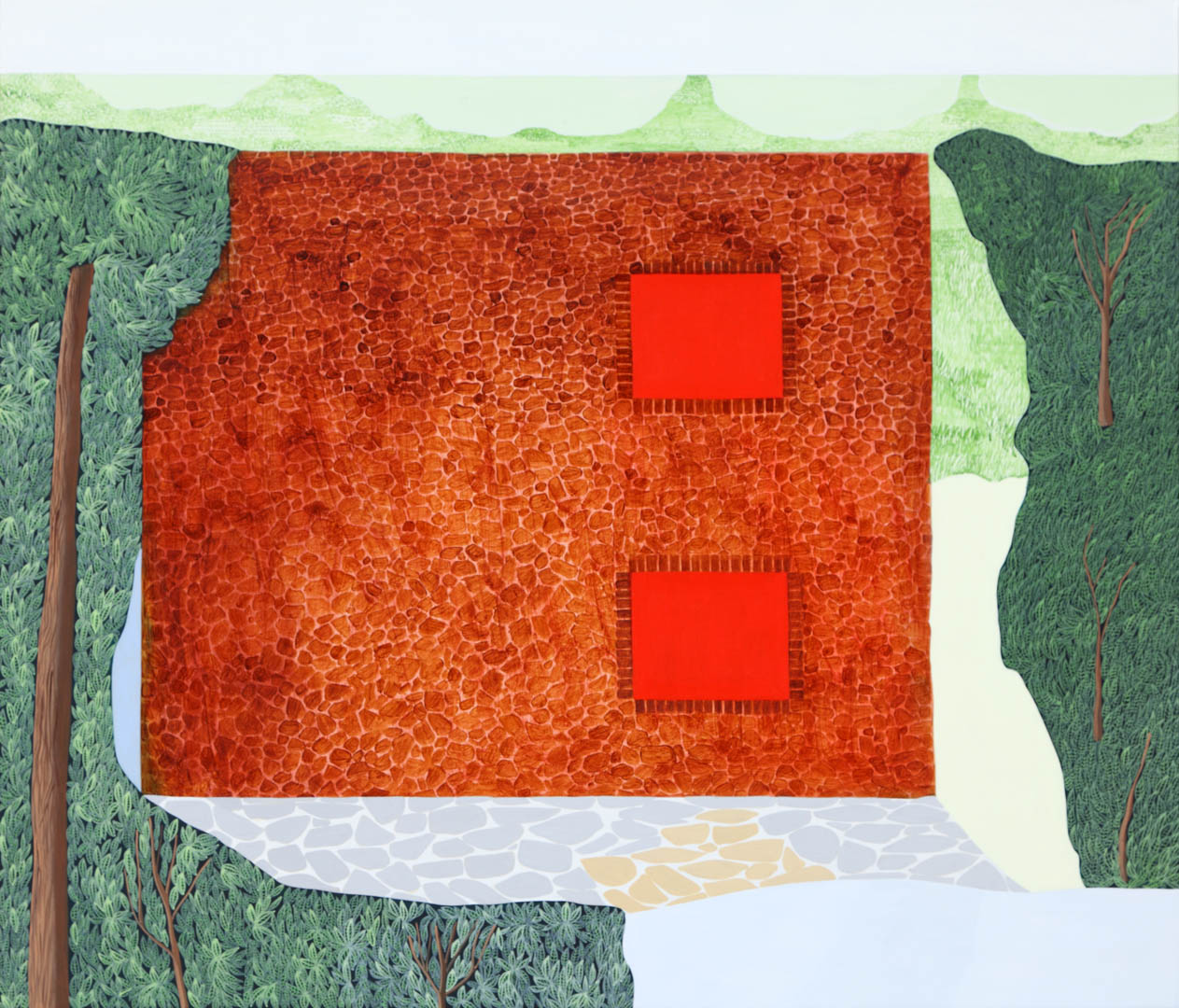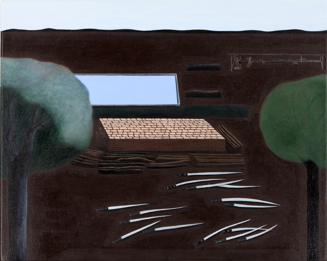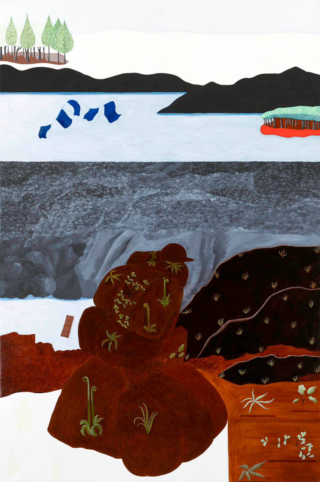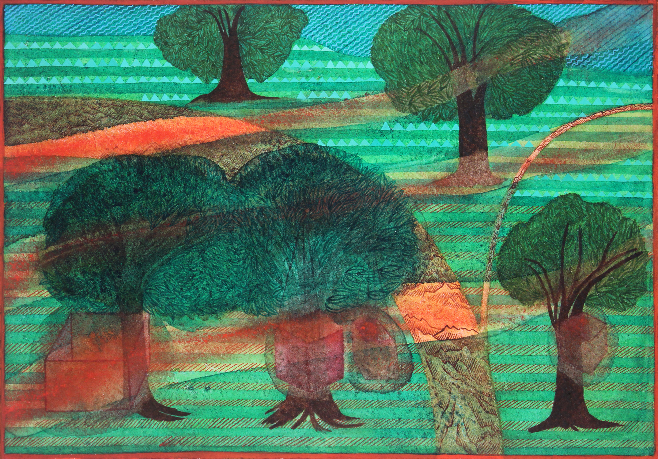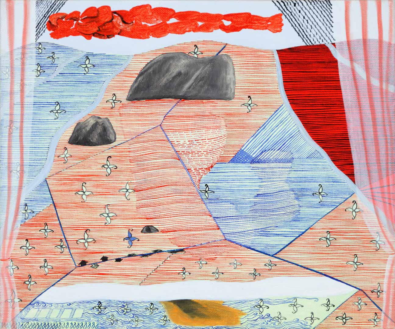 Karishma D’Souza makes detailed and meticulous artworks, which are carefully composed, trying to reflect the whole in a part and to fit the universe on a sheet of paper or a canvas. The paintings are inhabited with personal memories, transformed into signs and symbols, “layering objects with meaning”. These elements are at times thoughtfully repeated, as if to be fully recorded on both canvas and consciousness.