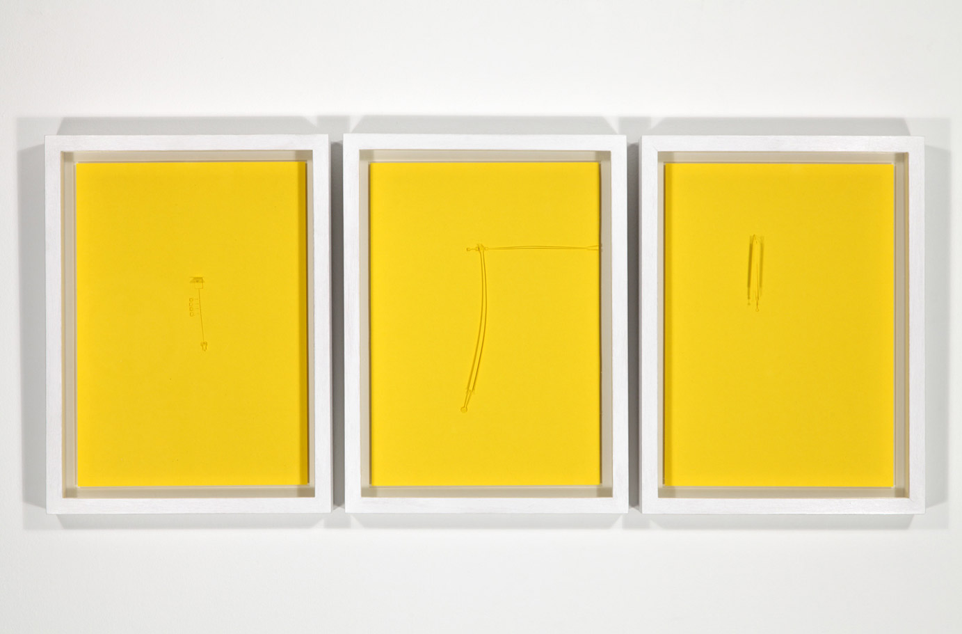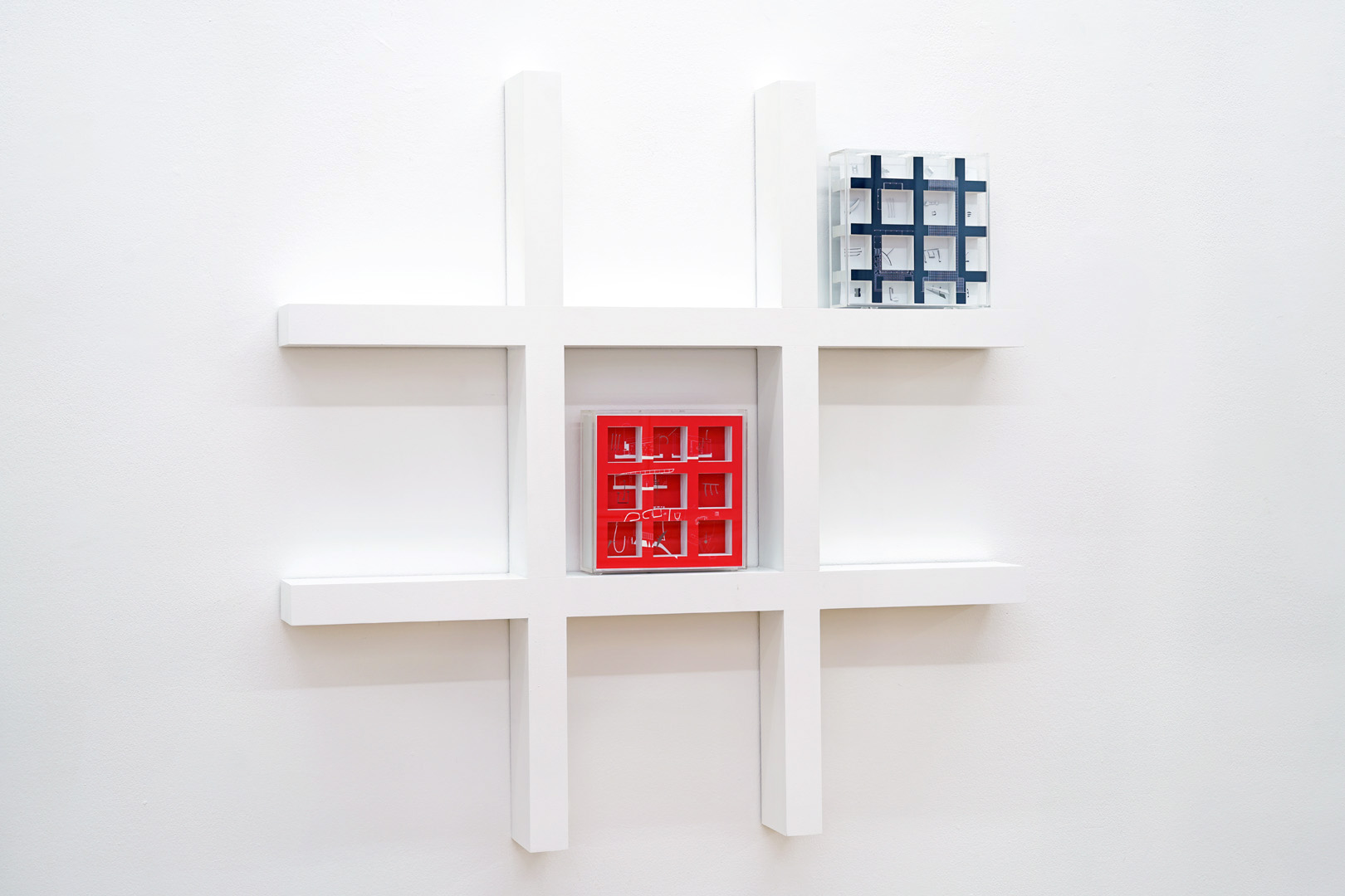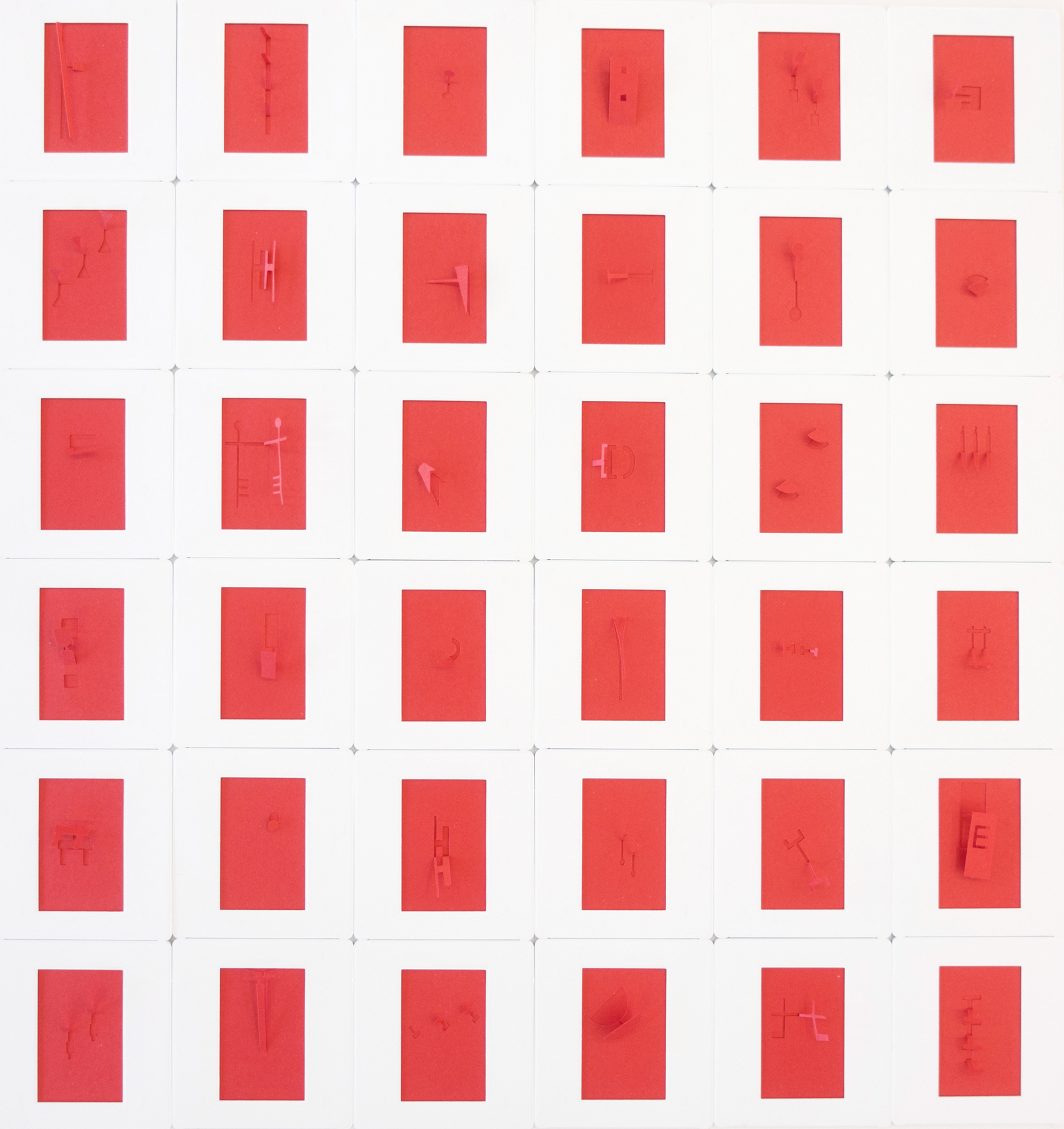 Marco Maggi’s work is an act of resistance. It doesn’t try to be grandiloquent or shocking. Through the observation of Plexiglas cubes, which at first glance seem transparent, or seemingly white sheets, we see interlaced designs of the barren with the abundant, subtle and almost impalpable reliefs that stand out from flat surfaces, the lack of contradiction between the surface and the support, and the interdependence between the recto and the verso. These precious objects reveal to us an infinite and delicate web budding with intimate relationships and the feeling of the sublime. Acting as visual haikus – their meaning remains enigmatic – the drawings merge with the space and form a constellation of scattered forms. Delicately and tenderly, the red, yellow, or blue sheets release discreet signals that meter our pace, functioning as colored stains, shadows, or reflections. Through his use of printmaking, drawing, carving, superposition, and light, Marco Maggi always intervenes in a subtle manner in order to plunge us into the complex rhizome connecting separate universes.