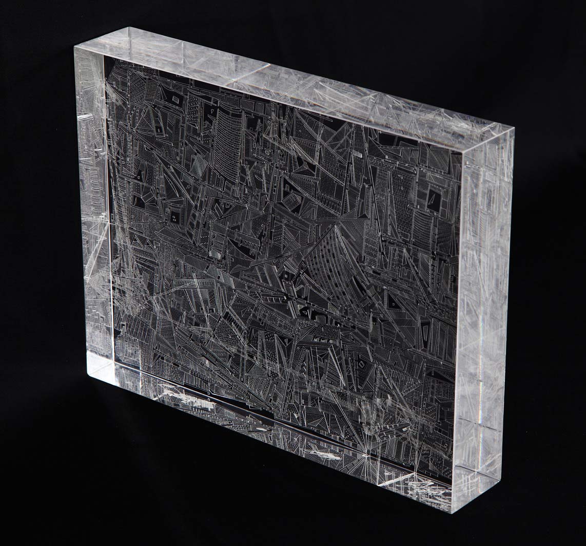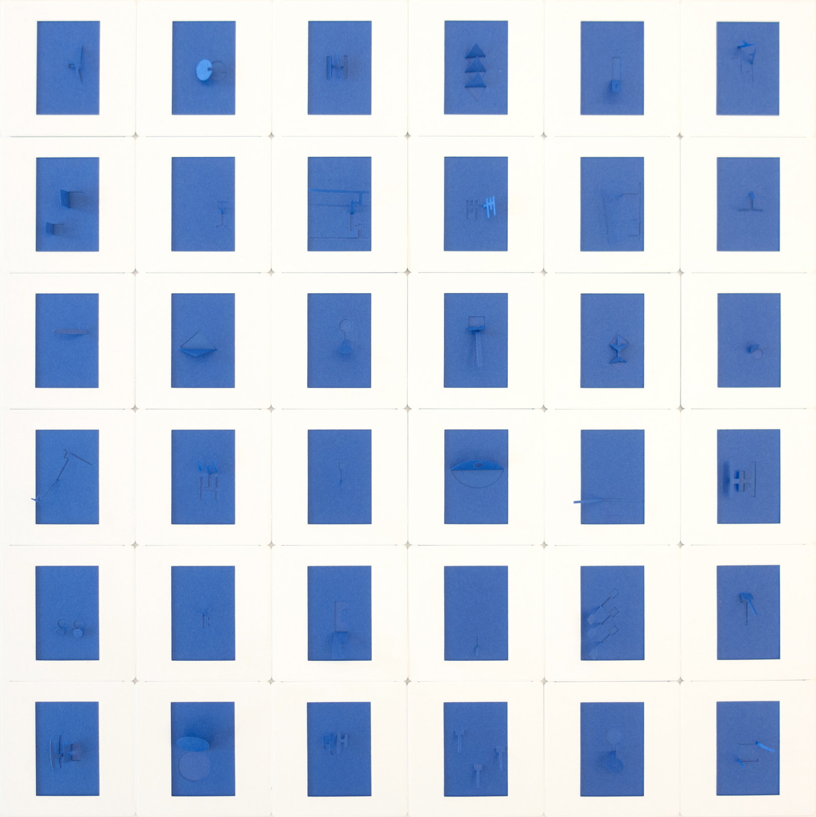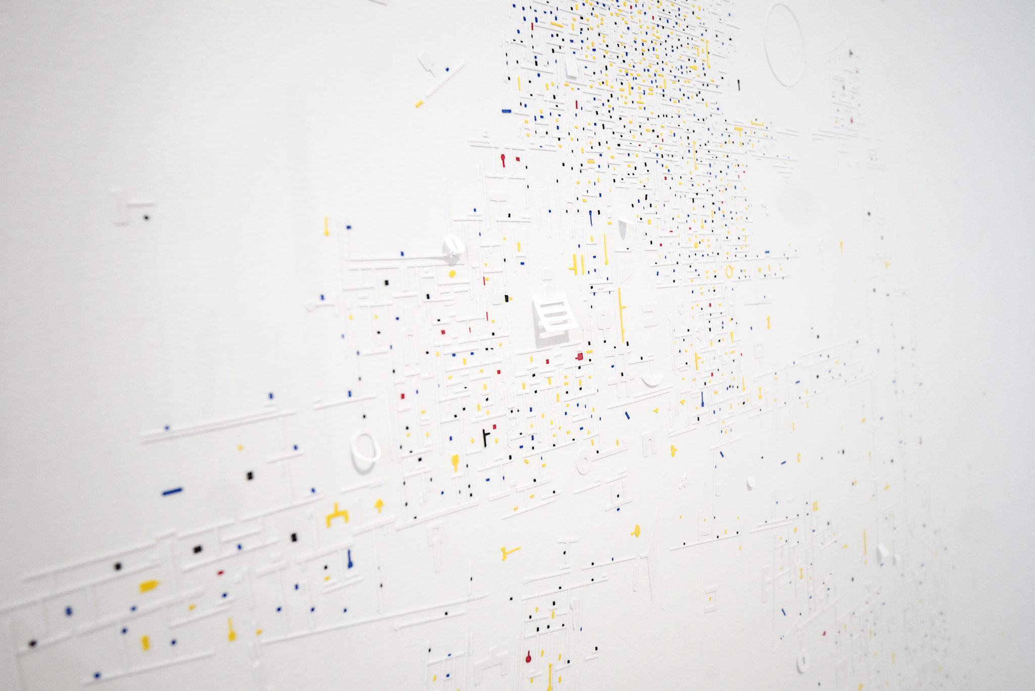 Marco Maggi’s work is an act of resistance. It doesn’t try to be grandiloquent or shocking. Through the observation of Plexiglas cubes, which at first glance seem transparent, or seemingly white sheets, we see interlaced designs of the barren with the abundant, subtle and almost impalpable reliefs that stand out from flat surfaces, the lack of contradiction between the surface and the support, and the interdependence between the recto and the verso. These precious objects reveal to us an infinite and delicate web budding with intimate relationships and the feeling of the sublime. Acting as visual haikus – their meaning remains enigmatic – the drawings merge with the space and form a constellation of scattered forms. Delicately and tenderly, the red, yellow, or blue sheets release discreet signals that meter our pace, functioning as colored stains, shadows, or reflections. Through his use of printmaking, drawing, carving, superposition, and light, Marco Maggi always intervenes in a subtle manner in order to plunge us into the complex rhizome connecting separate universes.