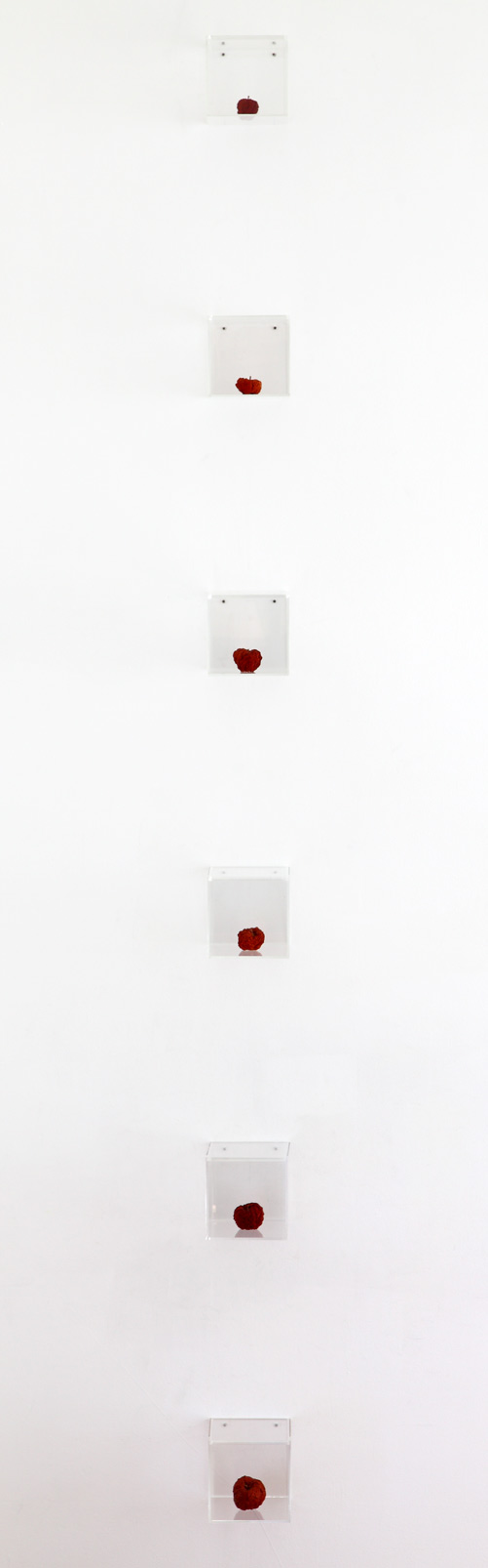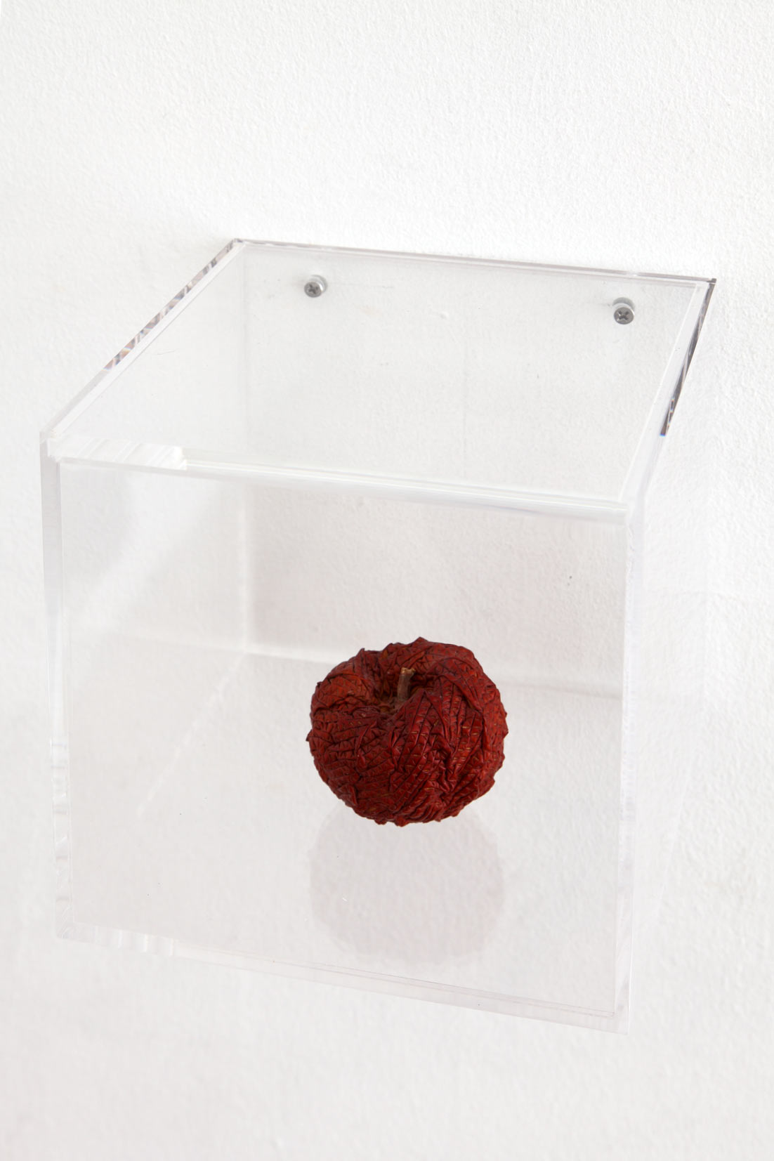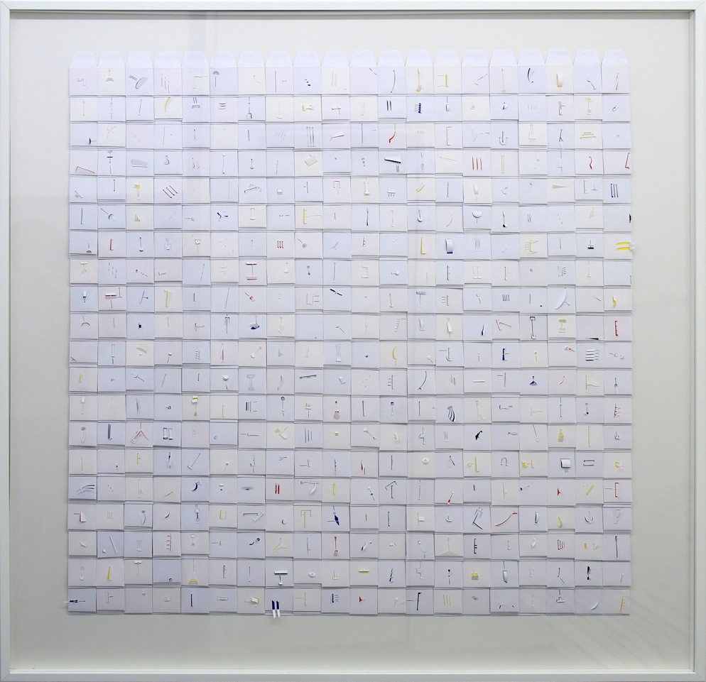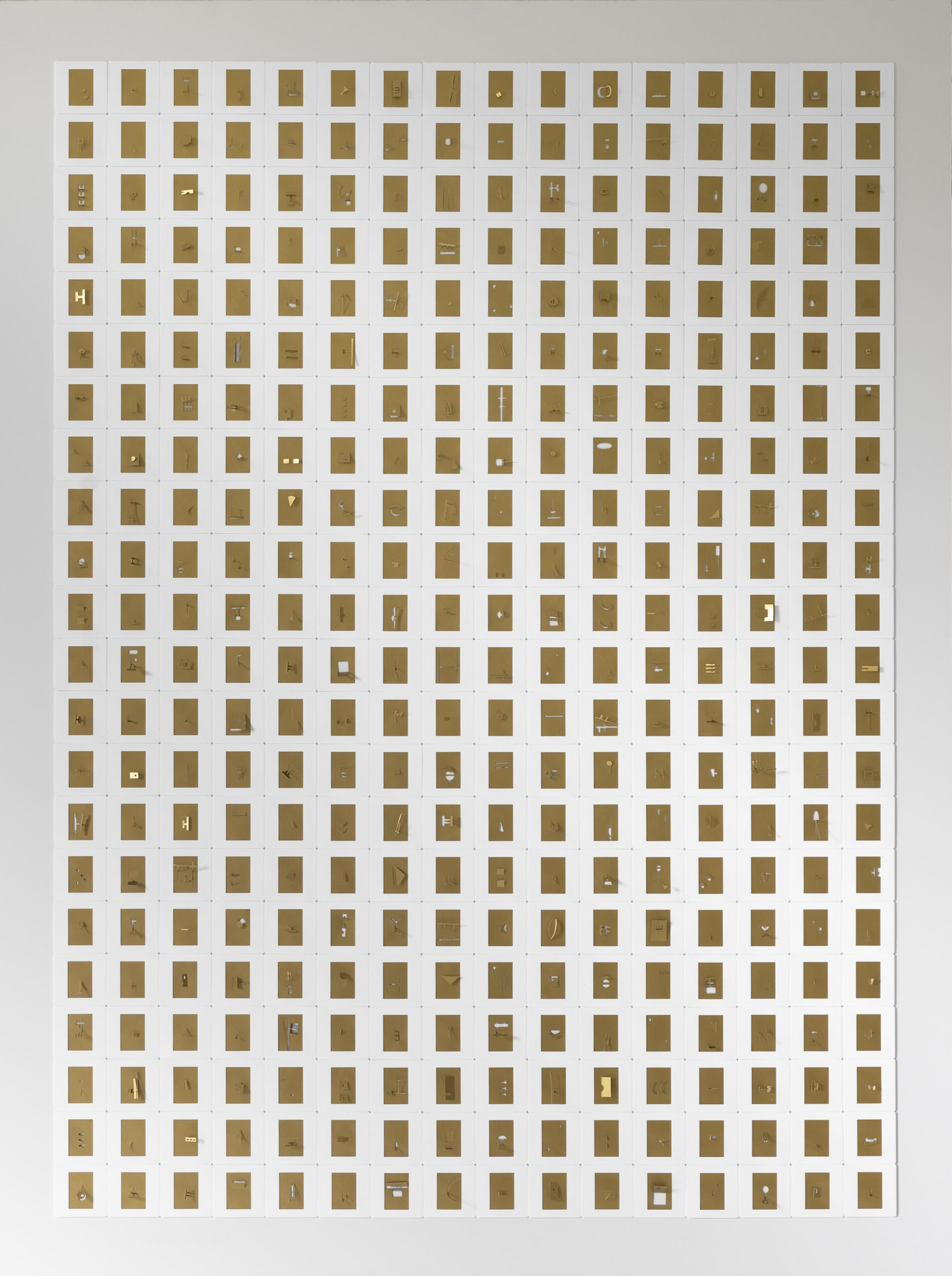 Through his use of simple materials manufactured for everyone’s use (such as sheets of paper, aluminum, apples, or even envelopes), the artist unfurls a topographic map of details linked to everyday life, privileging the micro over the macro, and urges us to come closer to his meticulous objects.