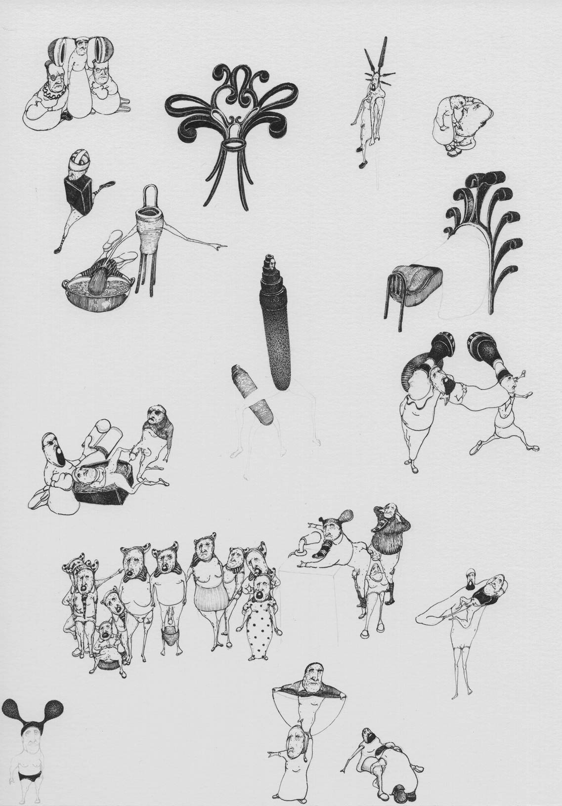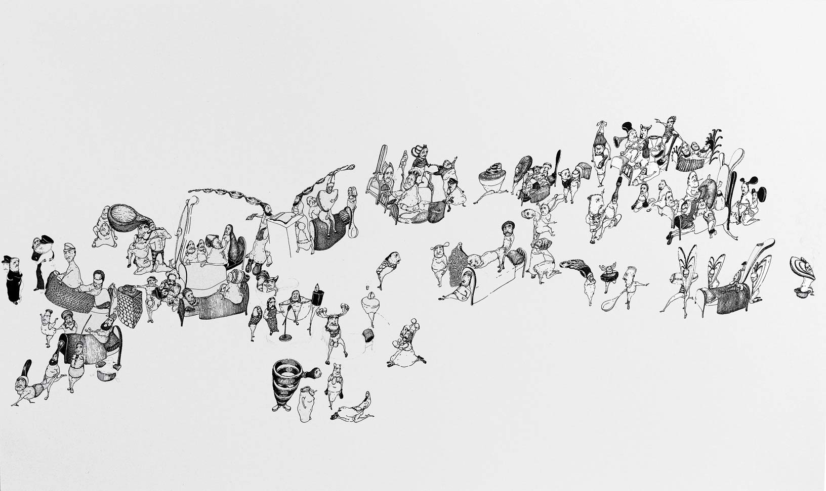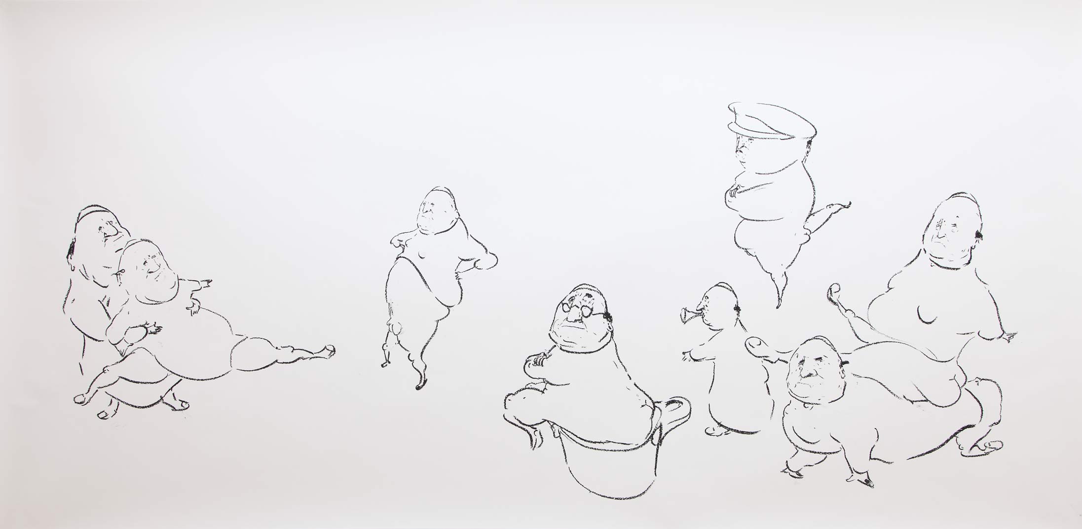 In Ricardo Lanzarini’s drawings Nietzsche, religious leaders, “picassos”, priests, artworks, museums, prisoners, Karl Marx and hospitals appear wrapped in his universe conforming raw metaphors about power. Brotherhoods and herds of males designing the world’s politics and relations, building what is called ‘the system’. His compositions end up being deliriant constructions full of humor in their pathos. In Lanzarini’s works the historic and autobiographic coordinates come together. Each drawing encloses a certain tension produced by the existential drama and the absurd of the situations described by those characters who are alone in the sheet of paper. They’re performing actions that is uncertain if they are conditioned to carry them out or if they’re doing them by their own will. For moments they seem to be in their intimacy or freed of their social roles but sometimes it seems to be a context that conditions their actions but never comes into scene.