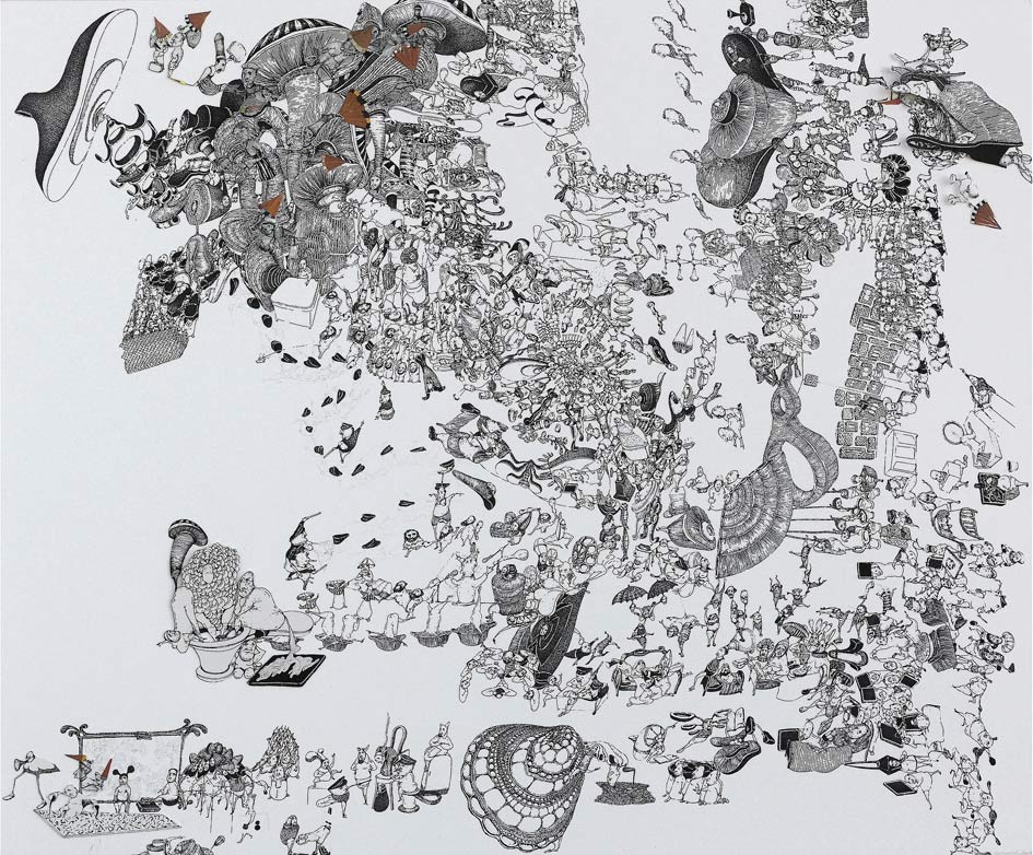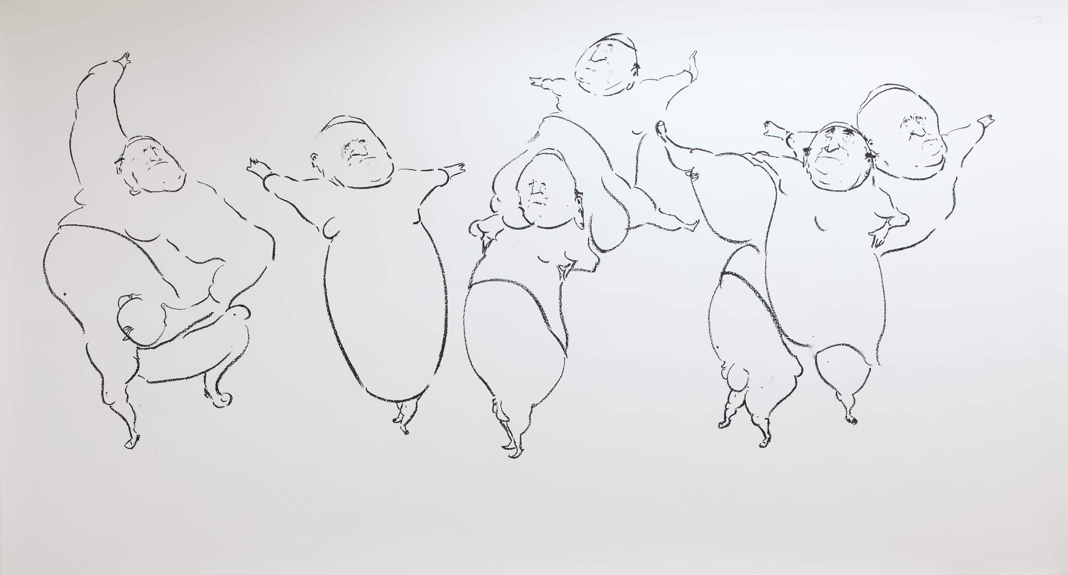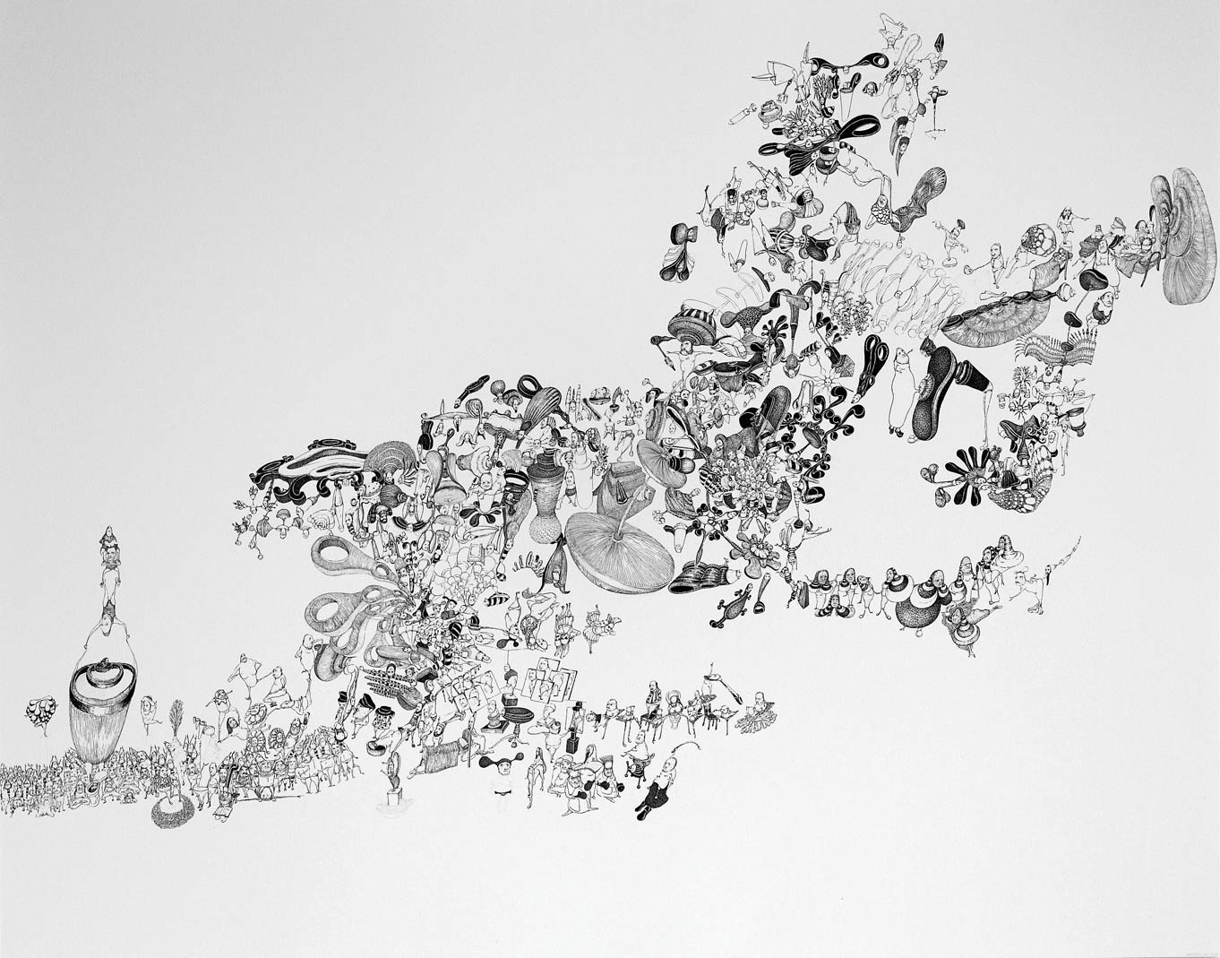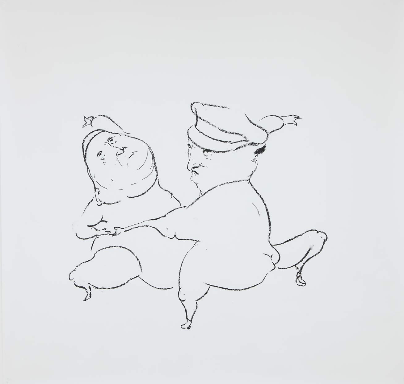 In Ricardo Lanzarini’s drawings Nietzsche, religious leaders, “picassos”, priests, artworks, museums, prisoners, Karl Marx and hospitals appear wrapped in his universe conforming raw metaphors about power. Brotherhoods and herds of males designing the world’s politics and relations, building what is called ‘the system’. His compositions end up being deliriant constructions full of humor in their pathos. In Lanzarini’s works the historic and autobiographic coordinates come together. Each drawing encloses a certain tension produced by the existential drama and the absurd of the situations described by those characters who are alone in the sheet of paper. They’re performing actions that is uncertain if they are conditioned to carry them out or if they’re doing them by their own will. For moments they seem to be in their intimacy or freed of their social roles but sometimes it seems to be a context that conditions their actions but never comes into scene.