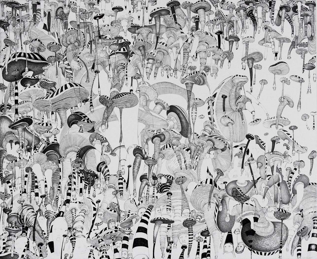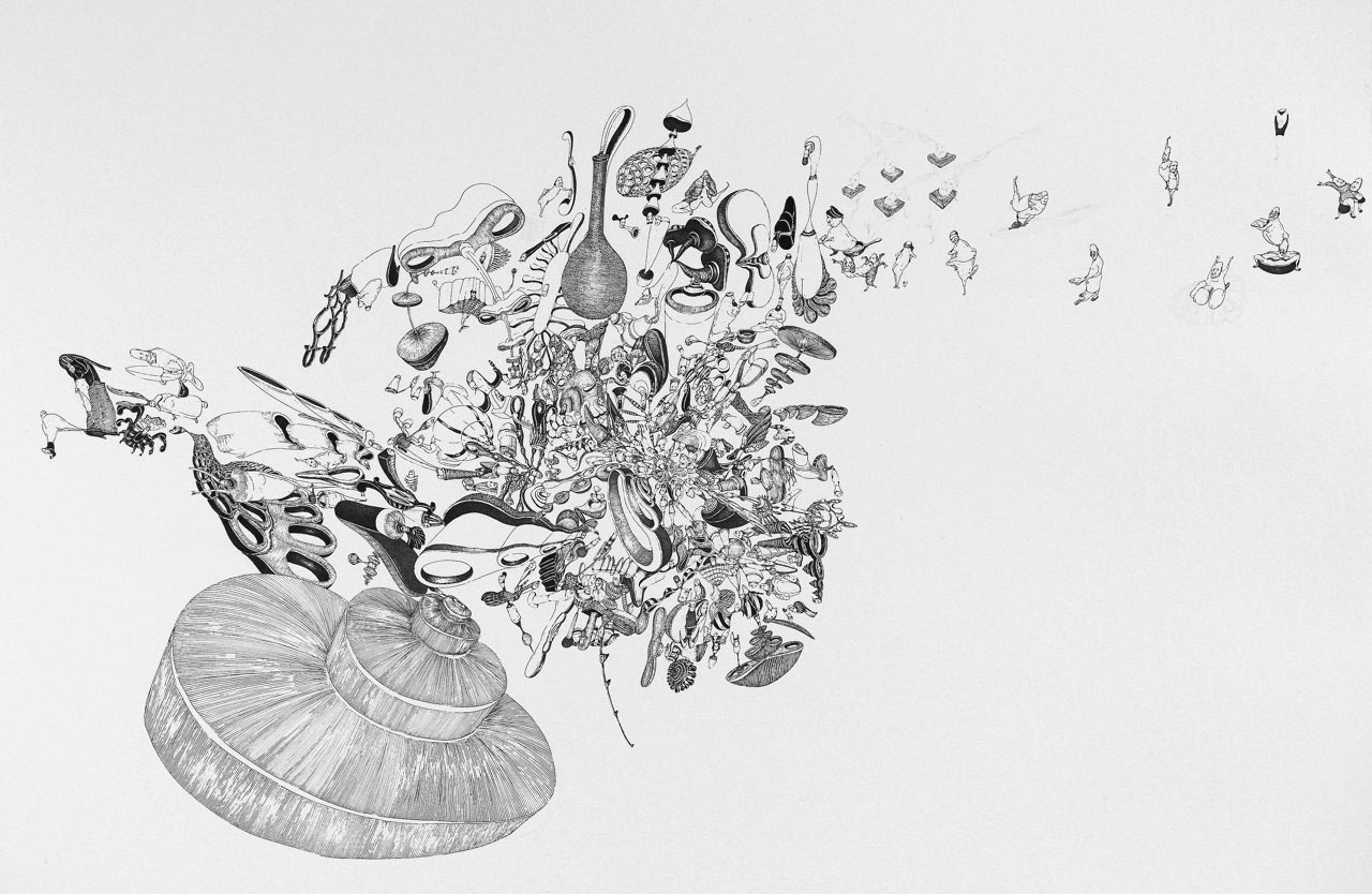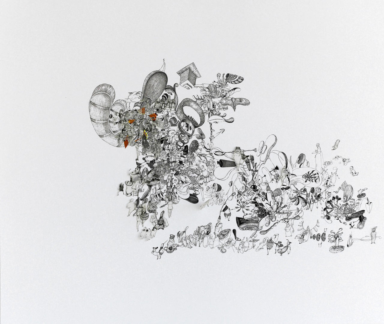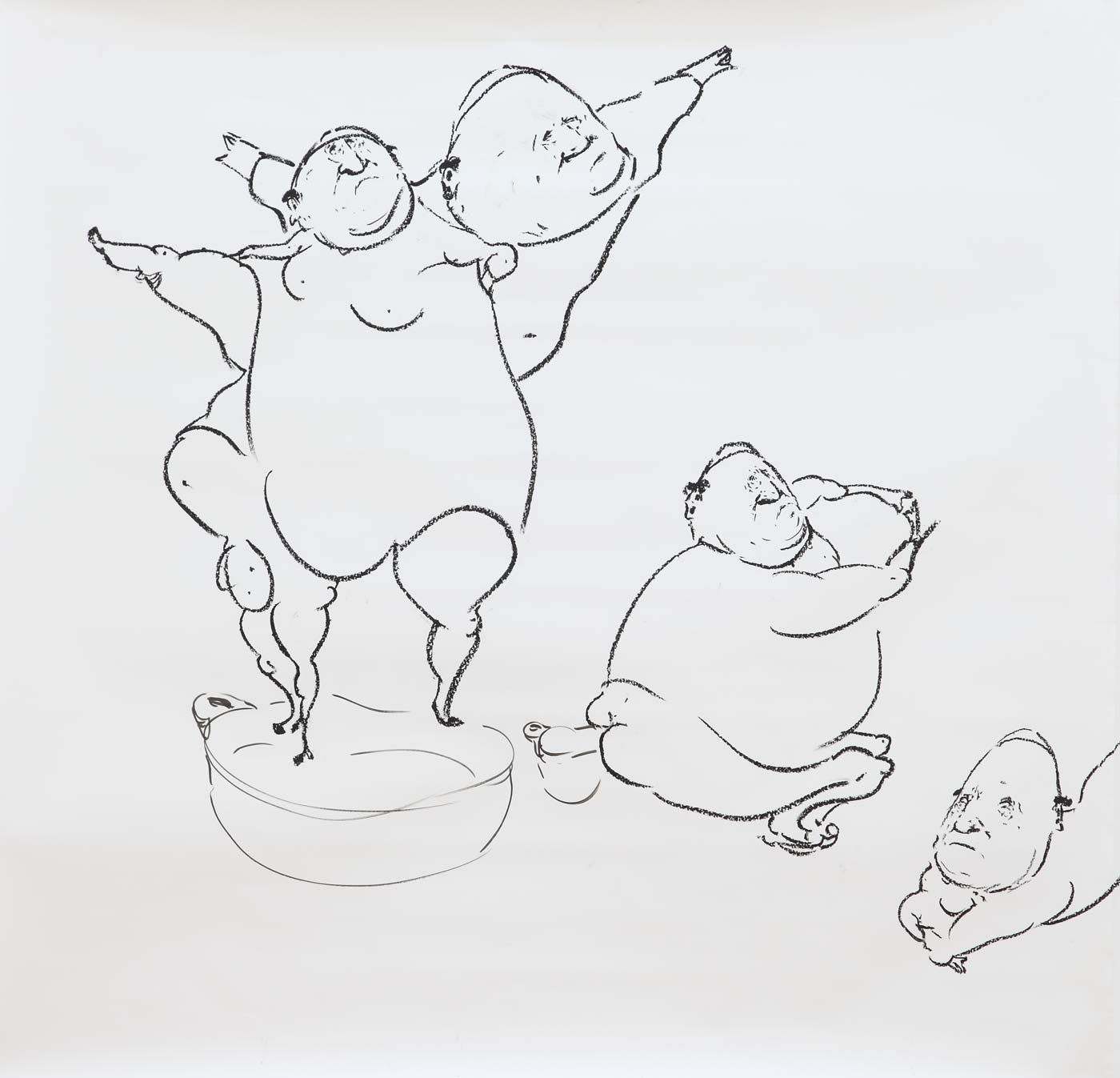 In Ricardo Lanzarini’s drawings Nietzsche, religious leaders, “picassos”, priests, artworks, museums, prisoners, Karl Marx and hospitals appear wrapped in his universe conforming raw metaphors about power. Brotherhoods and herds of males designing the world’s politics and relations, building what is called ‘the system’. His compositions end up being deliriant constructions full of humor in their pathos. In Lanzarini’s works the historic and autobiographic coordinates come together. Each drawing encloses a certain tension produced by the existential drama and the absurd of the situations described by those characters who are alone in the sheet of paper. They’re performing actions that is uncertain if they are conditioned to carry them out or if they’re doing them by their own will. For moments they seem to be in their intimacy or freed of their social roles but sometimes it seems to be a context that conditions their actions but never comes into scene.