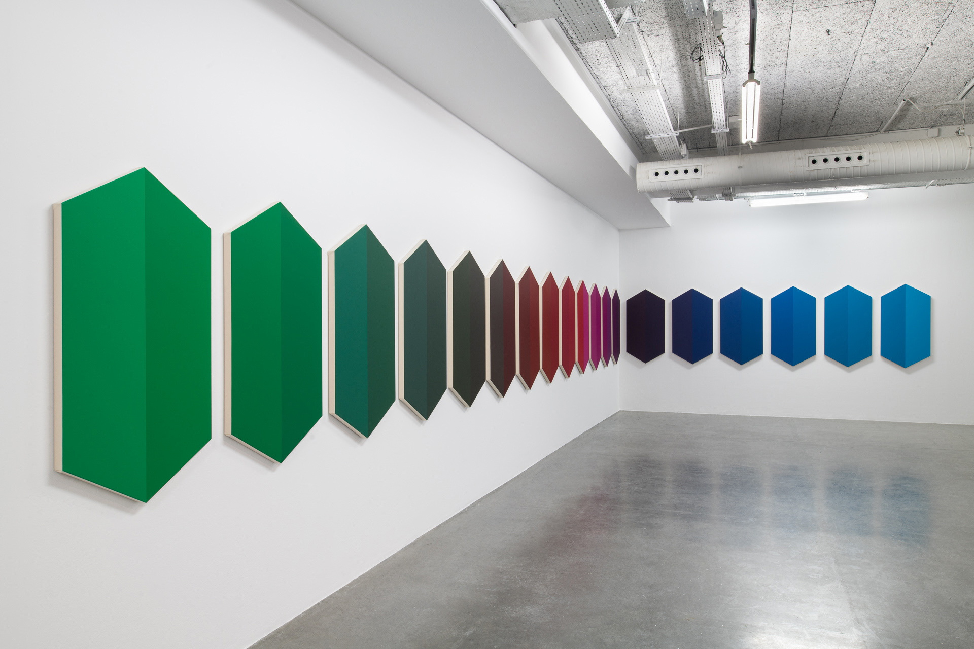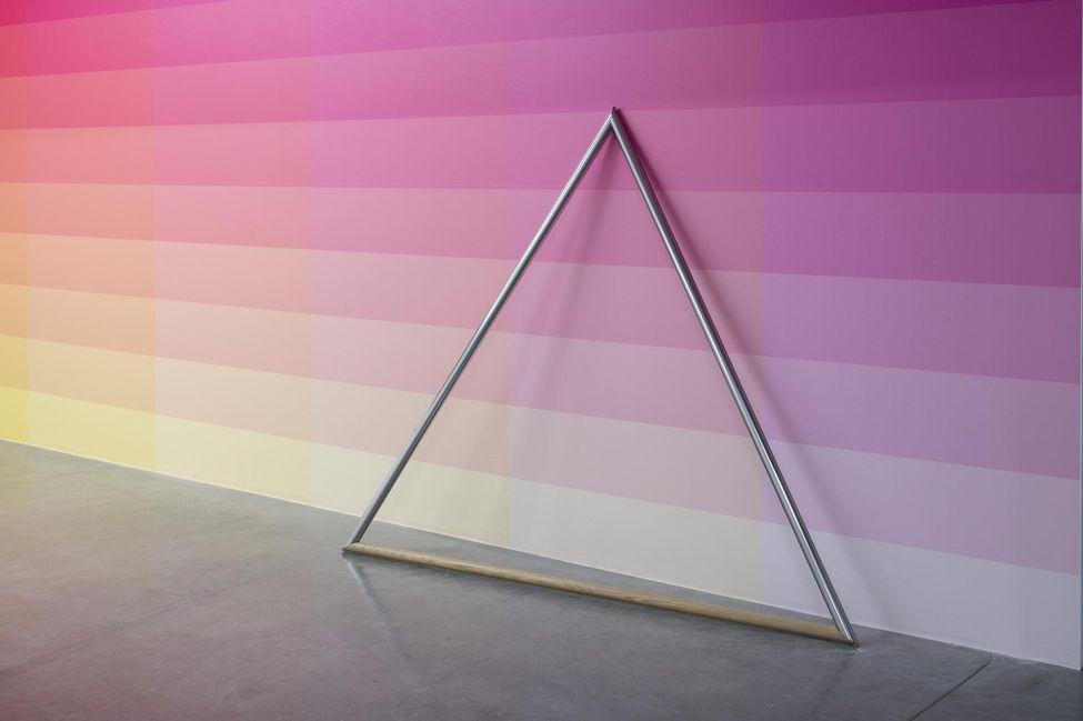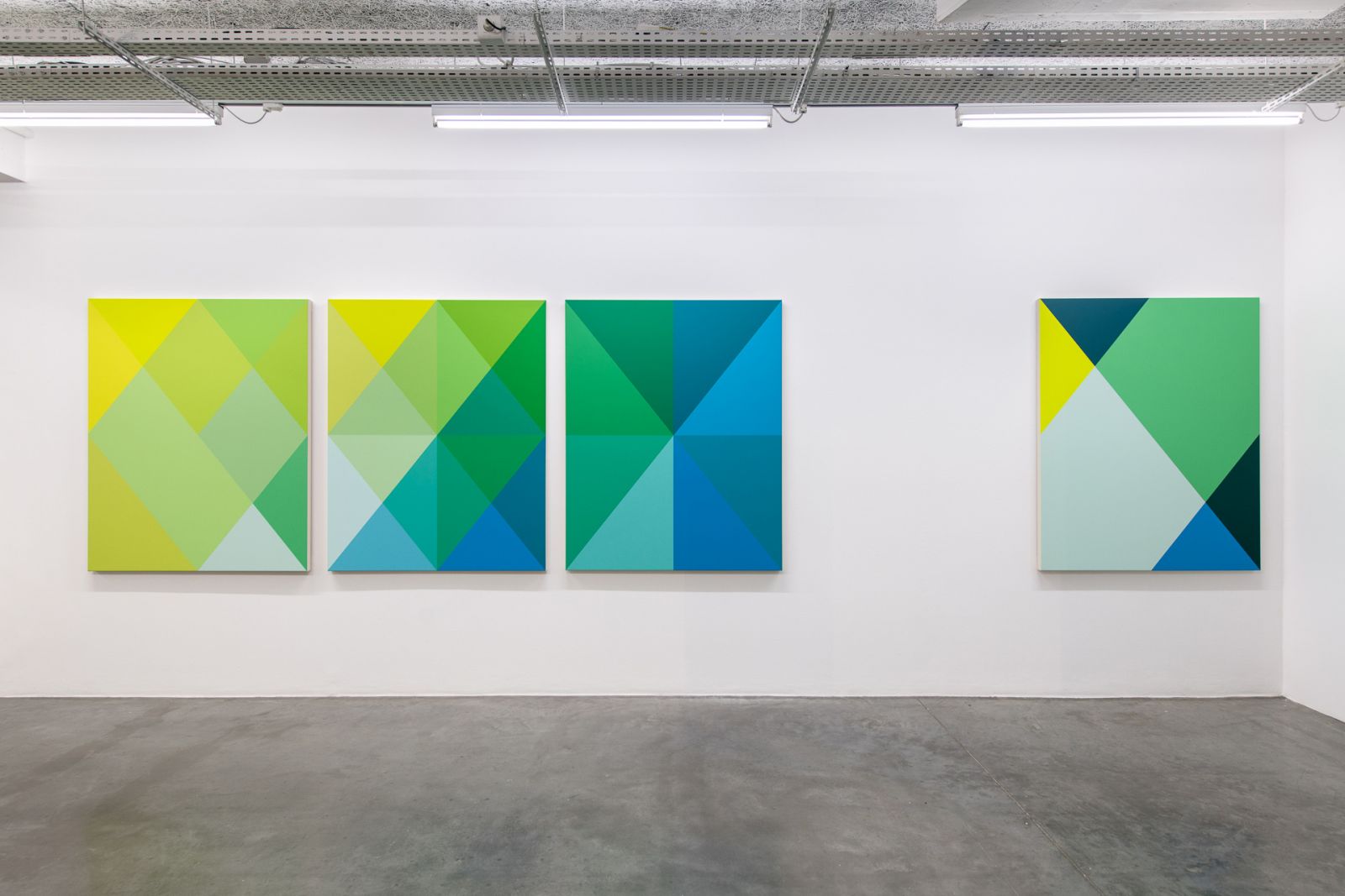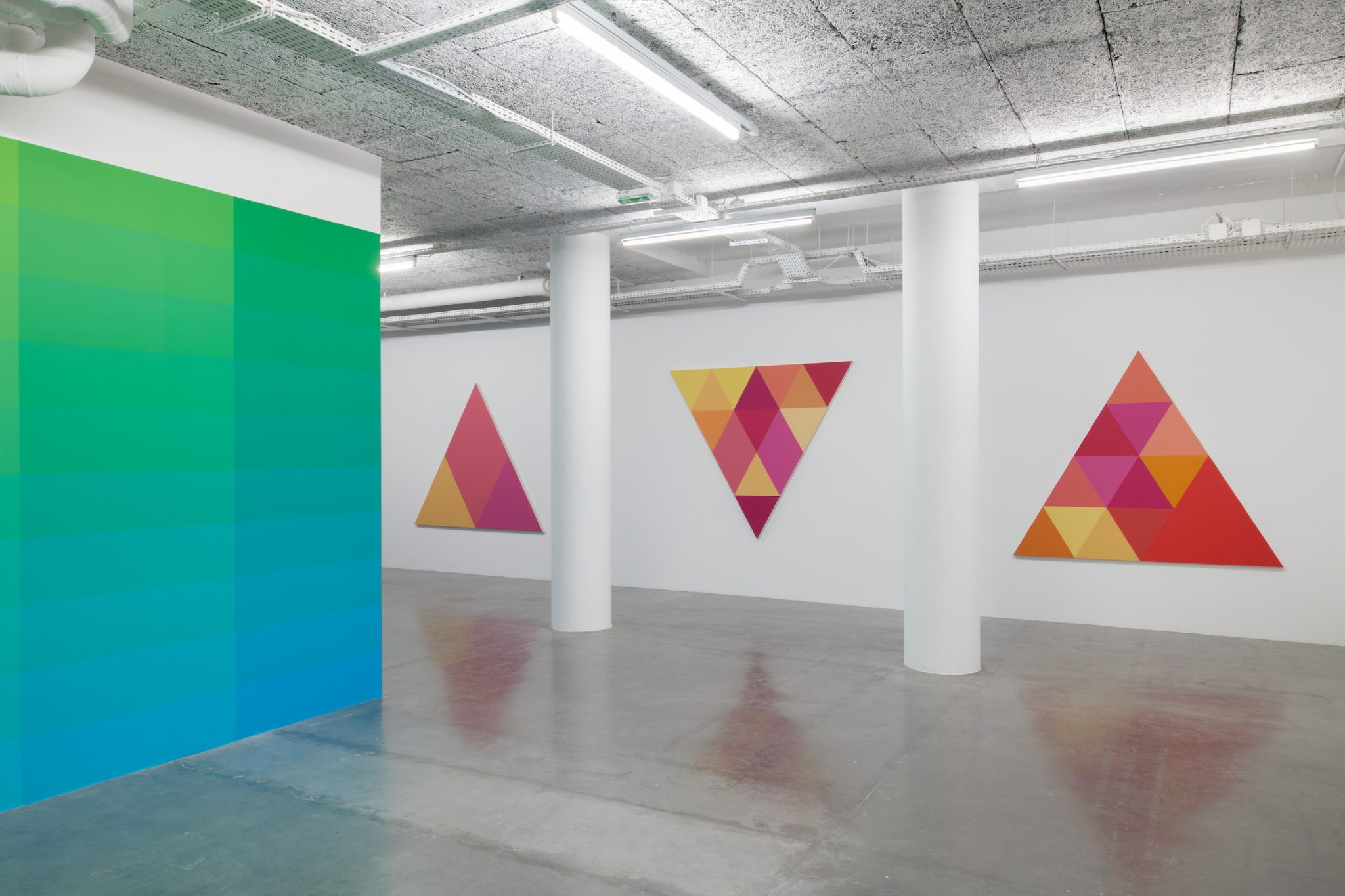 Stéphane Dafflon’s paintings are simple at first glance, strangely smooth, however perfectly mastered. Made of geometric and abstract shapes with sharp contours and primary colors, his artworks question first by their effective sobriety. Then, when getting closer, shapes blur, some angles become round and some points progressively unravel. Stéphane Dafflon distorts the line, shifts the alignment, granting a vibratory power to his canvases, which resonates within the space where it is situated. First created with a computer, Stéphane Dafflon’s artworks, when transcribed onto a canvas or a wall, reveal themselves in their environment. Therefore, Stéphane Dafflon’s work needs to be felt, heard; it is a real-life experience. The many physical sensations that the artist wishes to provoke on the spectator in the way, for instance, of music and its vibrations by which he is inspired. As a mather of fact, the Swiss artist intermixes a lot of different influences. From the concrete art and the minimalism in the shapes and the colors, including graphic design in the computer-aided process of creation, its paintings could be considered as well as “design painted” as of monochrome.