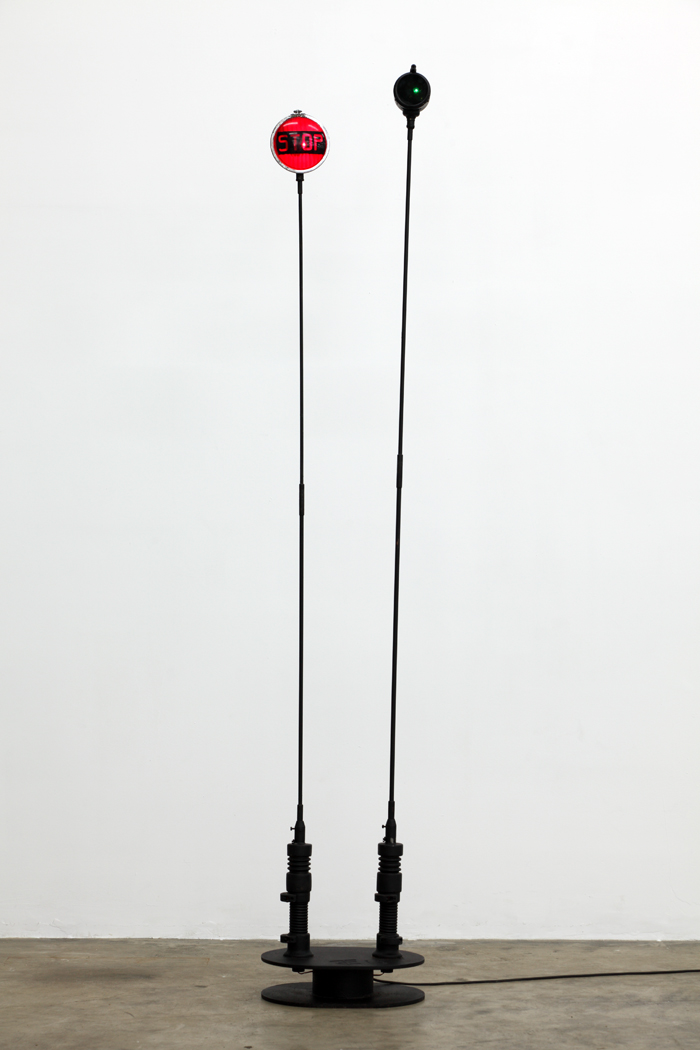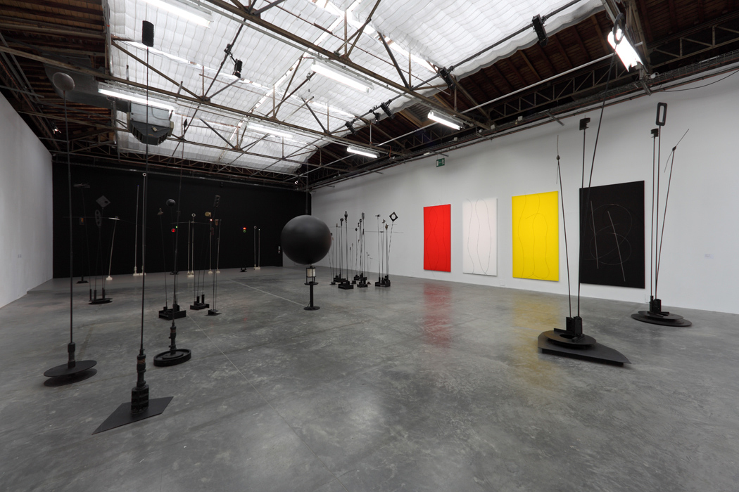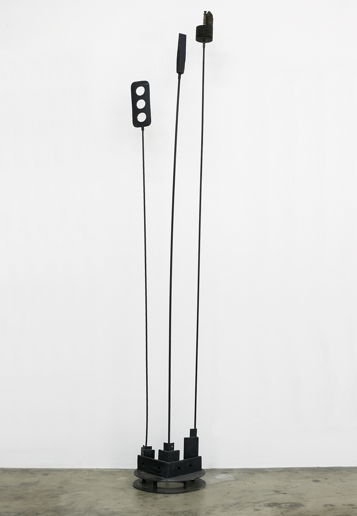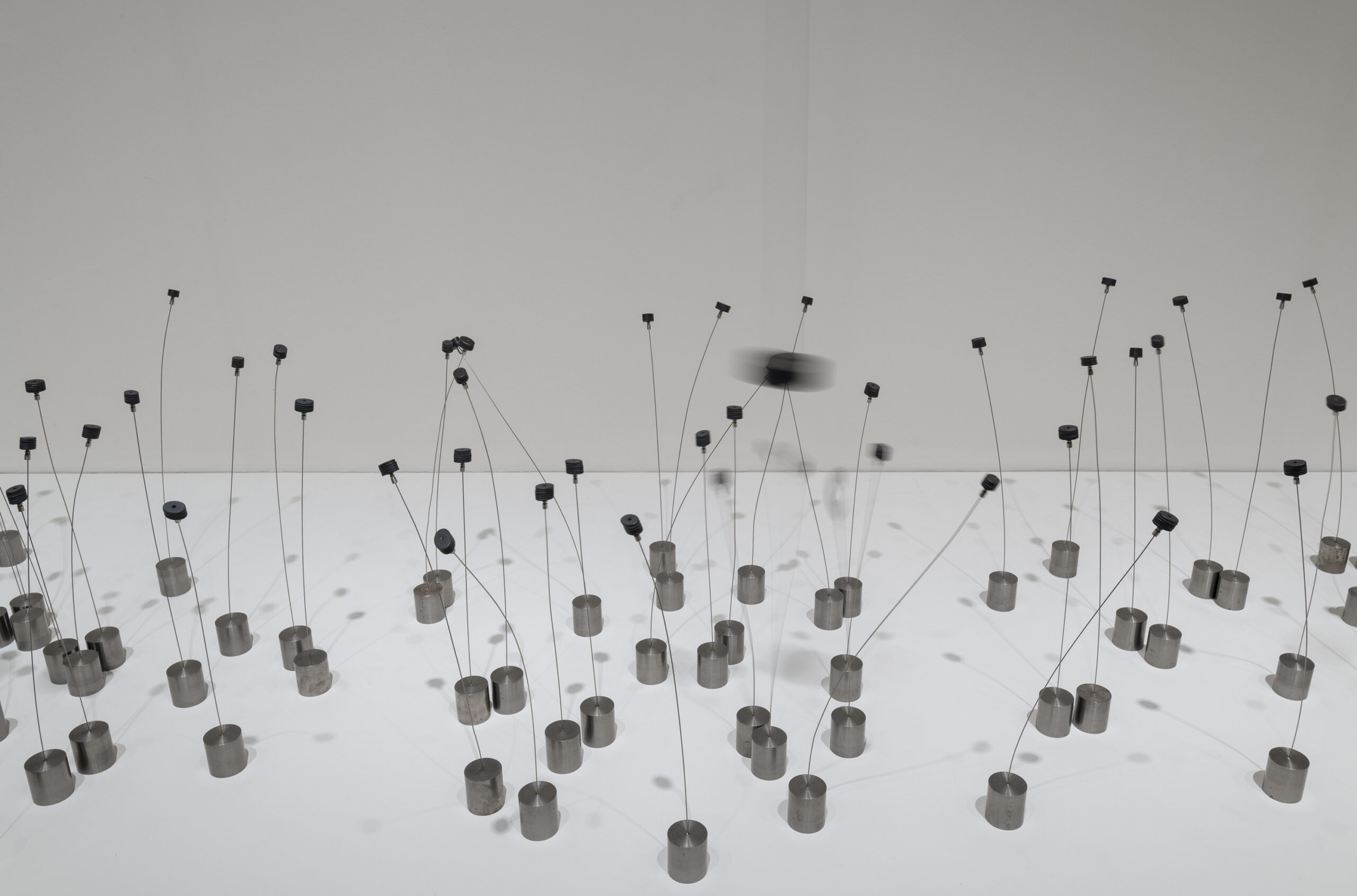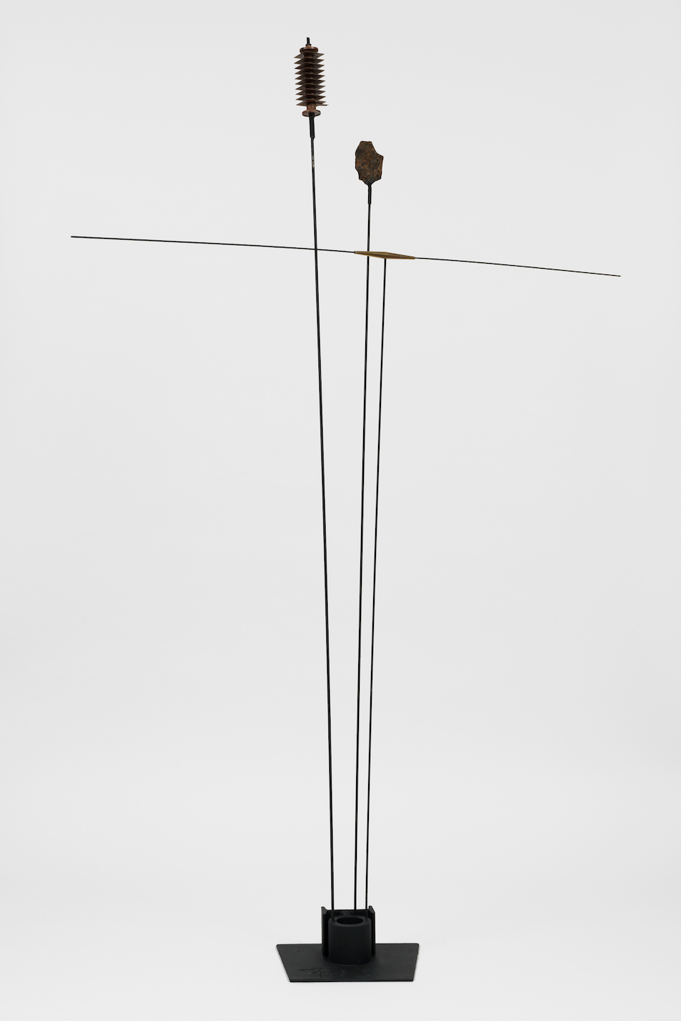 A major figure in the post-war European artistic scene, Takis explored invisible forces and the omnipresence of energy in all things. The energy of magnetic fields is one of the foundations of his work, from the very beginning of his artistic experiments. From the end of the 1950s, Takis invented tele-magnetic sculptures, where everyday metallic objects defy gravity with the help of magnets, and float in space. An “intuitive savant”, Takis uses physical laws and technology in order to escape weightiness and “introduce a new, continuous, living force to sculpture”. Whilst Takis is considered to be one of the rare innovators in sculpture today, alongside Calder, Brancusi and Giacometti, the liberation of the forces of nature prevails over esthetic form in his work. Takis’ pieces, made up of industrial or mechanical parts, are situated at the crossroads between art, technology and science.