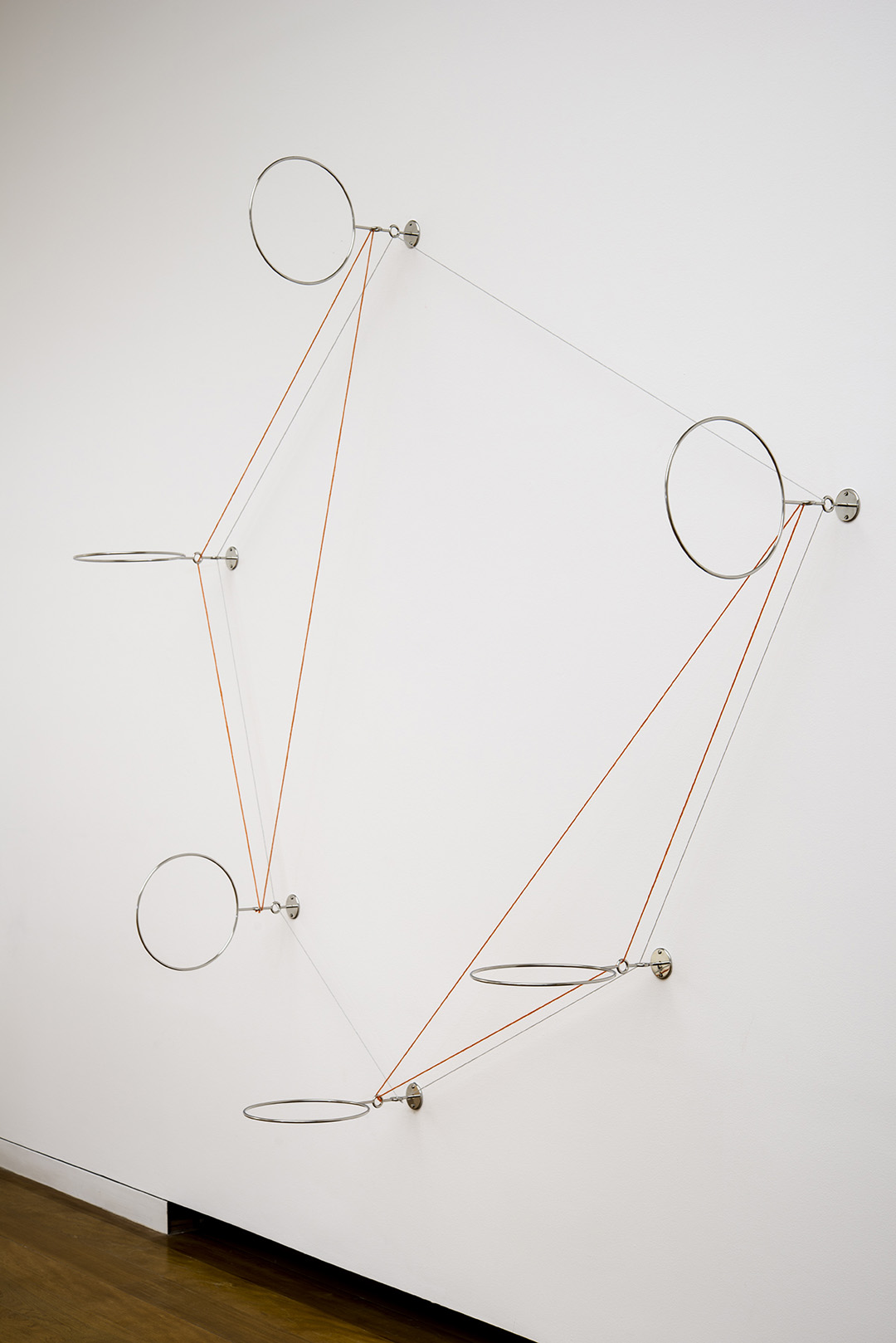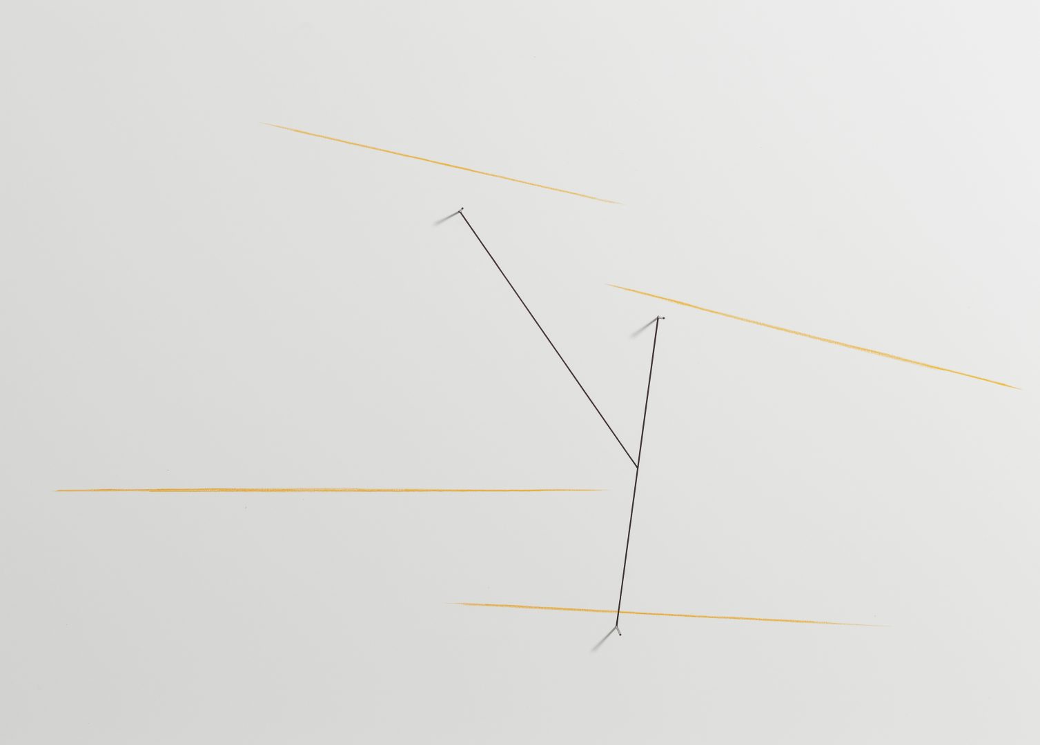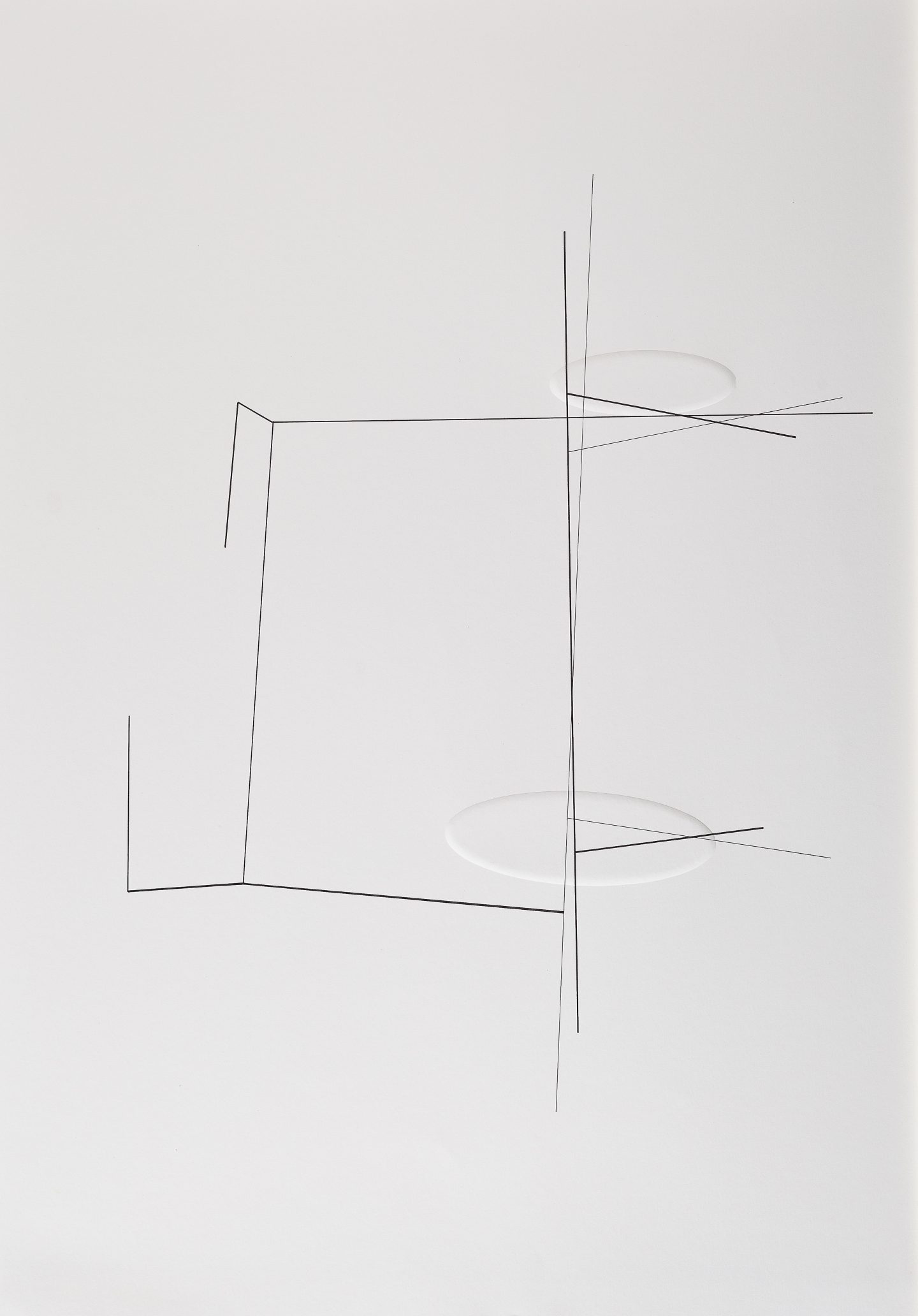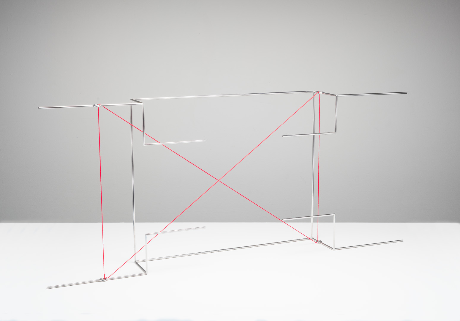 Caldas pushes the paradox between presence and absence, and between transparency and opacity, to its extreme. This paradox is reinforced through a play on mirrors, a recurrent technique in his work. Here again, the artist develops the idea of reflection without actually employing mirrors. In creating several planes where lines and objects replace the reflections of one another, the artist reveals a three-dimension mirror and materialises the idea of reflection, a process he considers as a “functional dismantling of the mirror”2. Thus Caldas goes beyond the duality between presence and absence, positive and negative, and manages to reach a paradoxical fusion between a tangible reality and thought.