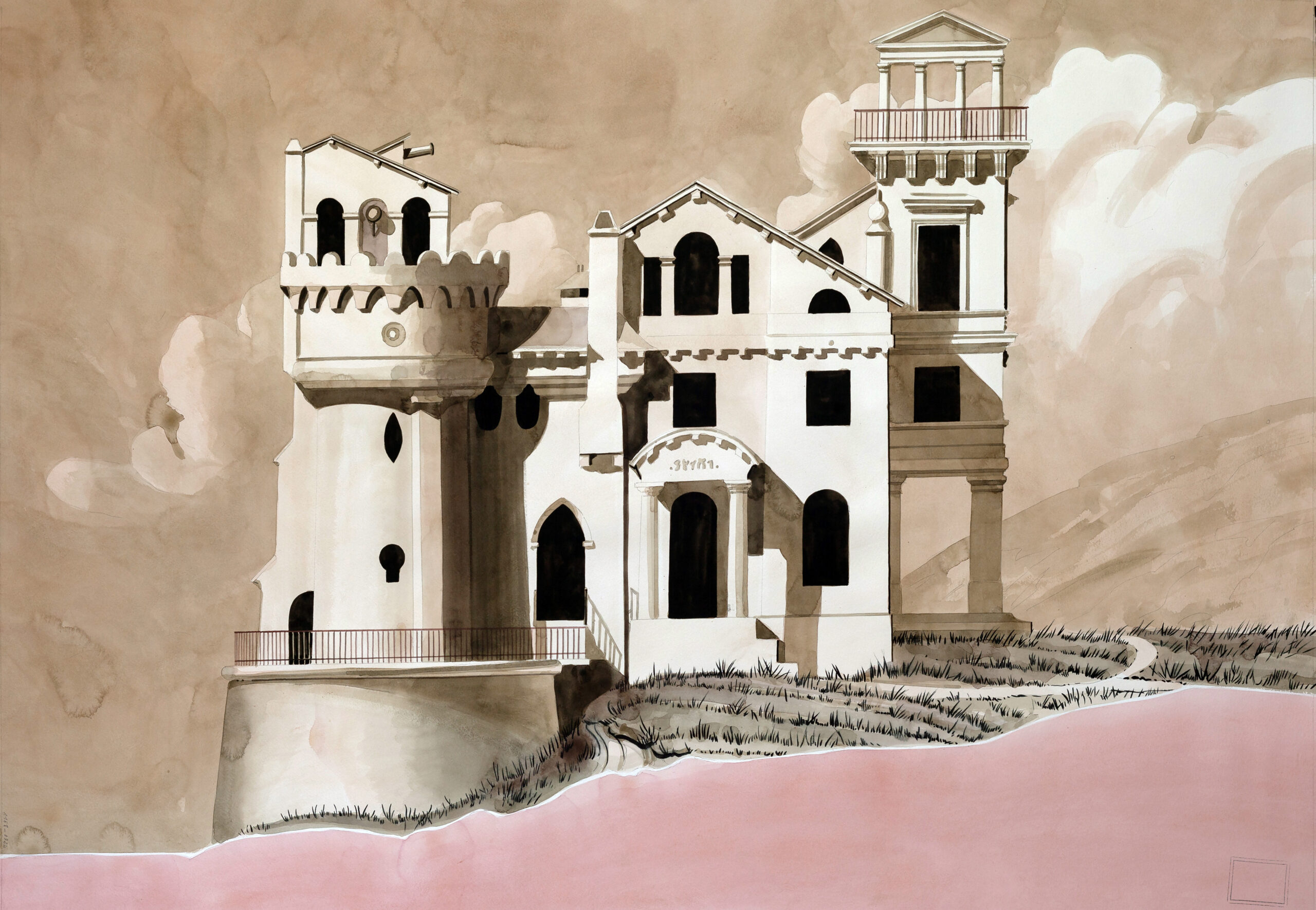 Thus the representation of raw materials (containers, cement, steel, etc.) conflicts with the lightness of the watercolors and undergoes a metamorphosis to create the singular nature of his compositions. The massive lines of a container ship or the rusty cylinders of heavy barrels allow him the opportunity not only to free the energy inside these massive objects, but also to give them a voice, without relieving them of their functions. Yvan Salomone shows what speaks, but purifies it, synthesizes it, and transforms it – he leaves the meaning ambiguous, allusive, and open. Yvan Salomone’s landscapes defend reality and claim a poetic dematerialization of it, and impose themselves on the viewer like suspended spaces.
