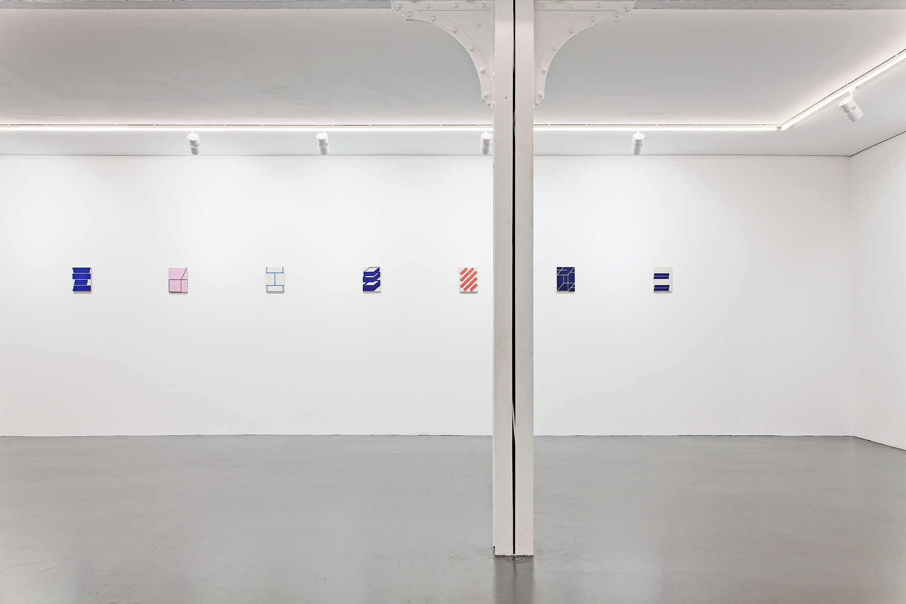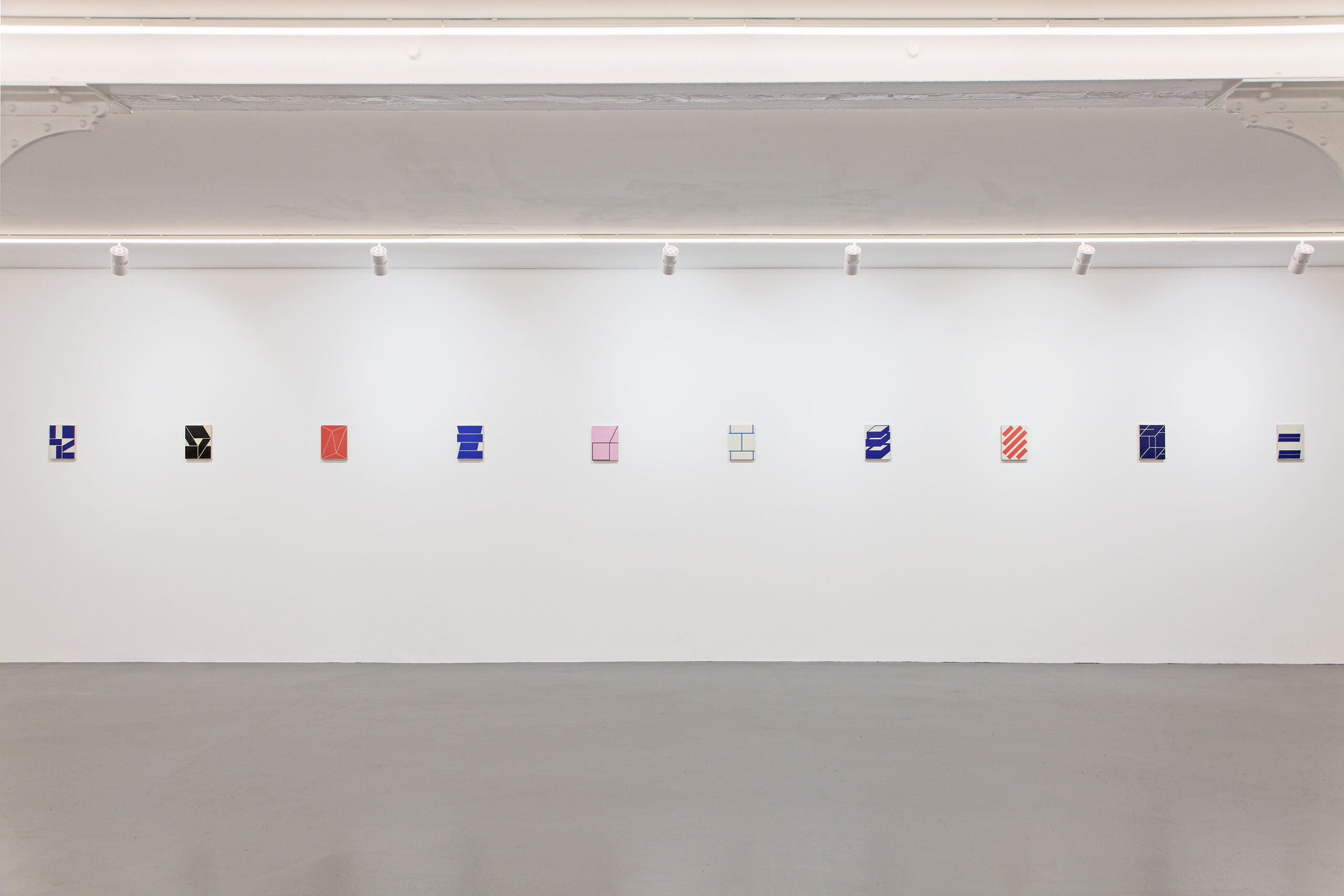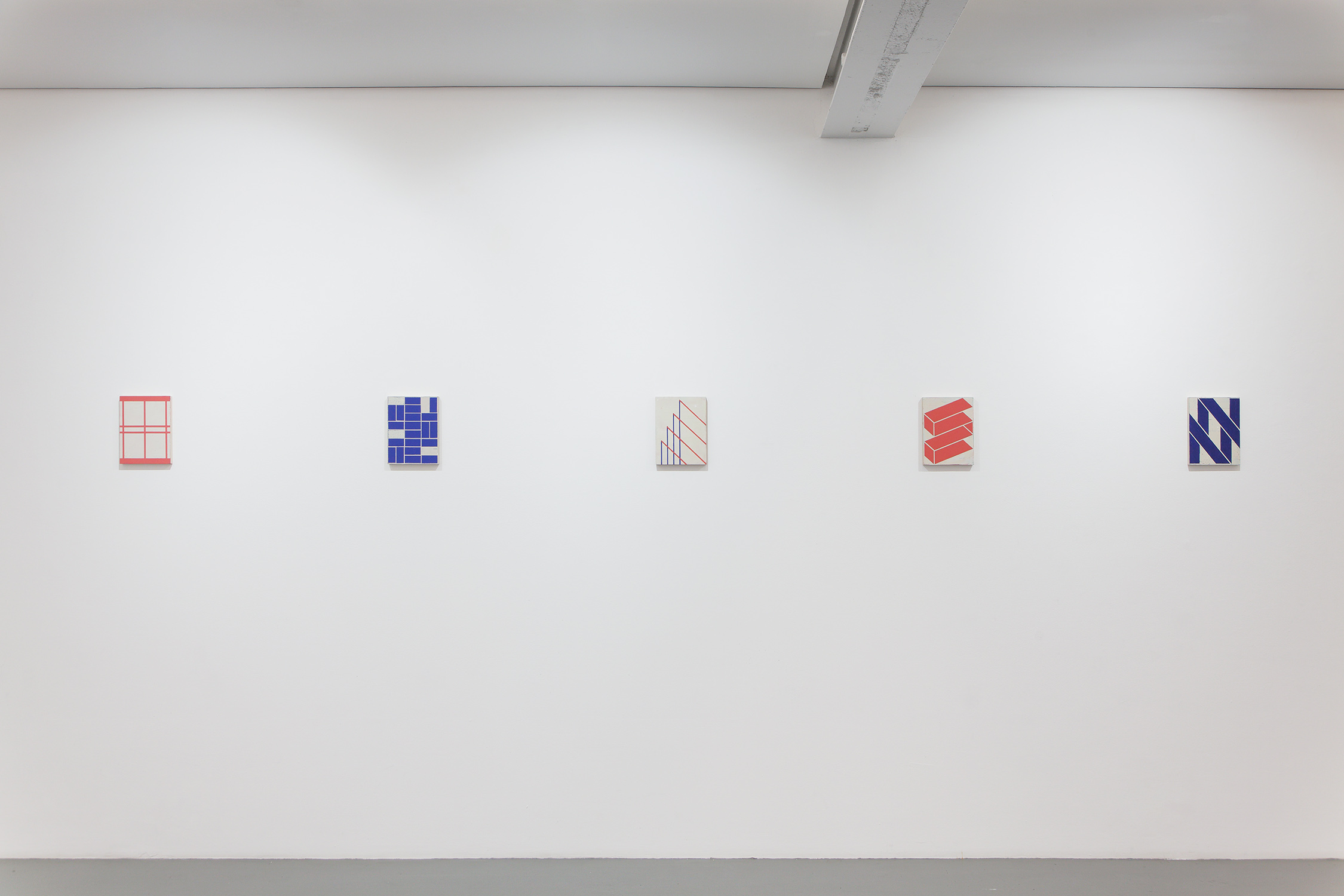 Magenta, the title of the exhibition, refers to the Boulevard de Magenta in Paris, which the artist passes on his way to the gallery. Drawing inspiration from the visual environment of the city, Biltereyst translates familiar elements—such as signage, logos, grids, and markings—into abstract compositions on wooden panels. These components form the basis of a distinctive visual language, articulated through geometric forms and a restrained palette of vivid, primary colors. The exhibition brings together thirty small-format works, presented with careful precision. Each piece stands on its own, yet together they read like a visual record — an alphabet of moments.