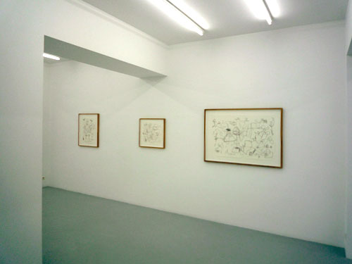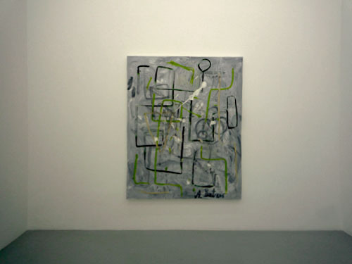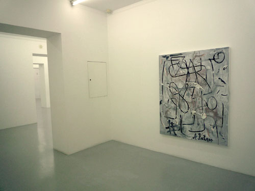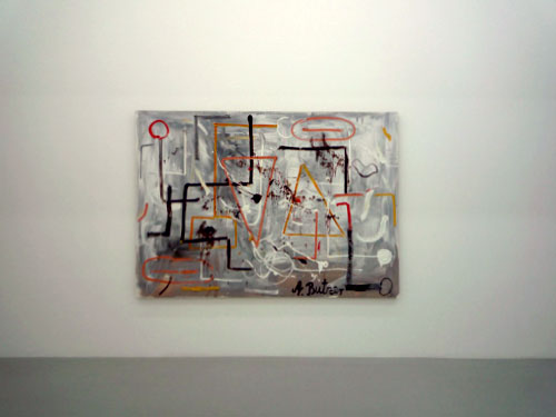 In Butzer’s more abstract works, the figures fade away into the background and the “world” around them darkens as his usual colourful chaos gives way to a grey uniformity interrupted only by sparse lines and geometrical shapes, scratching the surface like skates on ice, without steering a set course but by marking the passage from the figurative to the abstract.