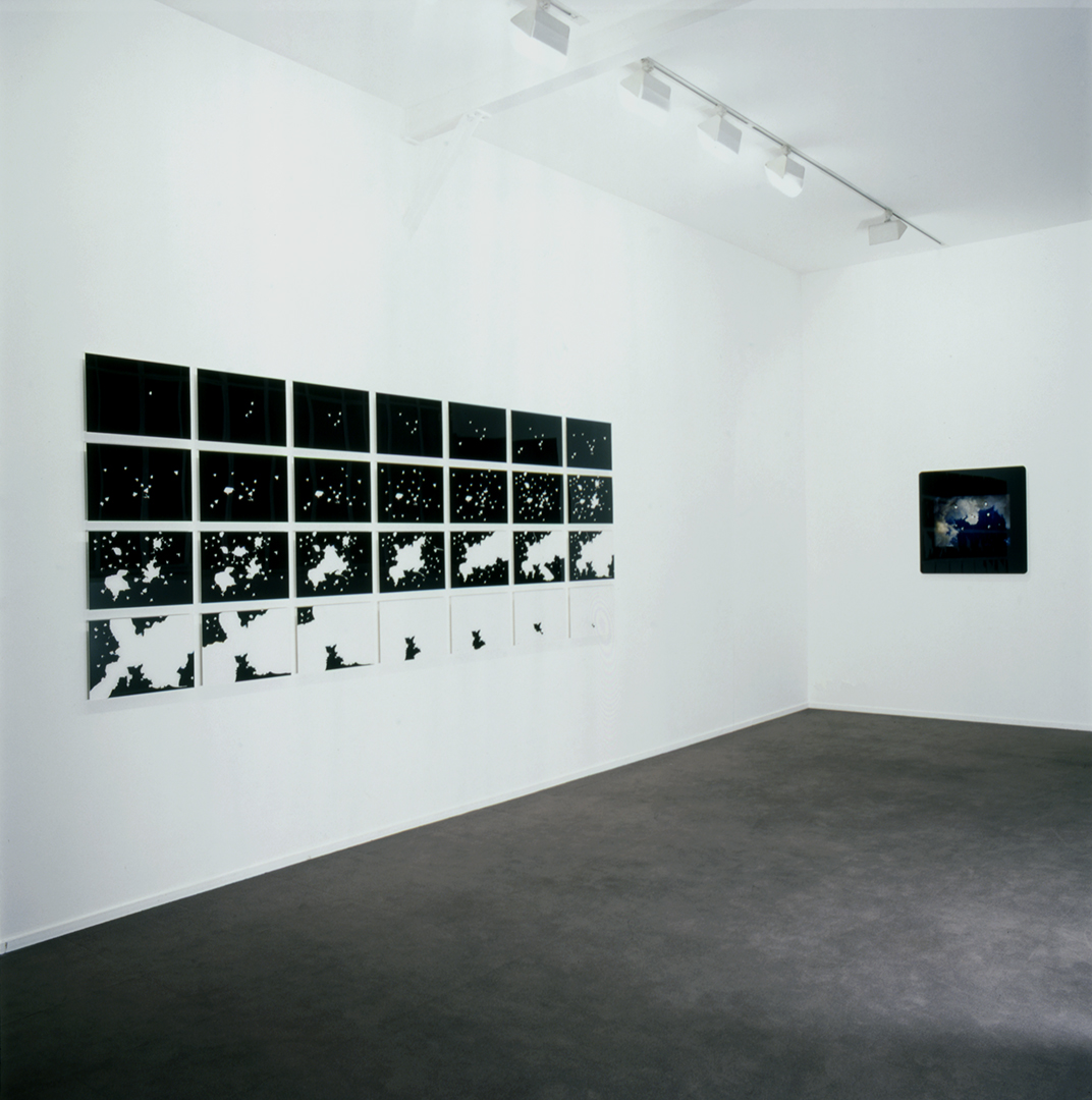 In the work of Anne Deleporte, the appearance of the image is often created through an invention, insofar as one “invents” a treasure, or as one discovers something which is hidden. In her exhibition at Galerie Xippas, Anne Deleporte will present the video Bullets 28 and a series of 28 color photographs entitled Bullets (camera obscura). The latter consists of a series of digital photographs created without a camera. A 35 mm blank – and therefore black – slide is used instead, pierced by a needle. However, contrary to the camera obscura, where the image appears through a hole, the perforations here force the material image to disappear. Alternatively, the punctured film gradually allows for a lit space to appear, eliciting qualities more of drawing than photography. These photographs are the source of the video Bullets 28. Set on a loop, the progression of the image is synced with the noise of detonated firearms. It is the sound which creates the fiction in the work.