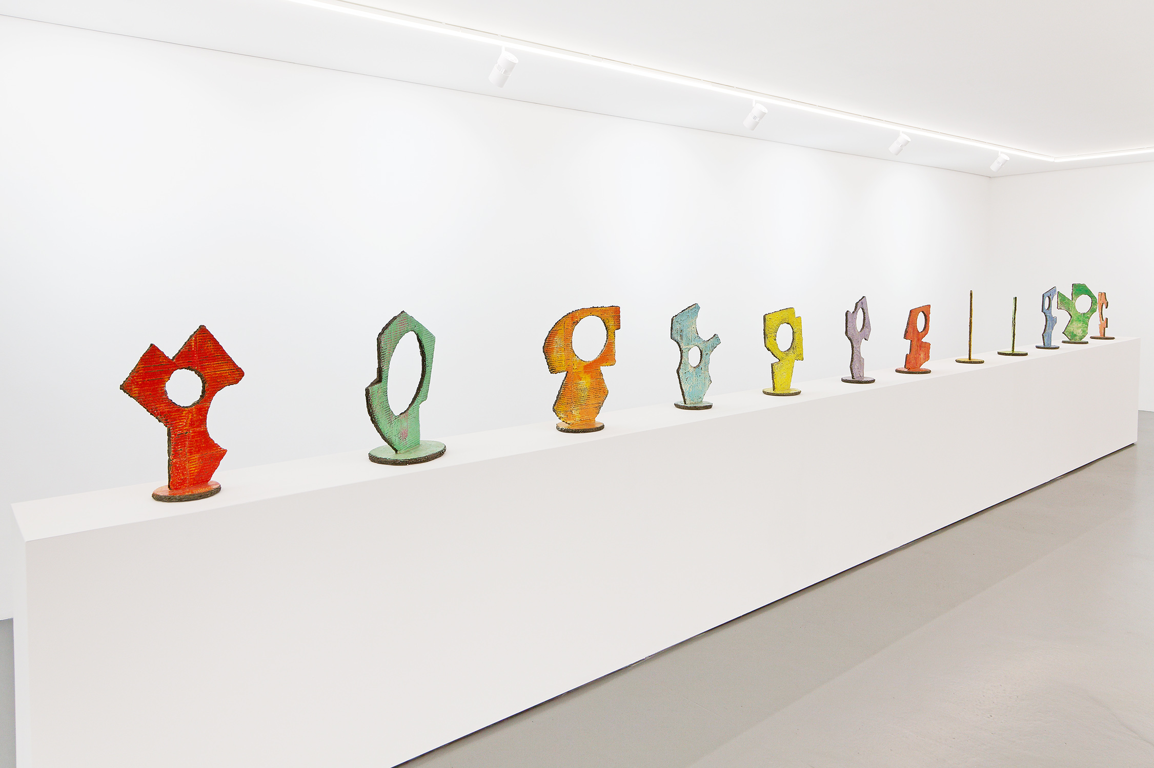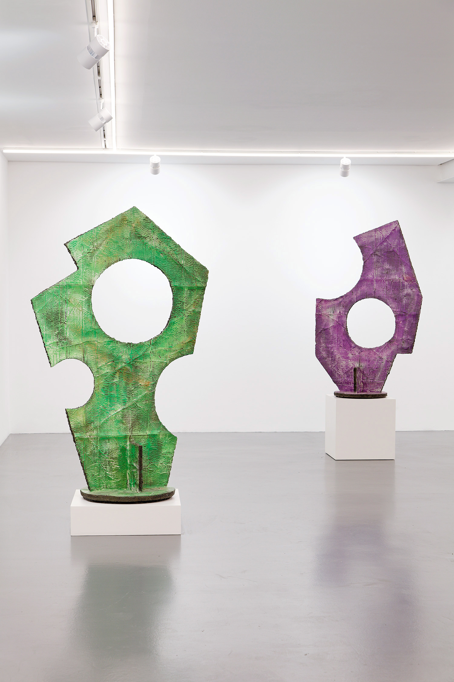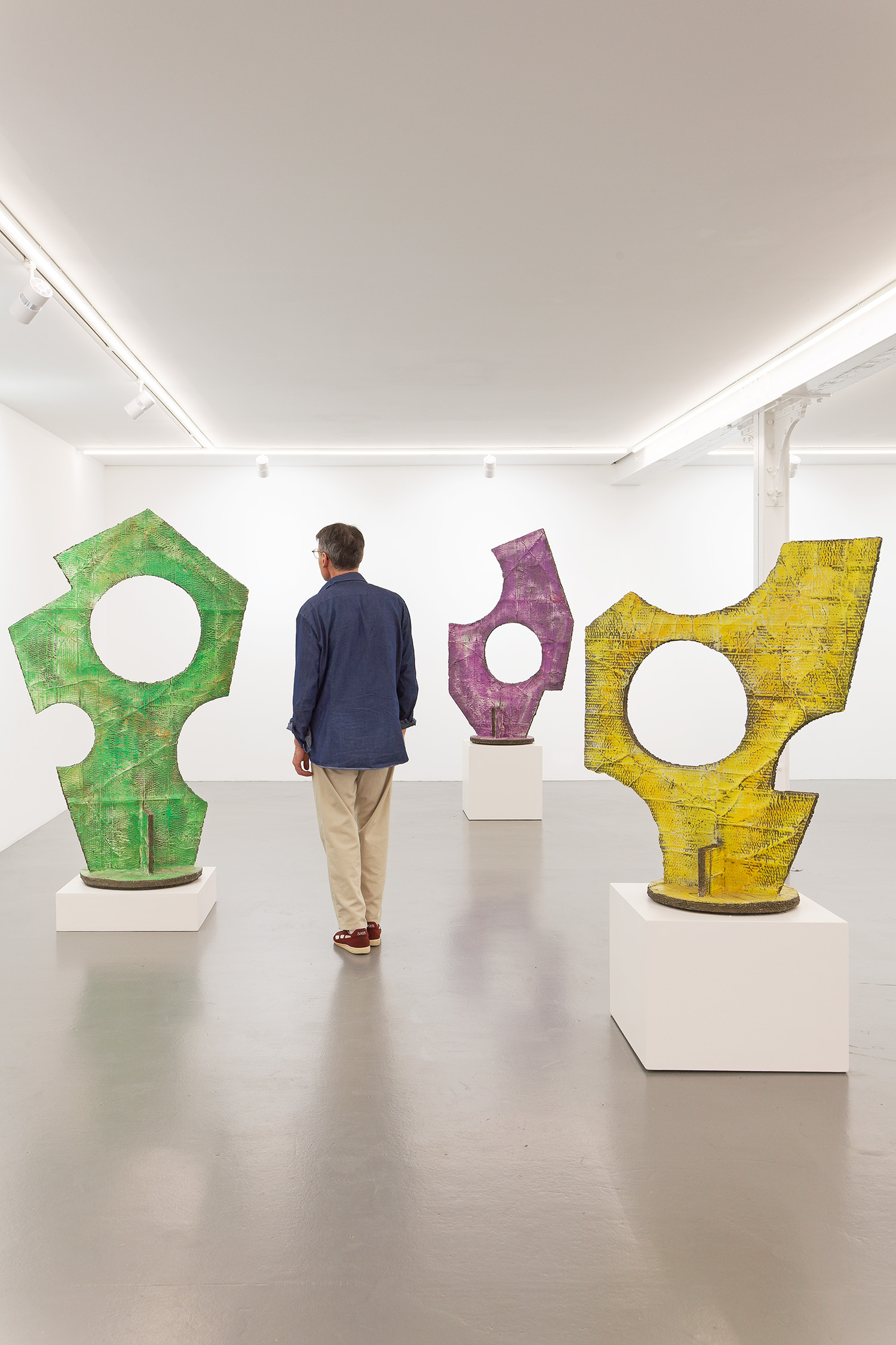 Concrete & Colors, whose title evokes both construction sites and modern painting (Matisse’s cut-outs, for example), presents Home Work, a series of large flat sculptures in painted reinforced concrete, as well as smaller ones, arranged on a pedestal in a layout reminiscent of a forest. They recall Barbara Hepworth’s perforated sculptures, Nancy Holz’s monumental installations, but also Joseph Beuys’ treatment of materials. Despite often playing with a certain formalism, Benjamin Sabatier’s works bear witness to an experience of transformation. The act of making is central to the work, to the extent of evoking self-construction (the kit). The process induces the form: the technique (assembly, moulding, cutting), based on cardboard moulds, enables the paint, which is applied at the end, to reveal the fragility of the piece, whose roughness can be seen on the edges of the sculptures.