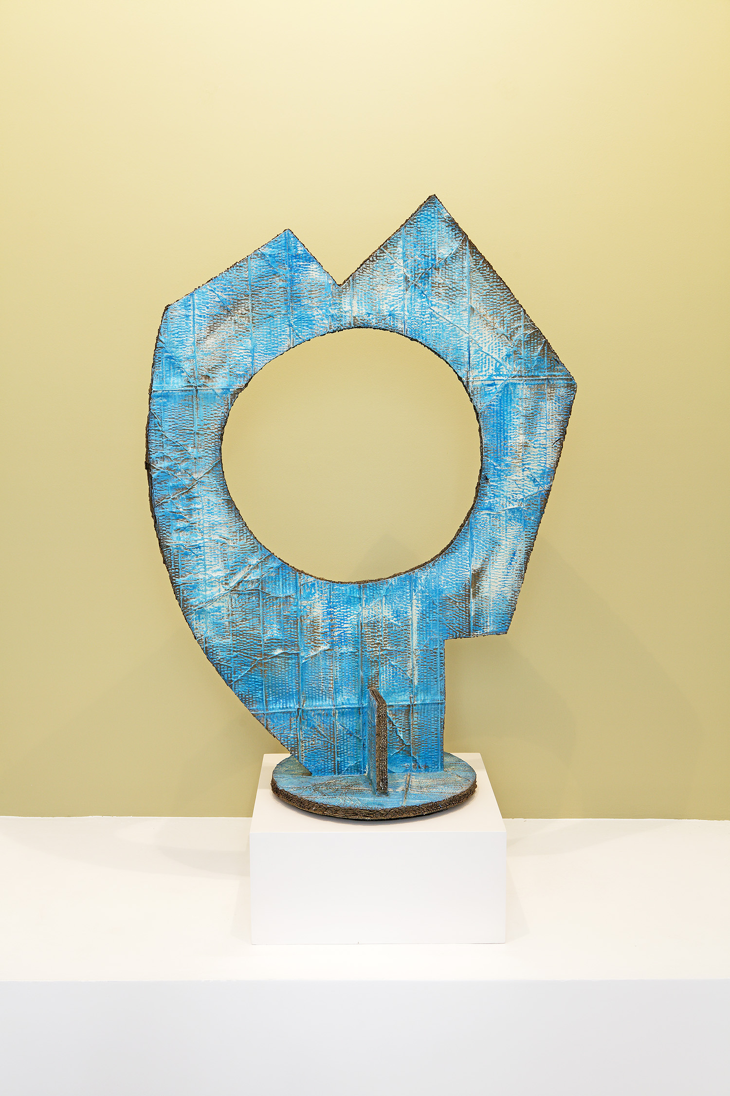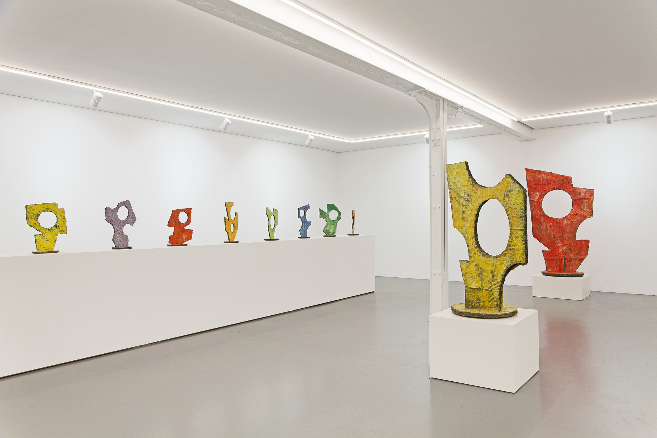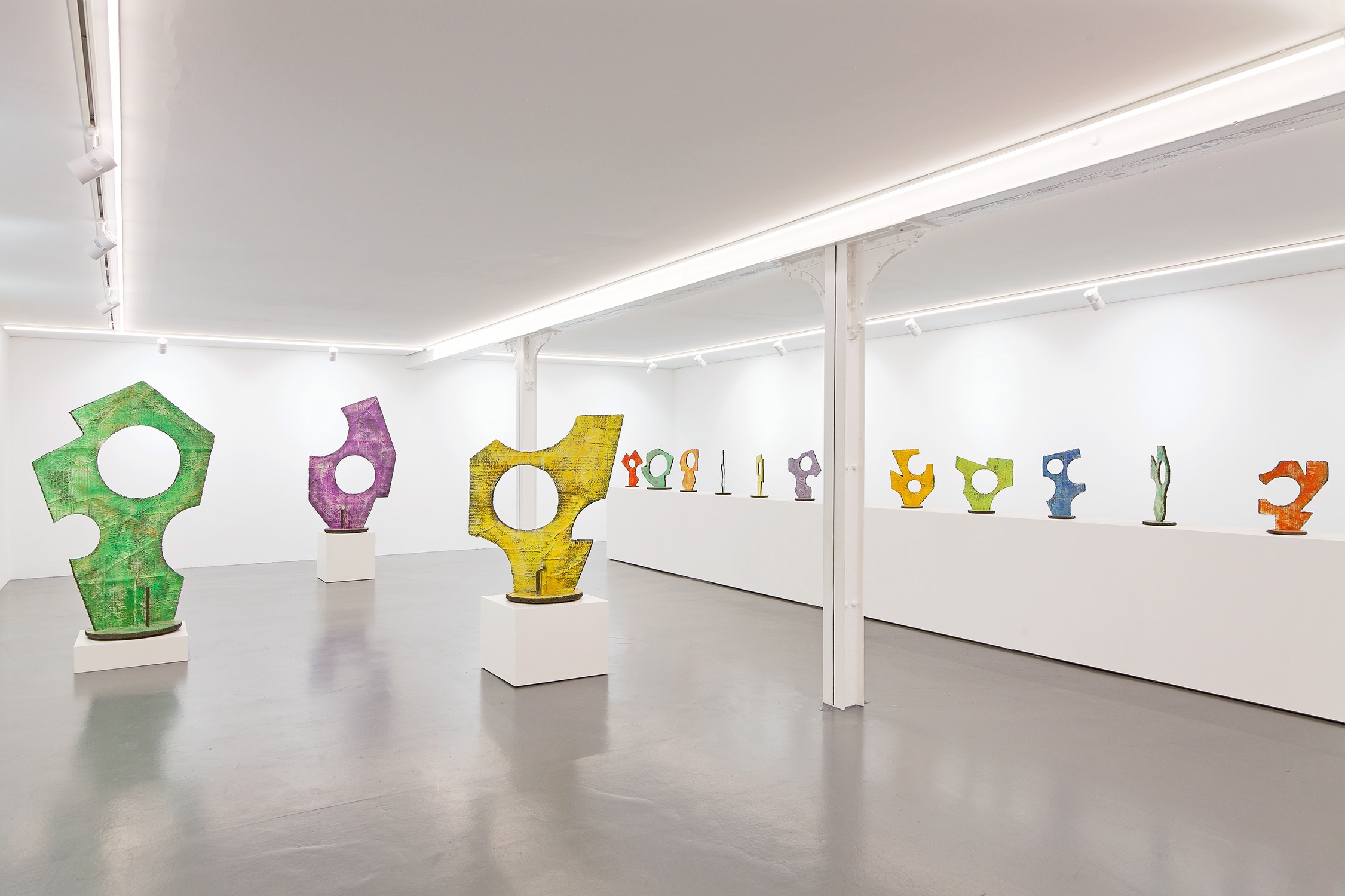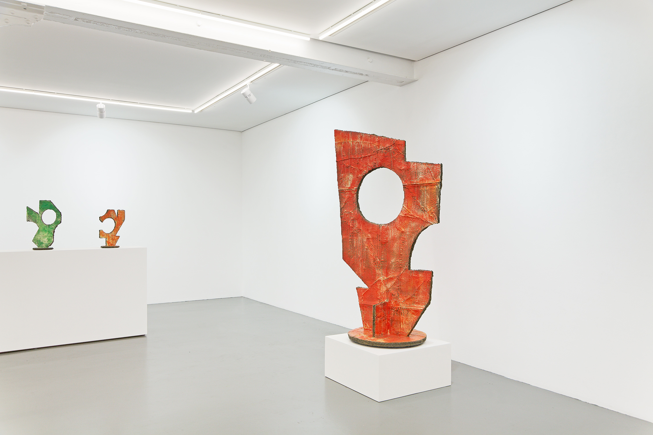 Concrete & Colors, whose title evokes both construction sites and modern painting (Matisse’s cut-outs, for example), presents Home Work, a series of large flat sculptures in painted reinforced concrete, as well as smaller ones, arranged on a pedestal in a layout reminiscent of a forest. They recall Barbara Hepworth’s perforated sculptures, Nancy Holz’s monumental installations, but also Joseph Beuys’ treatment of materials. Despite often playing with a certain formalism, Benjamin Sabatier’s works bear witness to an experience of transformation. The act of making is central to the work, to the extent of evoking self-construction (the kit). The process induces the form: the technique (assembly, moulding, cutting), based on cardboard moulds, enables the paint, which is applied at the end, to reveal the fragility of the piece, whose roughness can be seen on the edges of the sculptures.