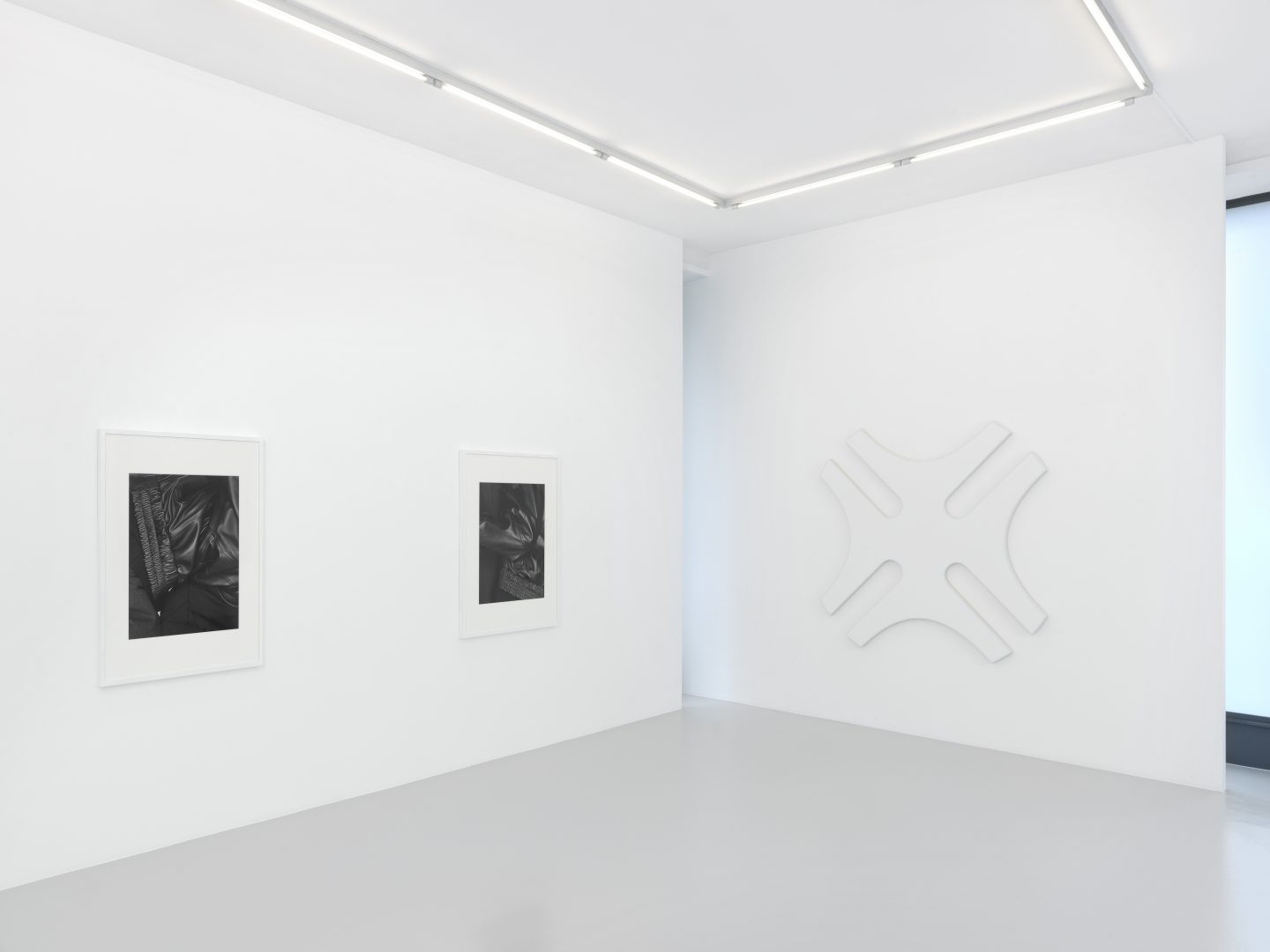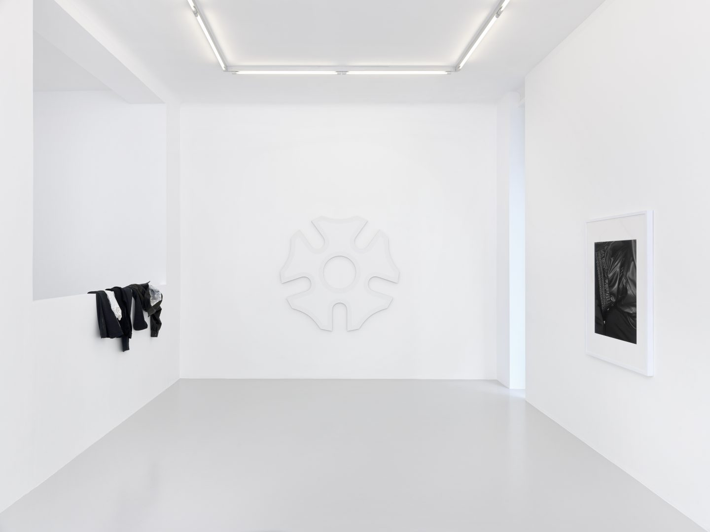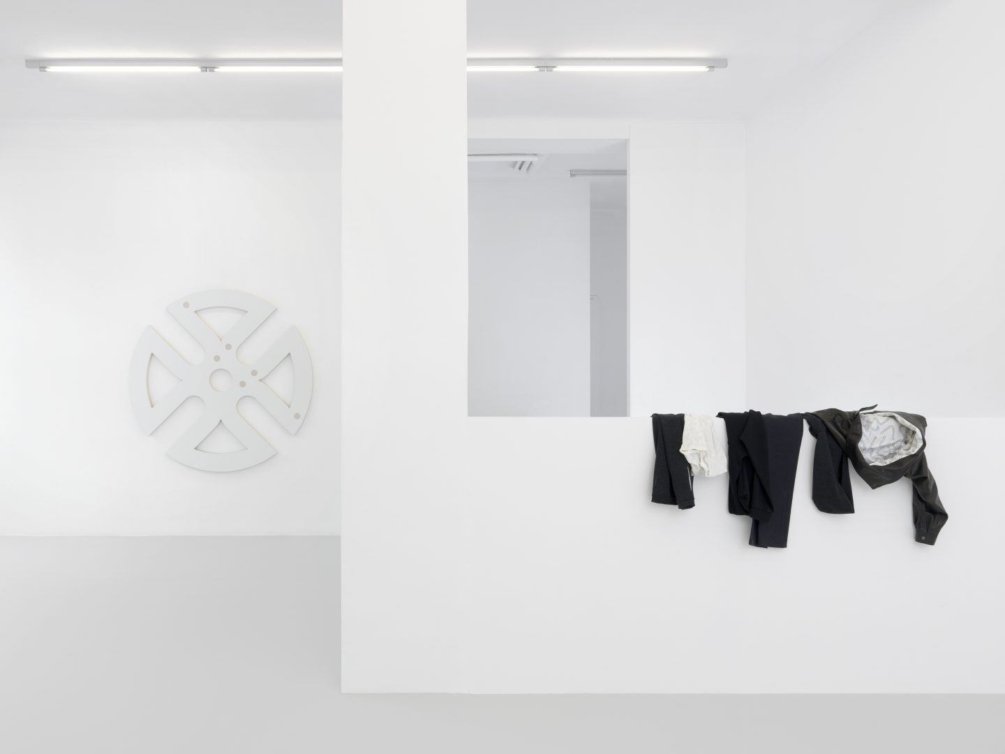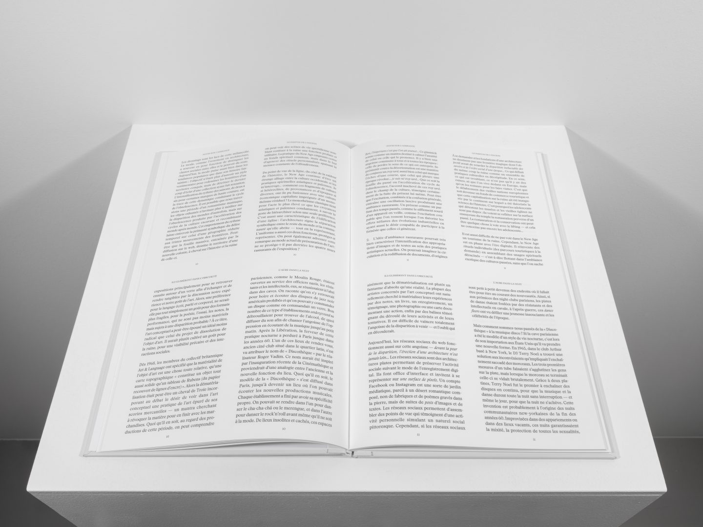 This dislocation is also visible in Pierre Paulin’s work, where his artistic and poetic practice blurs together with the practice of clothing looks. In his work, the term “look” refers to the assembly of “basics” – jeans, trench coats, t-shirts, hoodies, military boots – which are recombined to produce a clothing style. For him, clothes are like the words we use to write a poem: they are elements of a language developed from a shared cultural history which are wielded to create slight singularities. In this regard, Pierre Paulin’s works are variations on his writing and his wardrobe. For this exhibition, he presents a set of copies of his clothing on which are published his essay Ils glissèrent dans l’obscurité, photographs of a contortionist wearing the same clothes, as well as a white leather book containing four texts on the subject of the “look”.