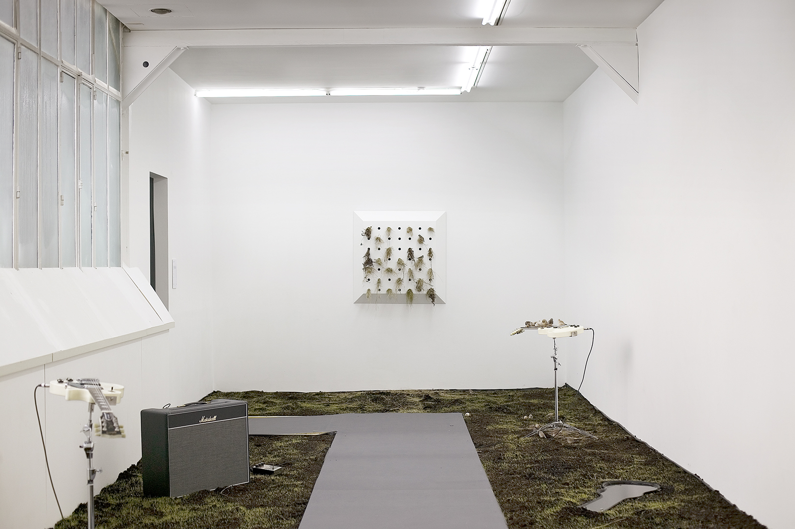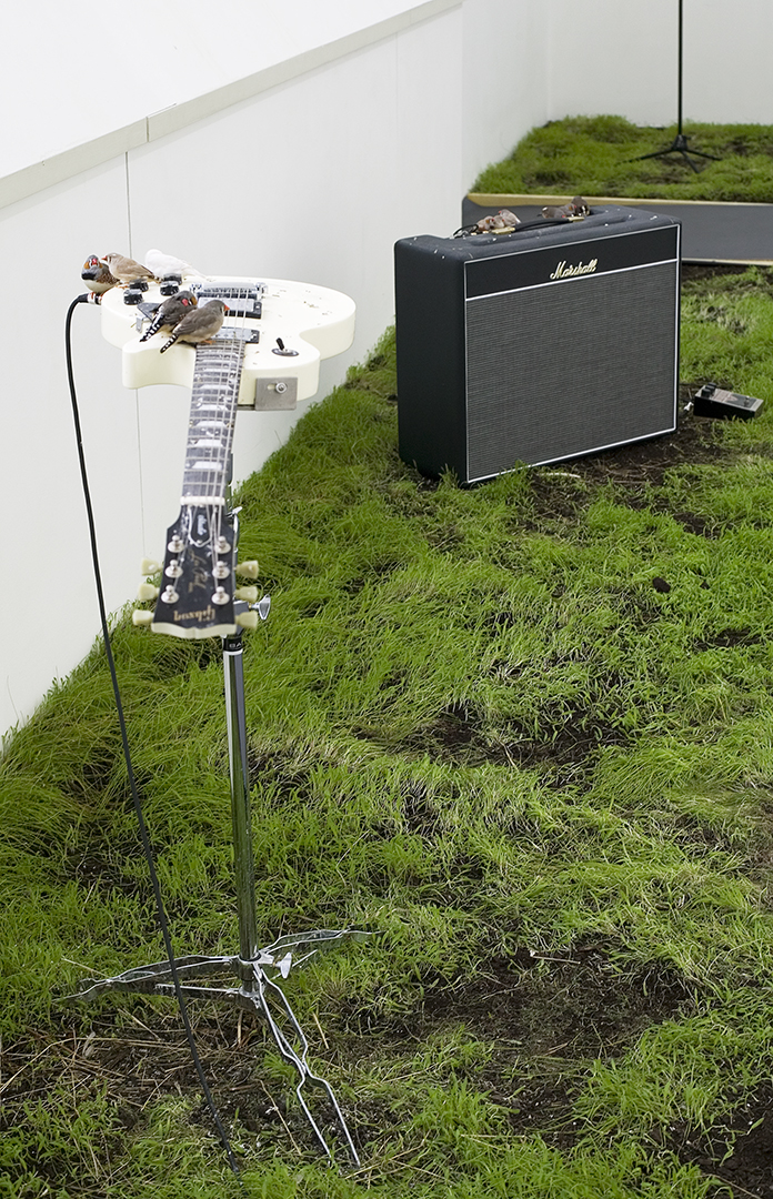For this first exhibit at Xippas Gallery, Céleste Boursier-Mougenot puts together from here to ear that has recently been shown at the Lentos Kunstmuseum of Linz in Austria. This installation, whose principle was conceived in the early 1990s, transforms the gallery into an aviary where visitors share the space with a few dozen birds, who, by landing on electric guitars, create a musical piece.