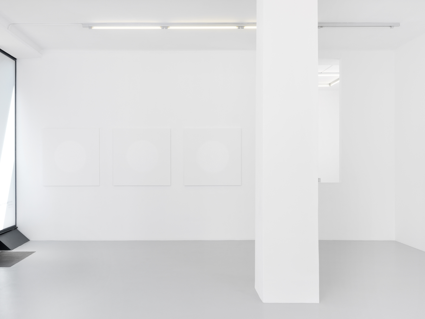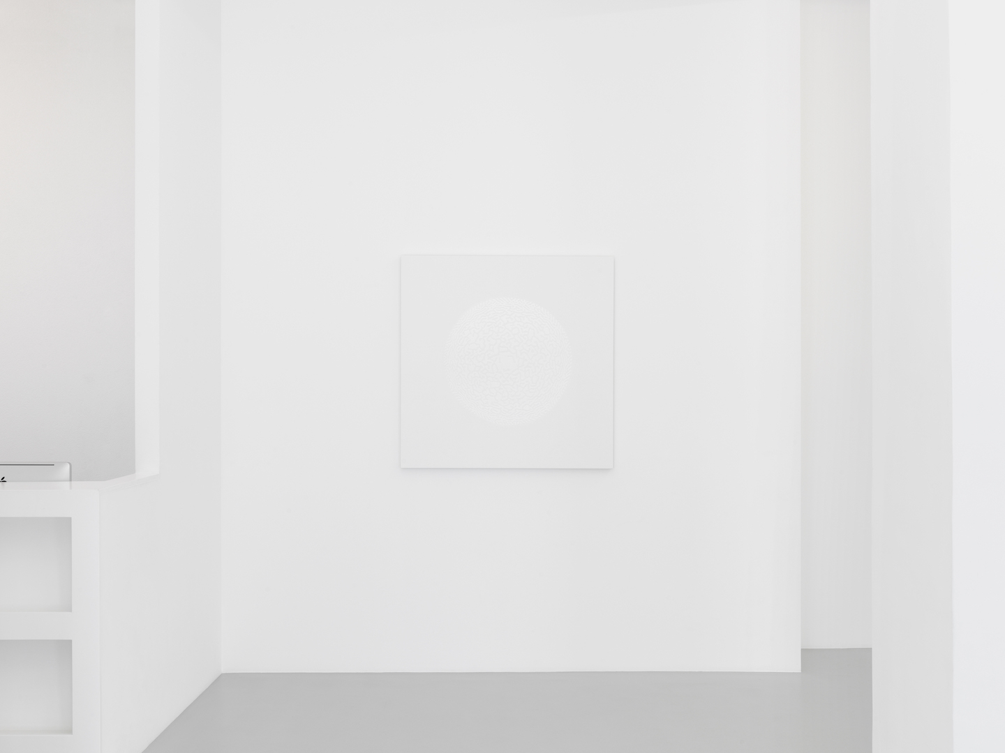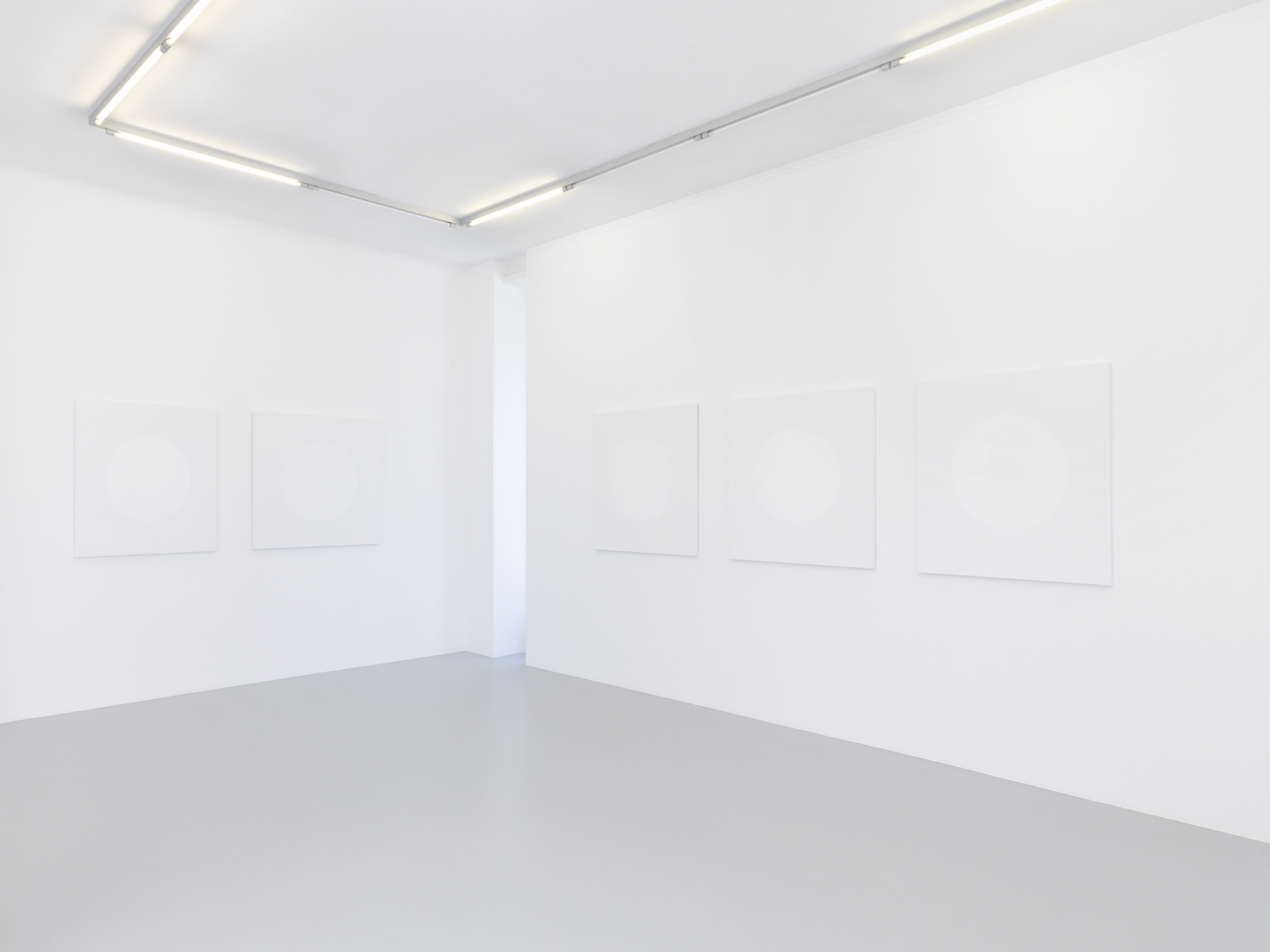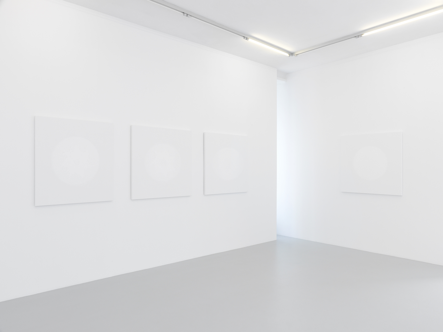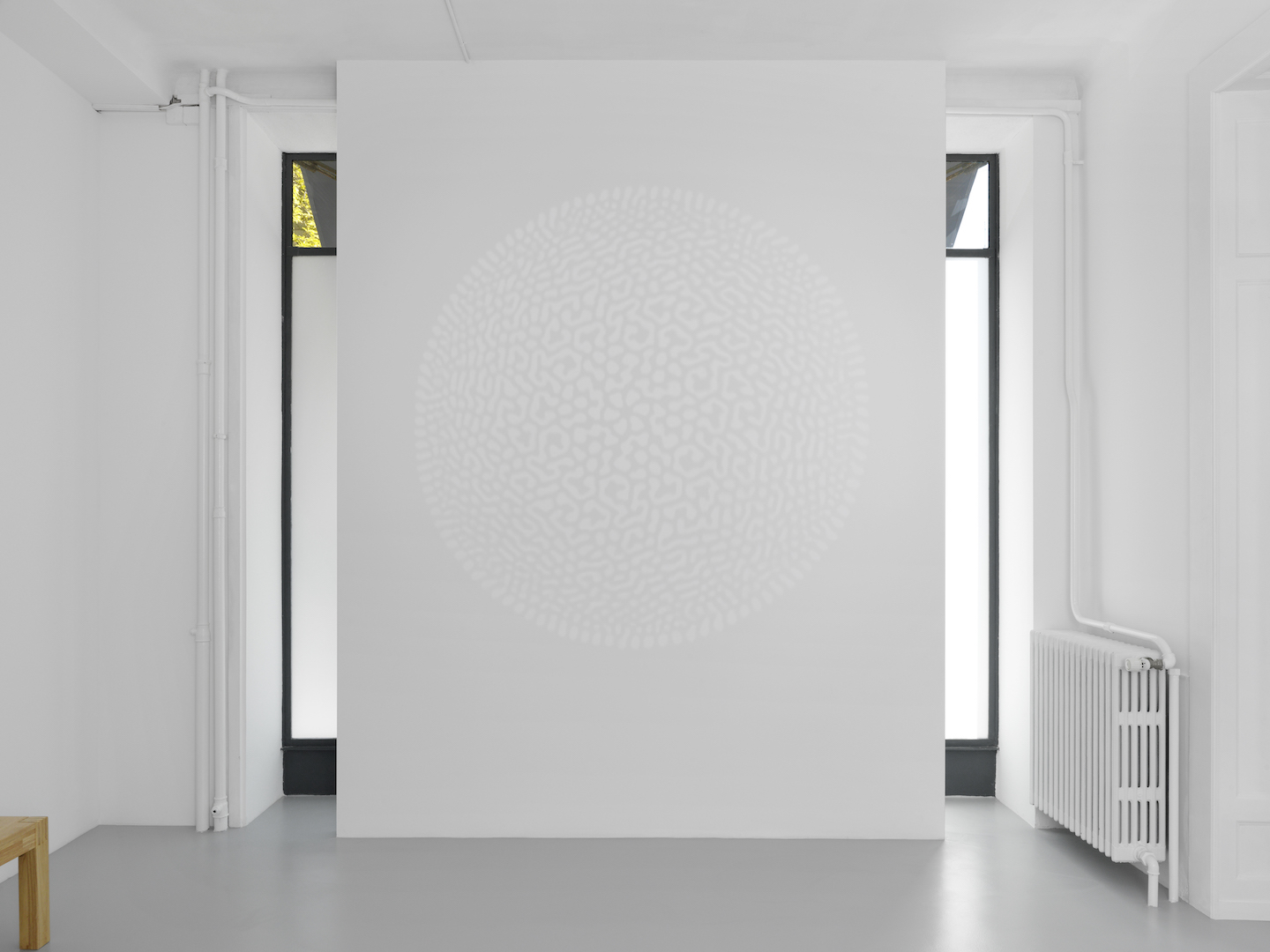 In Geneva, the sound is absent from the exhibition and yet figured. The works presented here in the form of paintings on canvas combine two divergent but complementary notions of the a-chrome (or monochrome) and of the pictorial space, which spreads furtively. The patterns, that appear or disappear according to the angle and distance of the gaze, come from videograms stemming from a research made by the artist in the late nineties. The series of films explores the potential of the acoustic effect called “Larsen“ and applied to the video image: the artist has sought to represent through a filmed image this phenomenon. These researches were inspired by the experiences of instrumental transcommunication. Indeed, Boursier-Mougenot, leaning on the belief that certain recordings could be the support of voices originating from the Beyond, invites us to contemplate visual forms resulting from these manipulations.