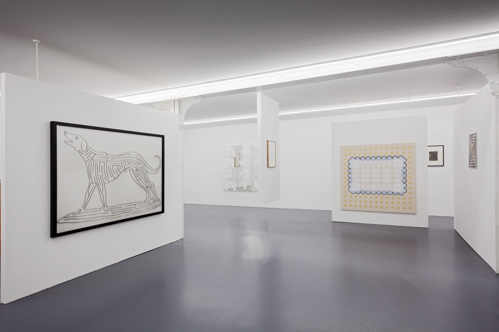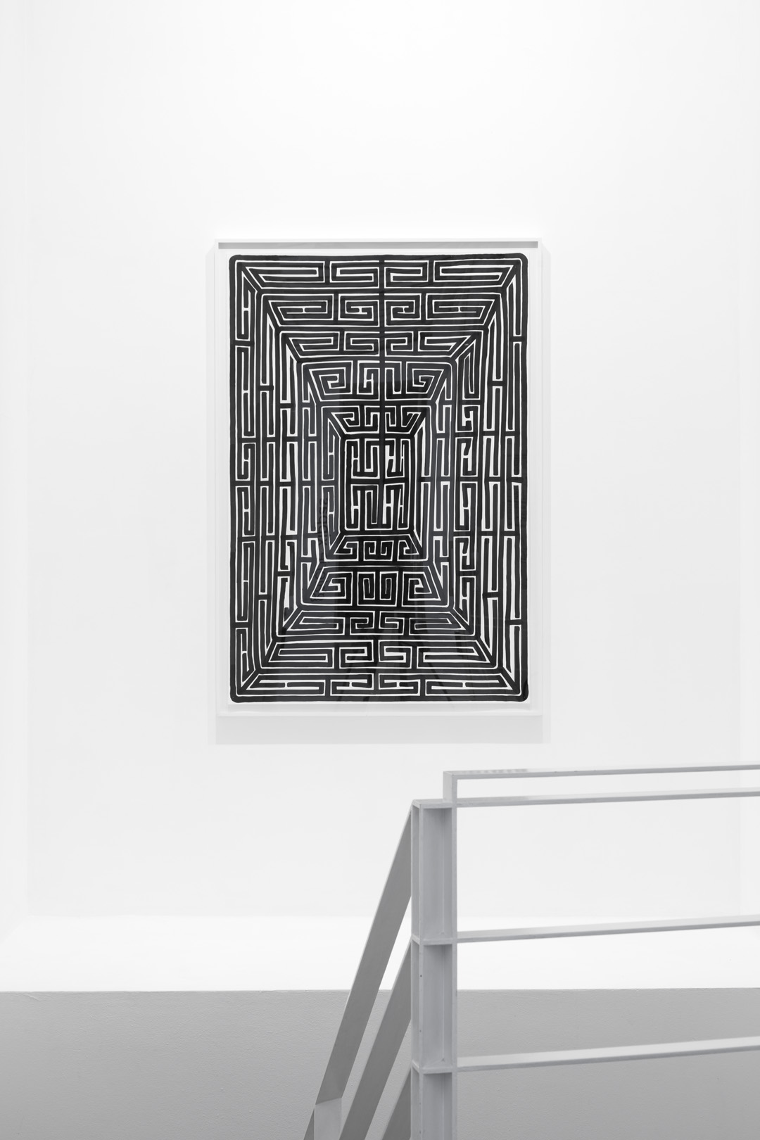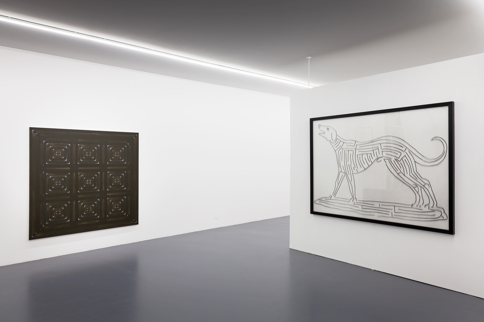 For their part, two pieces by Dan Walsh explore the abstract dimension of the subject. Their titles echo each other phonetically – Treat (2013) and Retreat (2009), and their ornamental composition isolates or multiplies the areas of confinement. This idea of an abstract labyrinth is also found in the work by Joël Stein, who explored this subject since the end of the 1950s and here recalls the Greek iconography of a unicursal labyrinth, and again in the works of James Siena, whose concept uses an algorithm and transforms his work into fluid, moving, or geometric compositions.