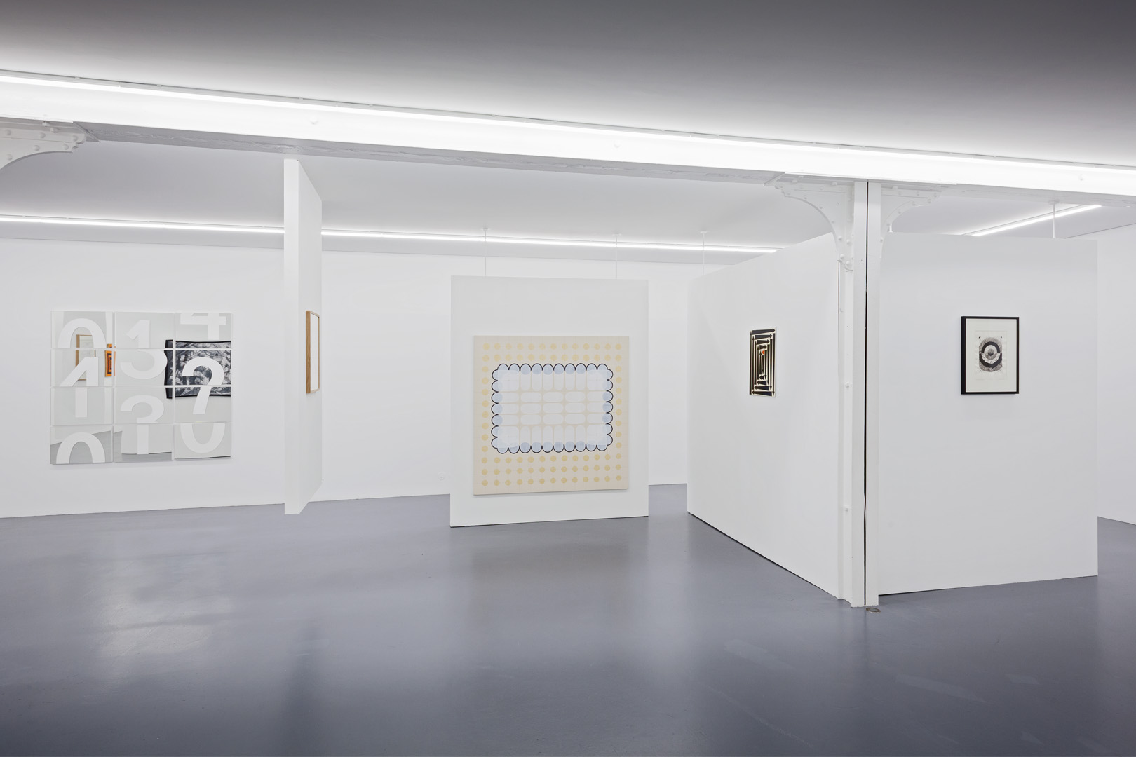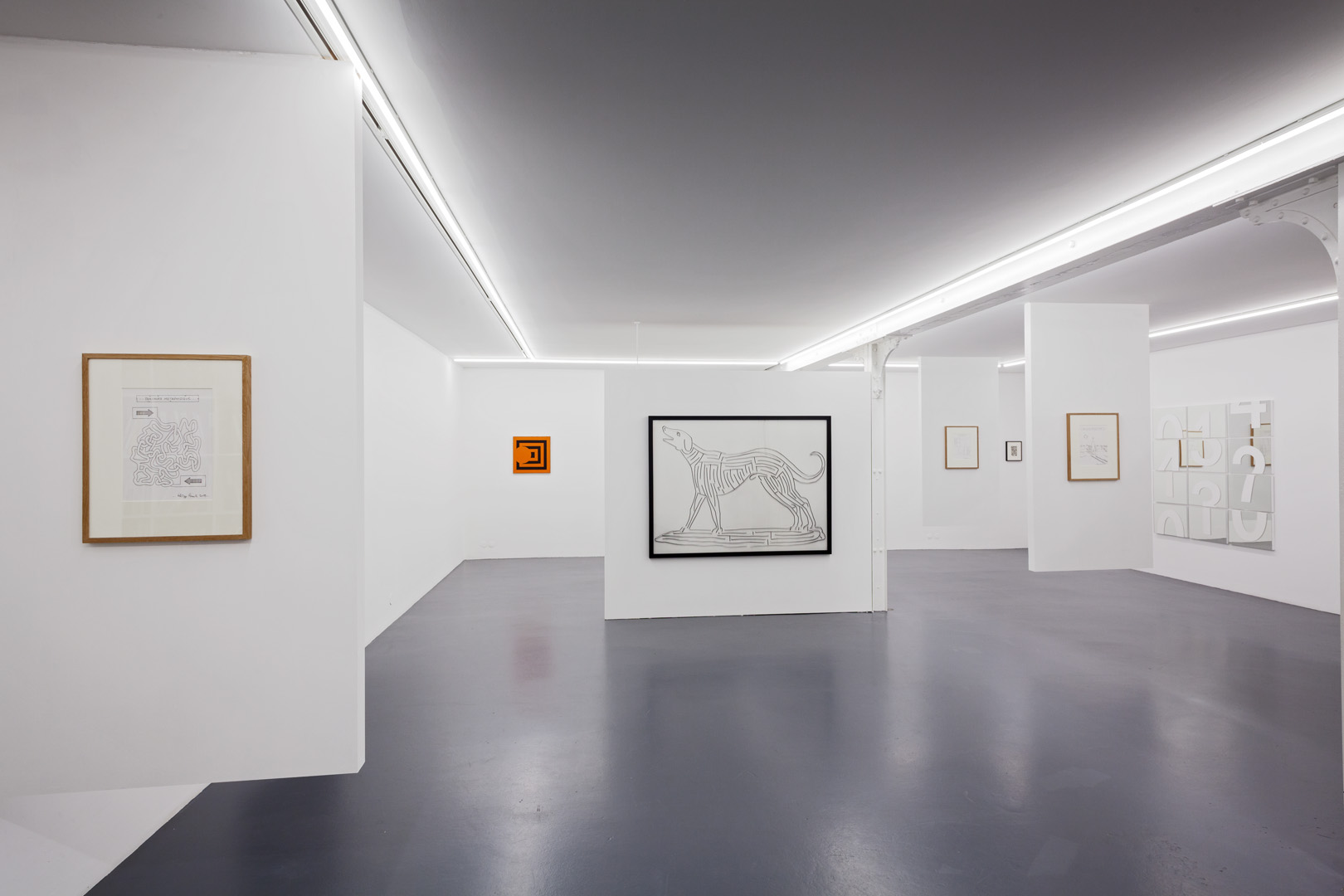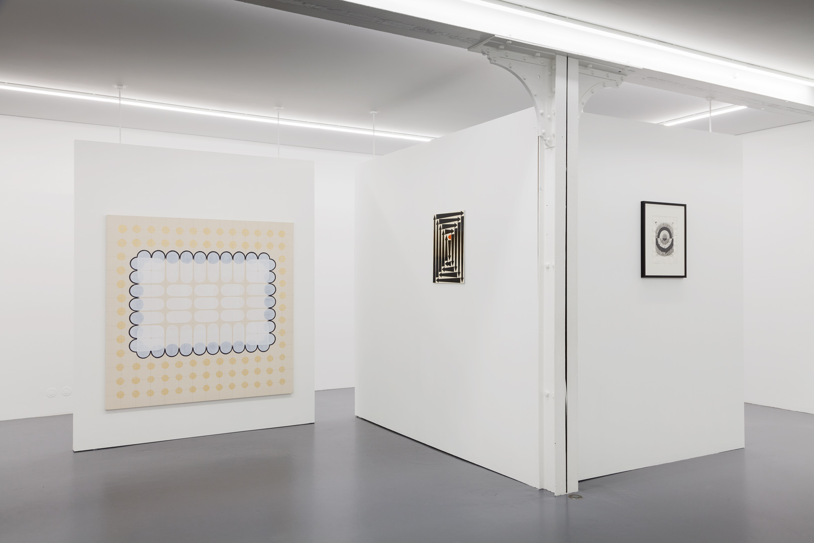 For their part, two pieces by Dan Walsh explore the abstract dimension of the subject. Their titles echo each other phonetically – Treat (2013) and Retreat (2009), and their ornamental composition isolates or multiplies the areas of confinement. This idea of an abstract labyrinth is also found in the work by Joël Stein, who explored this subject since the end of the 1950s and here recalls the Greek iconography of a unicursal labyrinth, and again in the works of James Siena, whose concept uses an algorithm and transforms his work into fluid, moving, or geometric compositions.