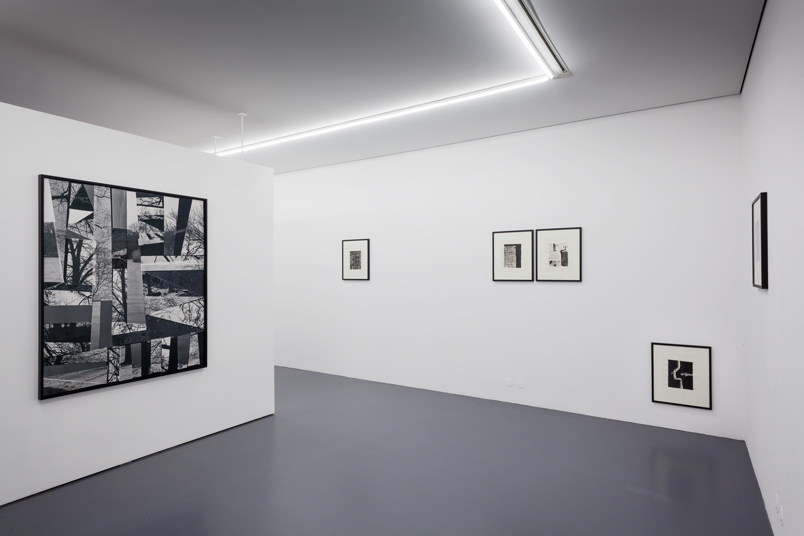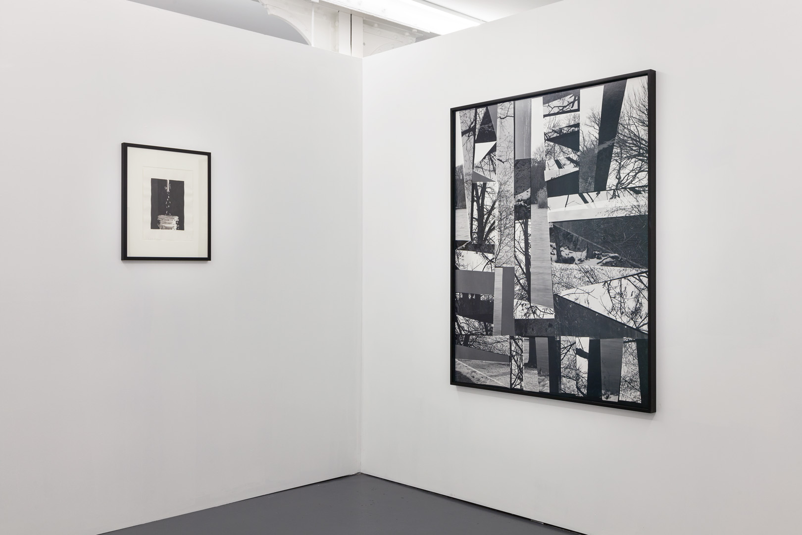 Further on, the photo Winter Landscapes (2014) by Hannah Whitaker questions the restitution of our memories, by showing how a lived experience can shatter into pieces in the corridors of the unconscious to re-emerge in a fragmented form, like a puzzle. Recomposition is also apparent with Philippe Ramette’s contribution, designed for this exhibition, consisting of walls suspended from the ceiling as if they were inverted. On these are hung a series of drawings which humourously introduce the human figure and its existential doubts. As a counterweight, Michael Scott’s work draws our gaze from this suspended architecture and reveals underground labyrinths, made up of tubes, piping and stop valves.