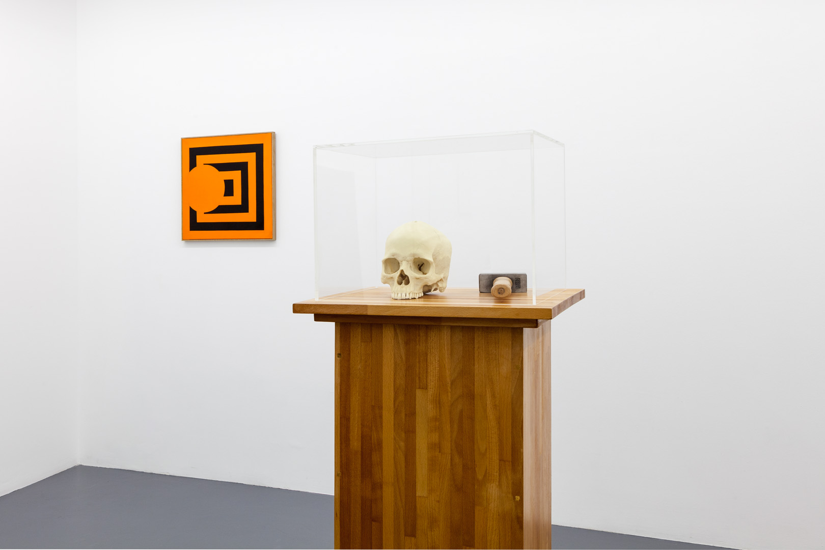 The visitor moves past this by going down the stairs to discover the exhibition route in an underground room. In this staged space, the visitor is confronted with physical or temporal labyrinths. The first piece is Perfect Time (2013), the mechanical clock by Darren Almond. Erected as a totem standing in the way of the entrance to the room, the work is reminiscent of a Borgesian fantasy in which stretches of time do not succeed each other but instead exist simultaneously.