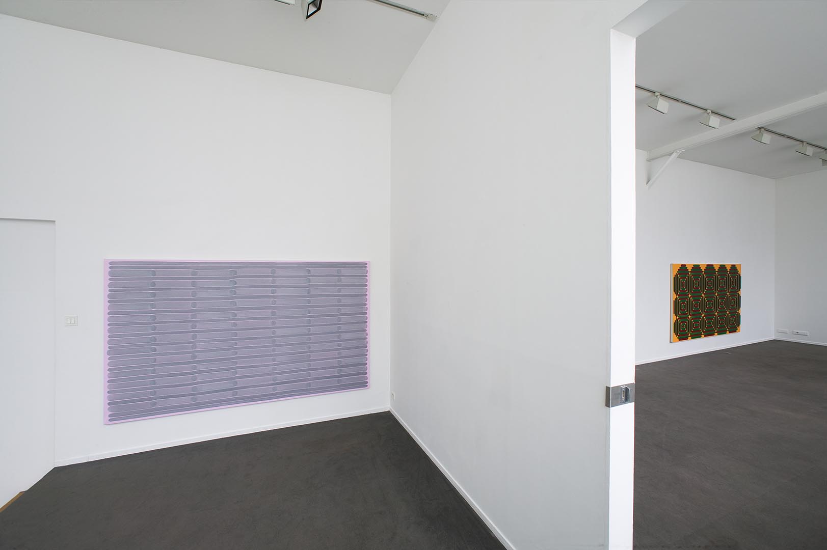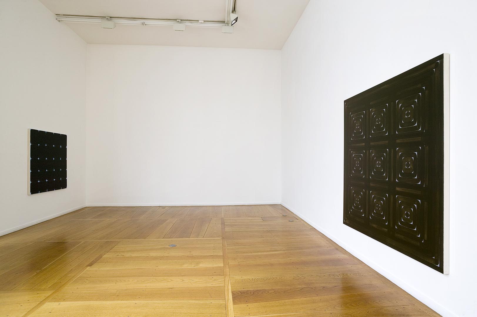 An array of references to minimalism, De Stijl, kinetic and hypnotic art, Tibetan Mandalas echo throughout the canvases, and the viewer poses his or her gaze on a fragment of time where the colored traces reveal an absolute interiority of the spirit and the gesture.