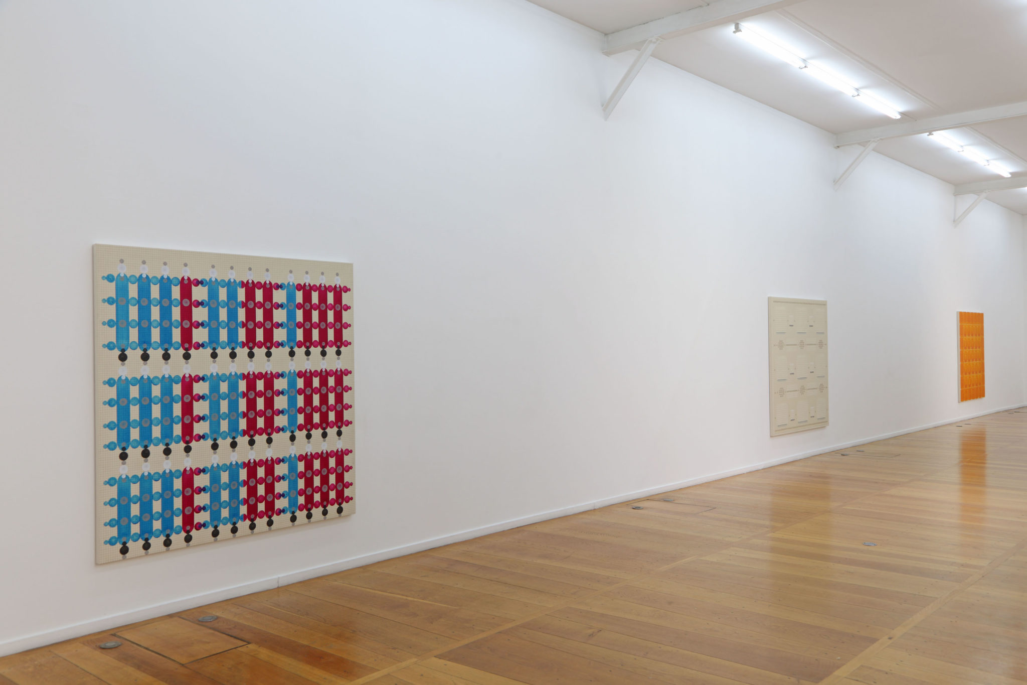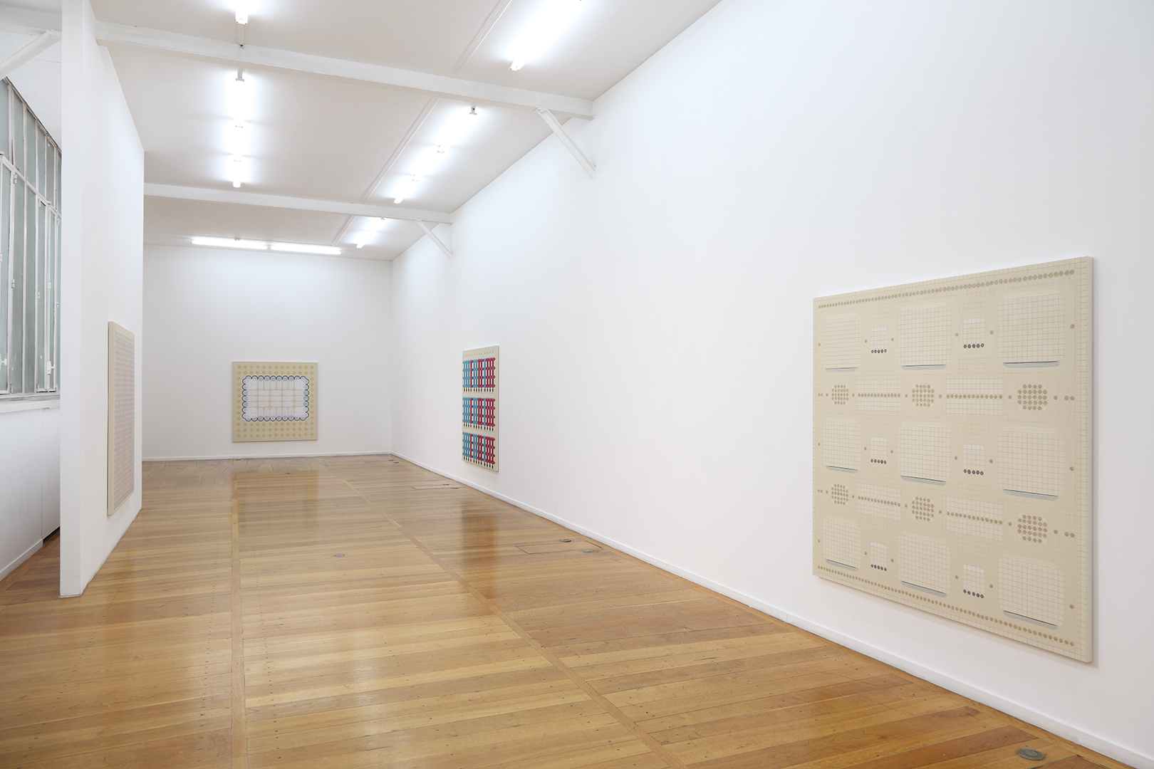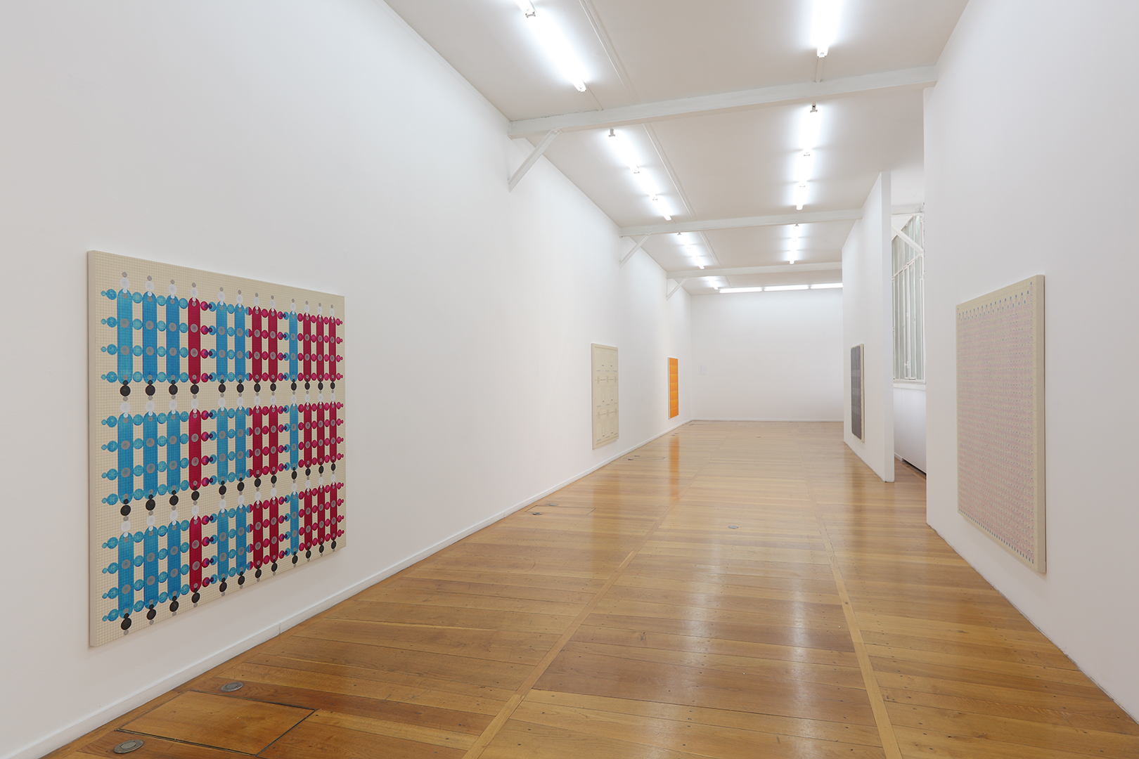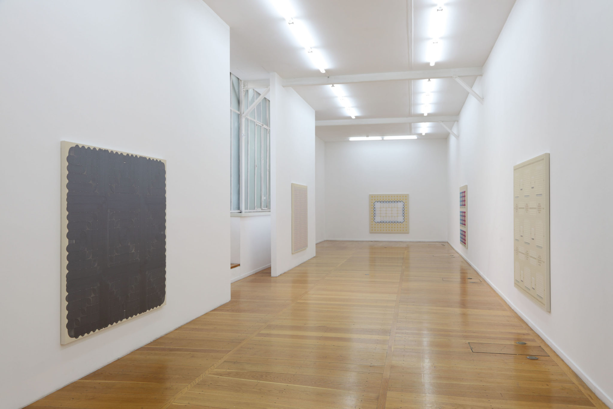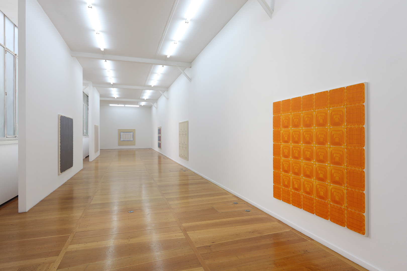 These six canvases shown here rely on the elementary form of the grid. It is the structural apparatus at the heart of this group of artworks. After all, painting is the medium that allows the mechanisms of expression and perception to play off one another. Through the abstraction and the simplification of forms, each painting corresponds to a certain resonance or a table of potential elements, similar to the Tibetan Mandalas: this allows the painting to snatch the spectator’s attention and influence his reflection. For Dan Walsh, painting is a pertinent medium, “as long as it is a means for an individual to make sense of the world, and the commitment it requires is shared with the public.” Therefore the painting is not simply a critical tool. Above all else, it symbolizes the place where we can explore and question mechanisms of perception.