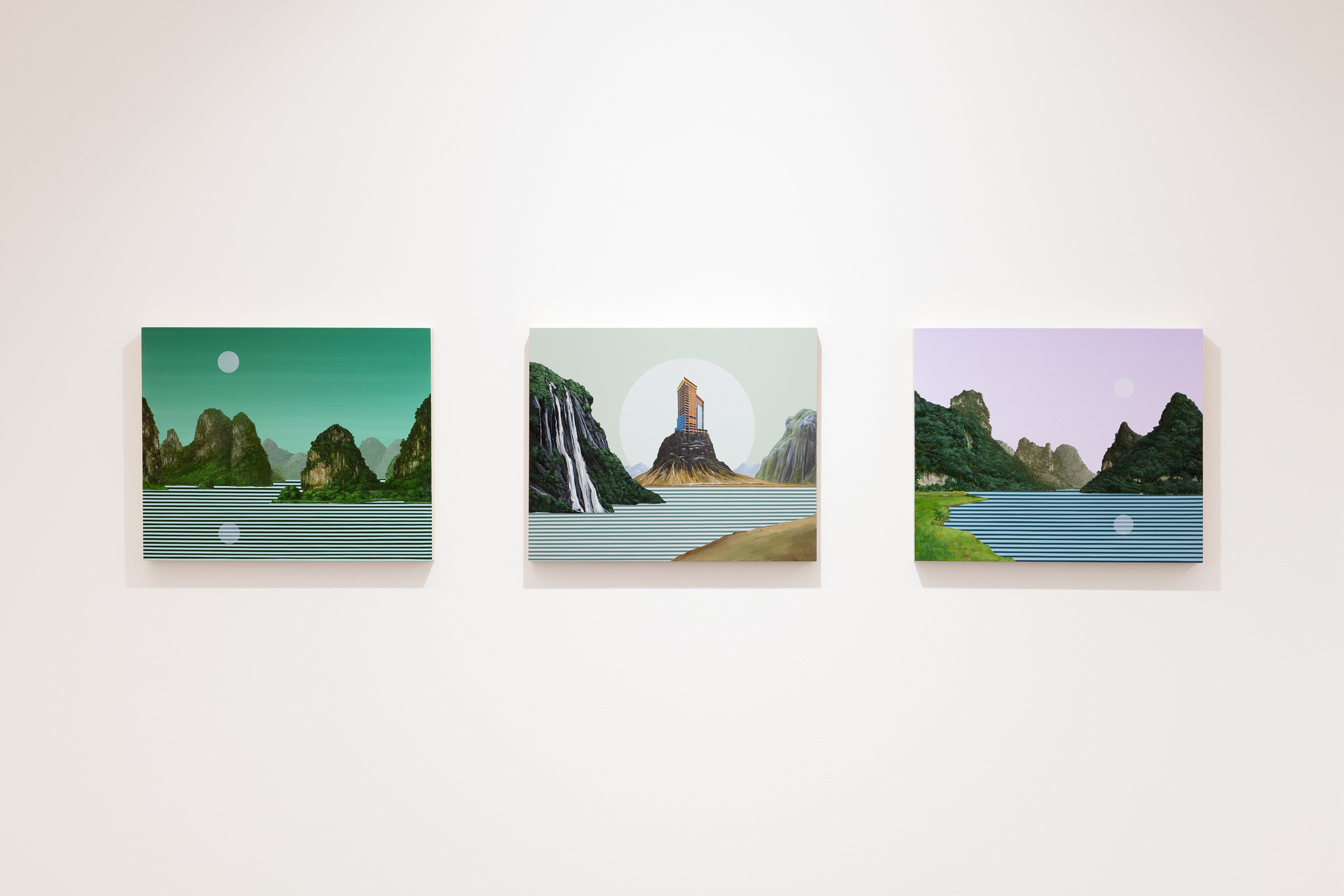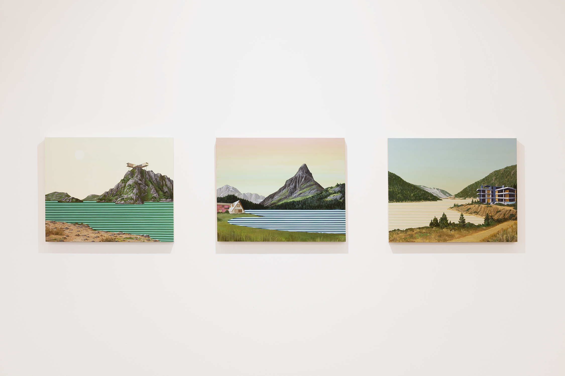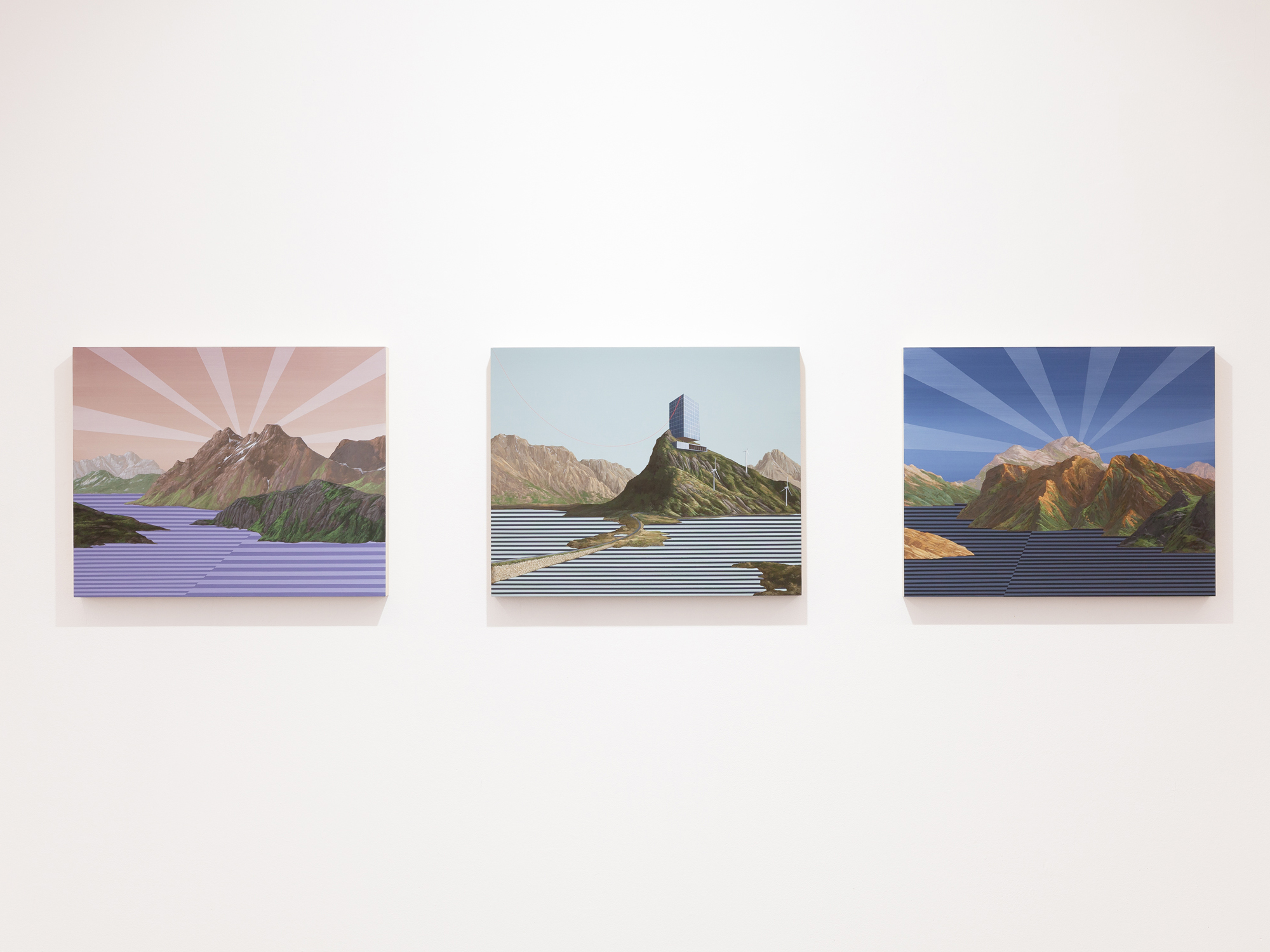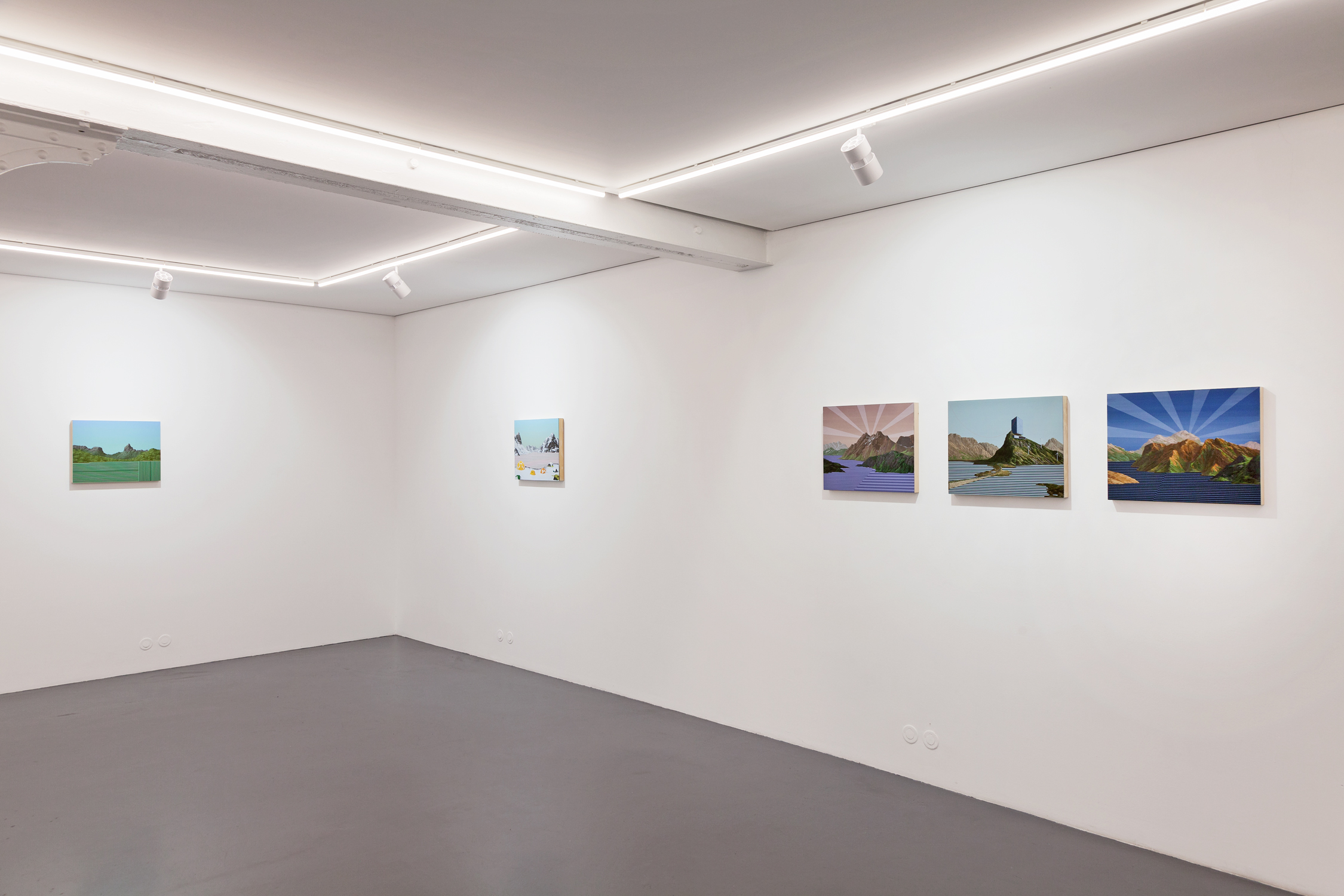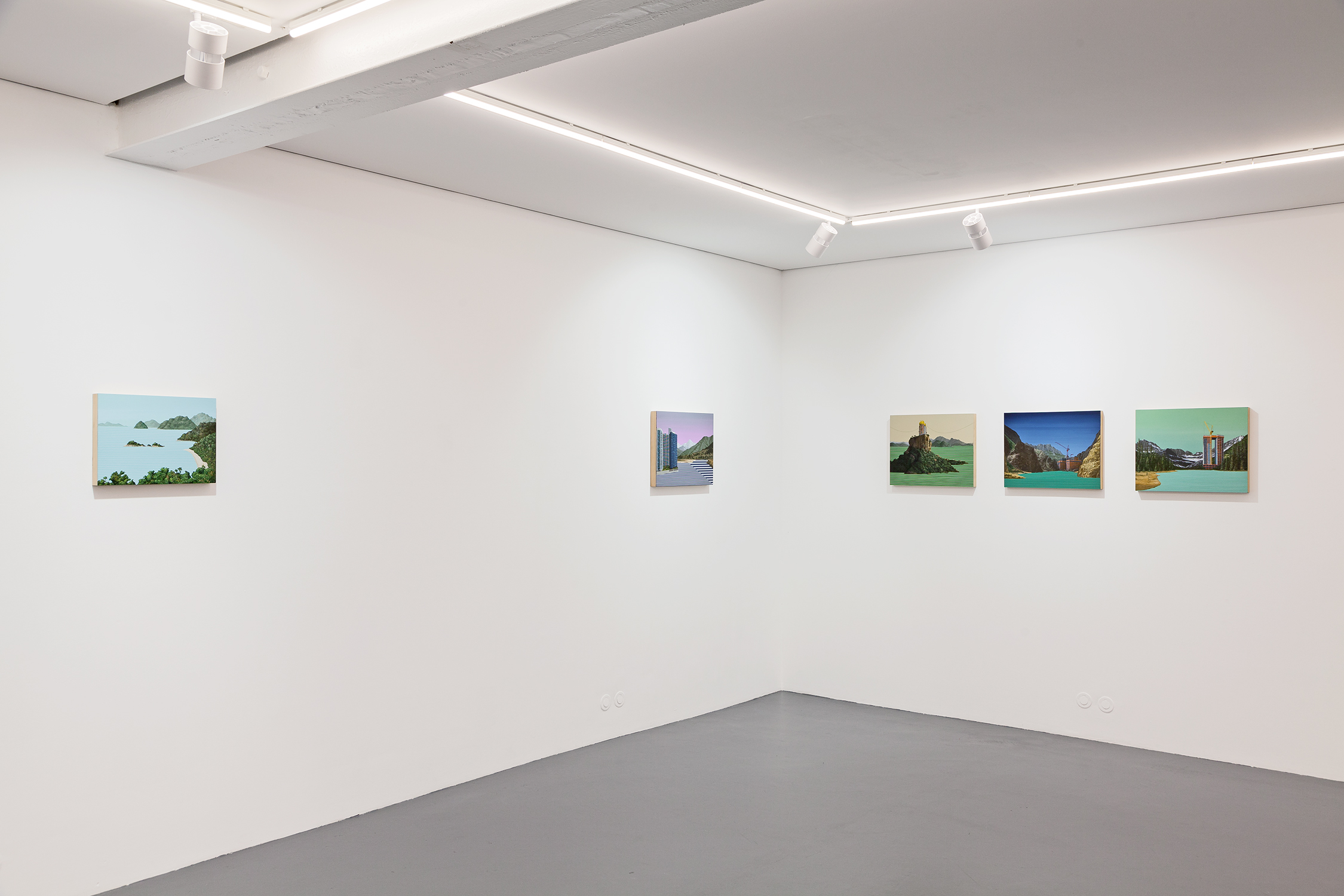 The word ‘virtual’ is a corner stone in this new series, although it should be taken in a larger sense, as something that maintains a complex relation with the ‘real’. This relation is not necessarily that of opposition, but also of simulation, projection and substitution. These new paintings seek to fill the void, the gap. They compensate the absence. Most of the landscapes reminds us of real places: mountains crowding around lakes, wild forests unfurling their way through the grounds, a road snaking along the coast. Although inspired by existing landmarks, whether it is Norwegian fjords, Greek waterscapes or roundabouts of Lake Mead, these are not reproductions but reinventions of the landscapes. The paintings capture the virtual, the dreamlike.