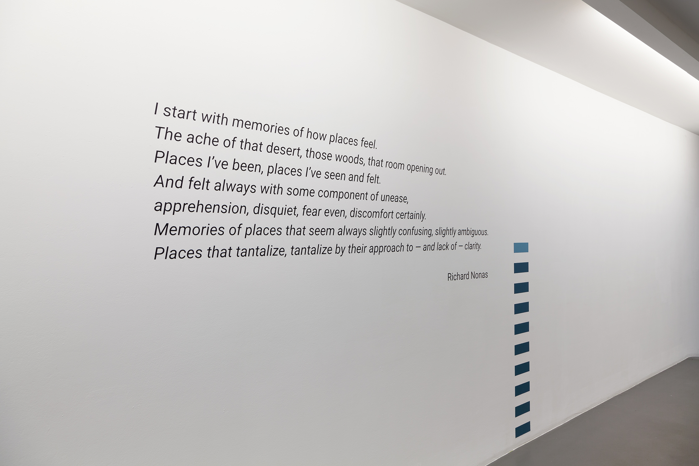 However strange the landscapes by Dean Monogenis may appear, they, nevertheless, are well rooted in the genuine, the authentic. This is obtained, on the one hand, through reflection upon the idea of what a place is, whether it is a place in particular or any place. On the other hand, it is the feeling the paintings convey. Feeling of the presence. Of the “ache of that desert, those woods, that room opening…” But opening where? And for how long?