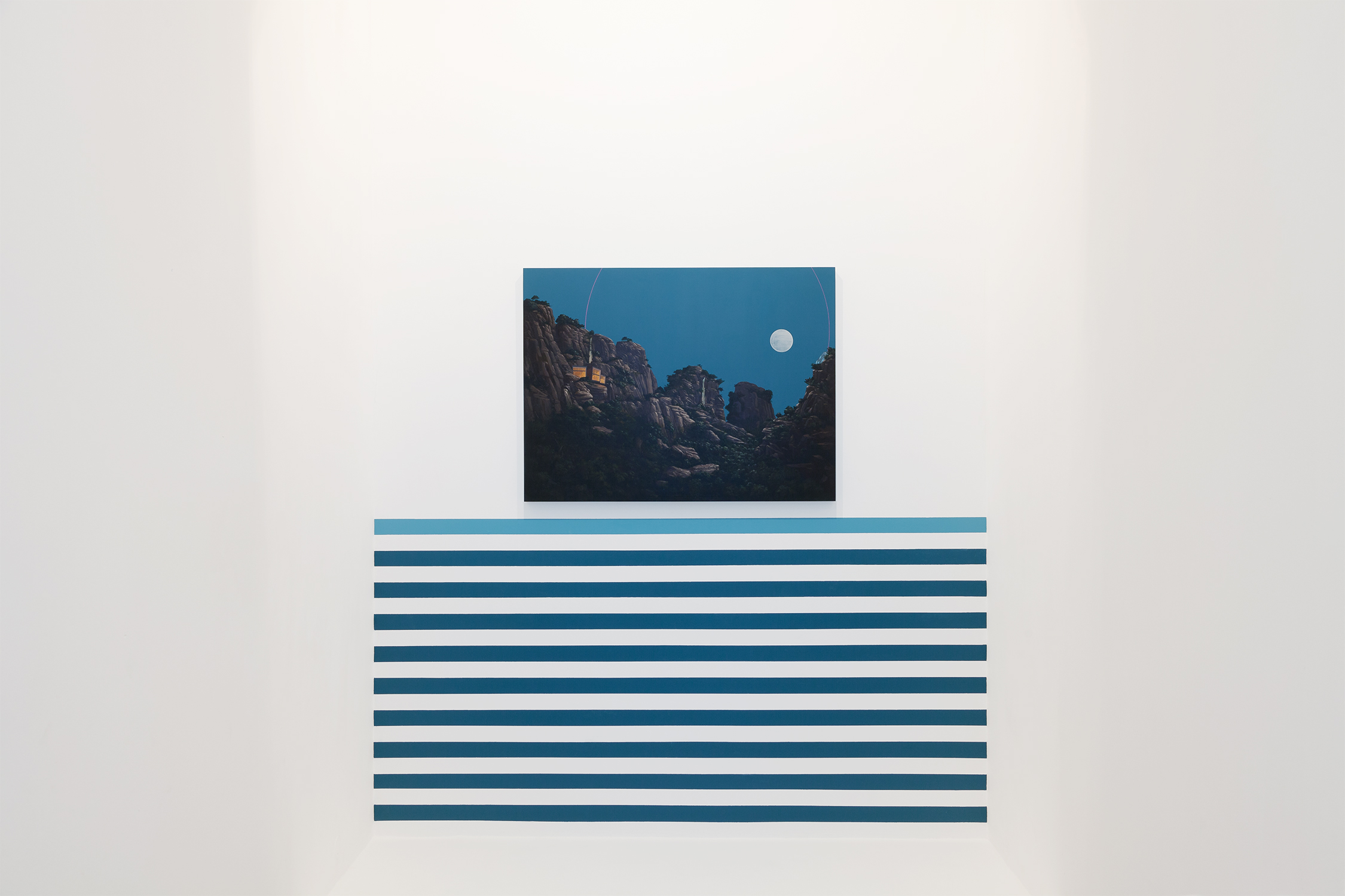 Inspired by Richard Nonas’ poem, this new body of work is rooted in the “memories of how places feel”, crisscrossing sensations with visuals. It draws an imaginary and thus tantalizing coastline, made of fragmented landscapes tied together on a formal and conceptual level. This feeling of togetherness, giving an impression that the artworks are bound into an interconnected whole, a corpus, is ensured not only through the general half-dreamy half-apocalyptic ambience of the paintings, but also through an abstract element – the stripes – ubiquitously present in the composition. Those are summoned to replace water, turning oceans, rivers, waterfalls into a negative space, a conceptual void. In some paintings, they go steadily in parallel lines. In others, like in Slogans Don’t Save Lives, they change their rhythm and create visual ripples, reminding us of the weirdly beautiful borderlines where salt and fresh water meet.