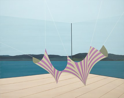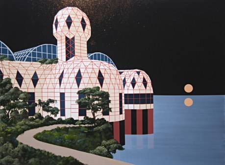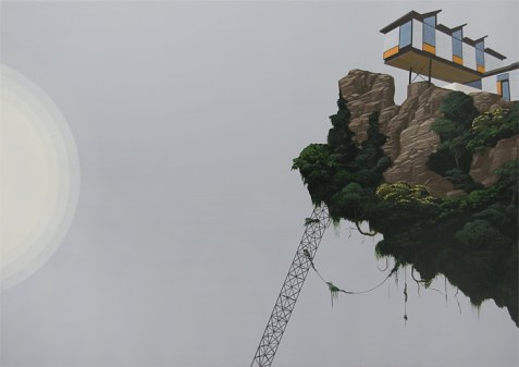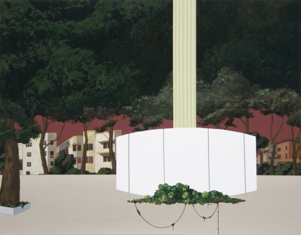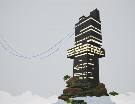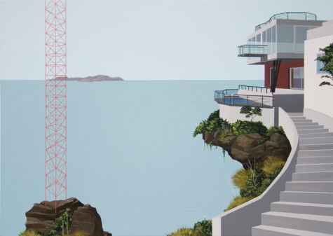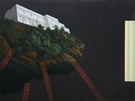 Dean Monogenis’s paintings depict environments merging urban, architectural constructions with natural elements. He combines details of unfinished buildings, colored scaffoldings and condo structures in landscapes made of rock cliffs, vegetation, looming skies and colored abysses. He thus points out the constant state of change and transition, the challenge between nature and human perseverance in the perpetually in-progress urban landscape.