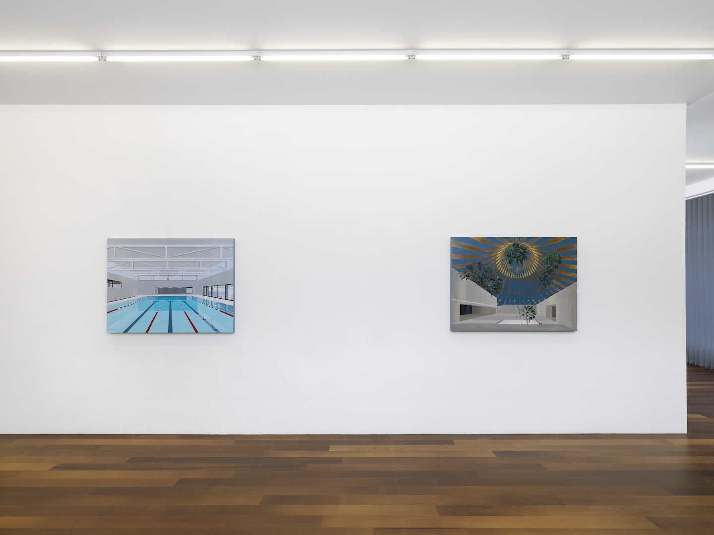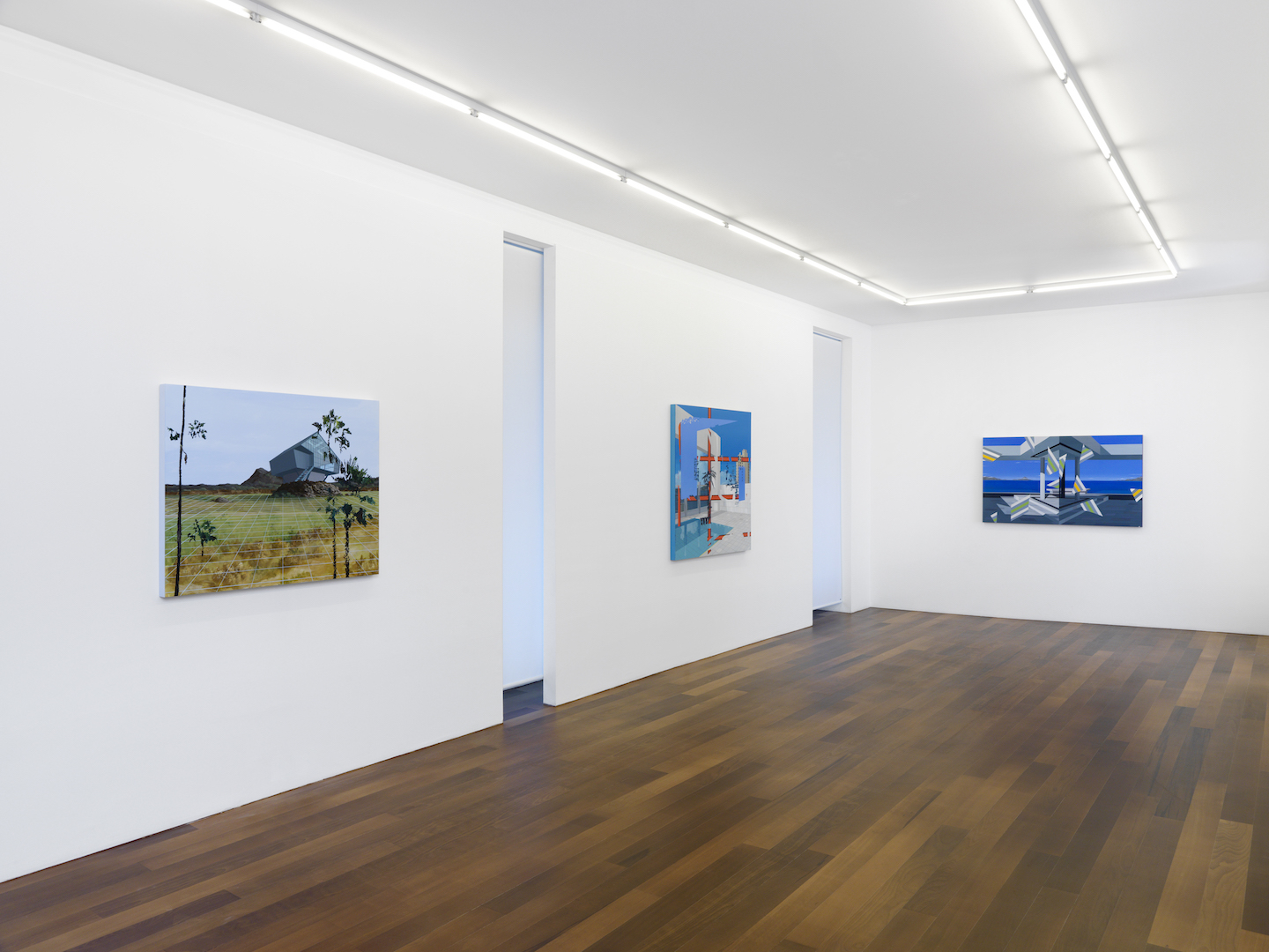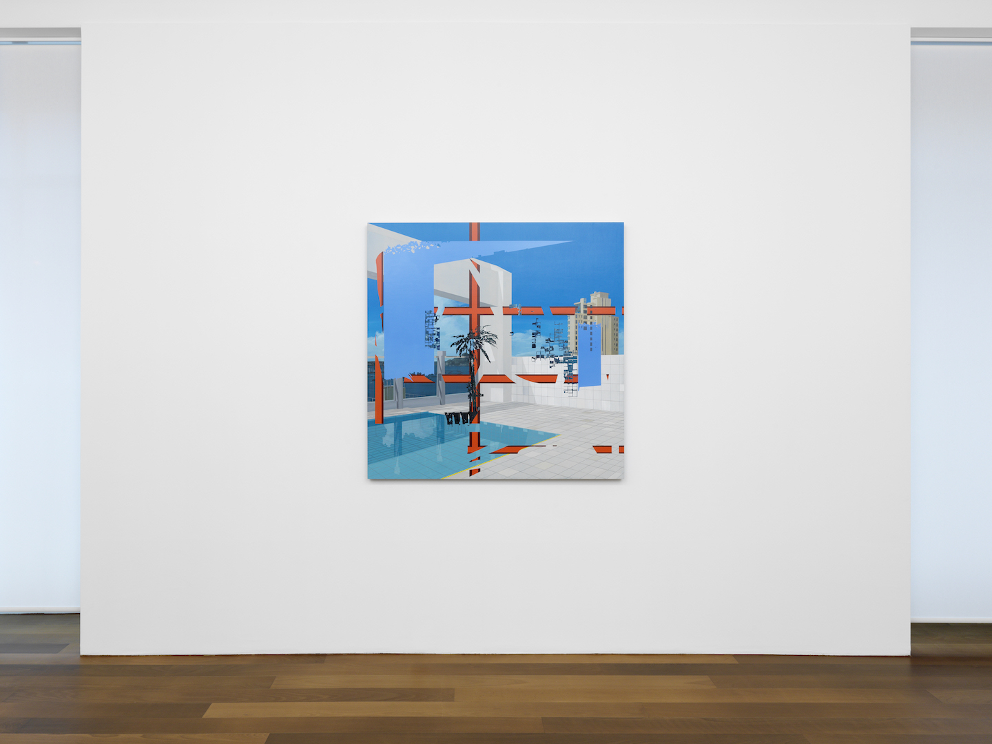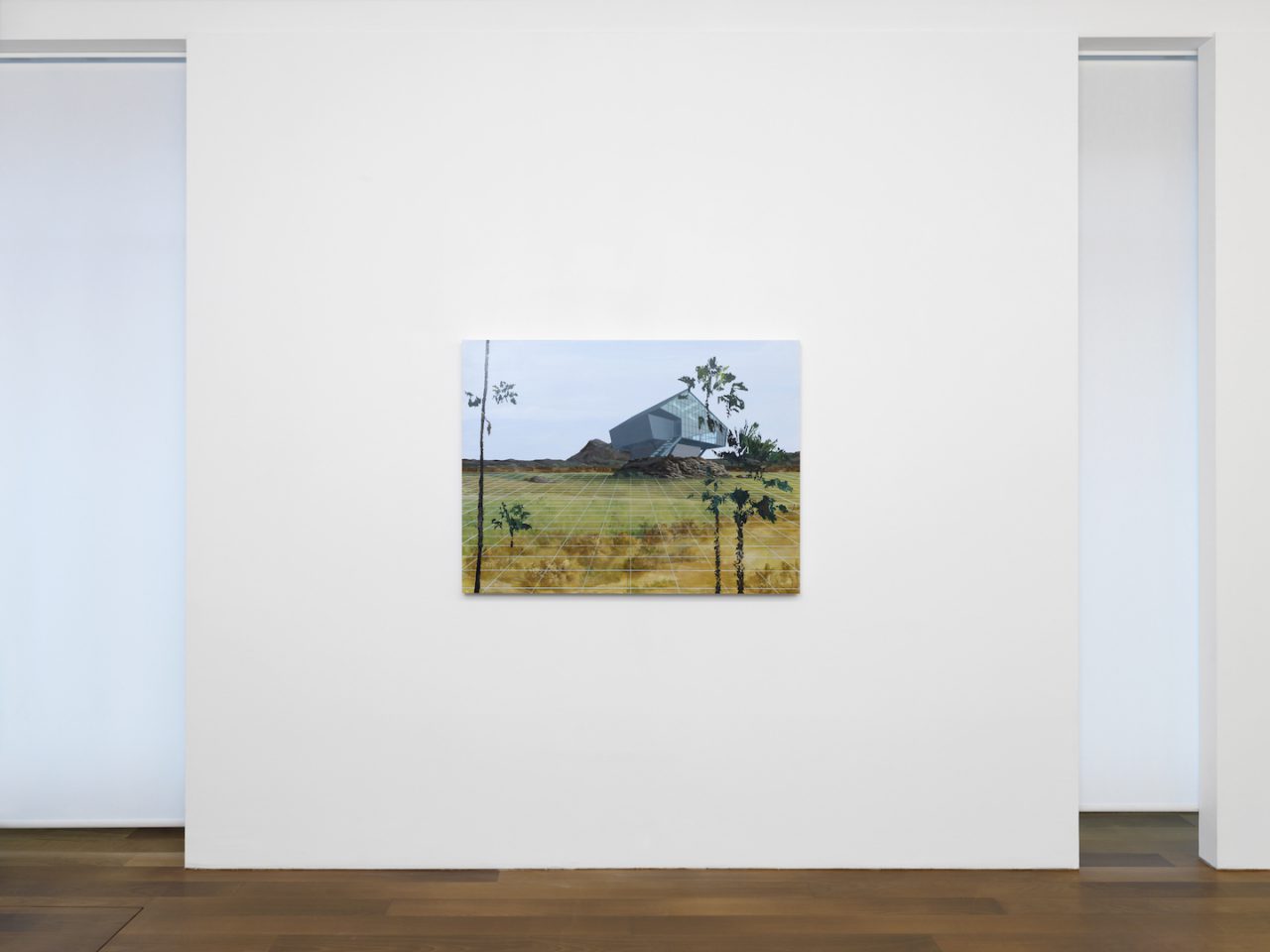 The title Metafiction is an accurate depiction of Dean Monogenis’s work. What the visitor sees is a fiction that describes itself as one. The set of paintings being shown here can be divided into three themes: distance, intimacy and distortion. In the first group, the viewer’s position to the building is far away and allows him to take in the whole scene as a somewhat traditional landscape. The scene is inhabited by multiple edifices that function like characters in a play. In the second group, the viewer is invited to enter the space. There is often a perspectival change leading the viewer’s eye to one point on the horizon and challenging his experiential impulse. In the last group of paintings, he builds a visual rivalry between the foreground and the background. The graphic elements don’t allow a clear view on the second layer. This layering serves as a reminder that our often, perfect postcard images are encumbered by real world obstructions. The abstracted imagery on this primary surface is made of fragments from other images that on a subconscious level connect to the whole picture. Like disparate memories fused together in a moments recollection.