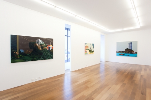 Dean Monogenis’s paintings depict environments merging urban, architectural constructions with natural elements. The artist combines details of unfinished buildings, colored scaffoldings and condo structures in landscapes made of rock cliffs, vegetation, looming skies and colored abysses. He thus points out the constant state of change and transition, the challenge between nature and human perseverance in the perpetually in-progress urban landscape.