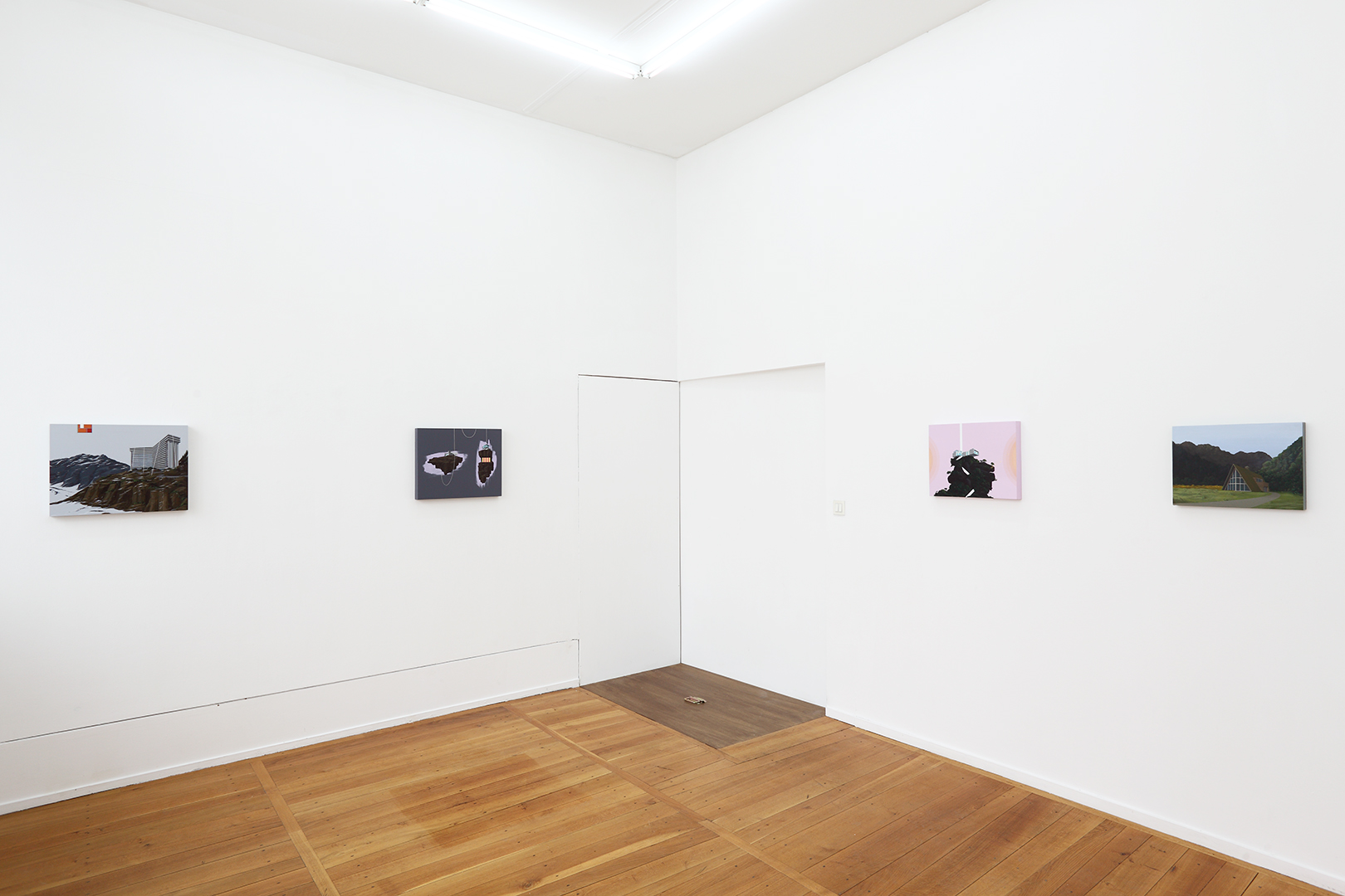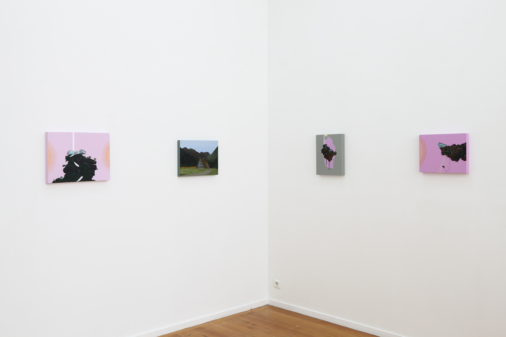 The exhibition title View Break is taken from a specific real estate term that designates the cut off point where the landscape view is not obstructed by buildings. In most of the artwork made for this exhibition, the houses are perched on cliffs – as seen in Athos (2013) and P.O.V (2013) – or they are suspended like cocoons, as in Facing East (2013) and The Other Way (2013). This group of artworks projects a feeling that we are teetering on the edge of the world. The quest for the “best” view has been instilled in us over thousands of years, whether we think of homes in Malibu, California, or the ancient constructions of Meteora in Greece or the sacred city of Lhasa in Tibet: “Of course, there is an important psychological element that makes us want to live in a particular place, which stems first from the need to possess. But, what interests me is that it is also a vehicle for a message, or a space for external projection,” explains Monogenis. Through the lens of architecture, the painter investigates this feeling of belonging that is specific to a given culture.