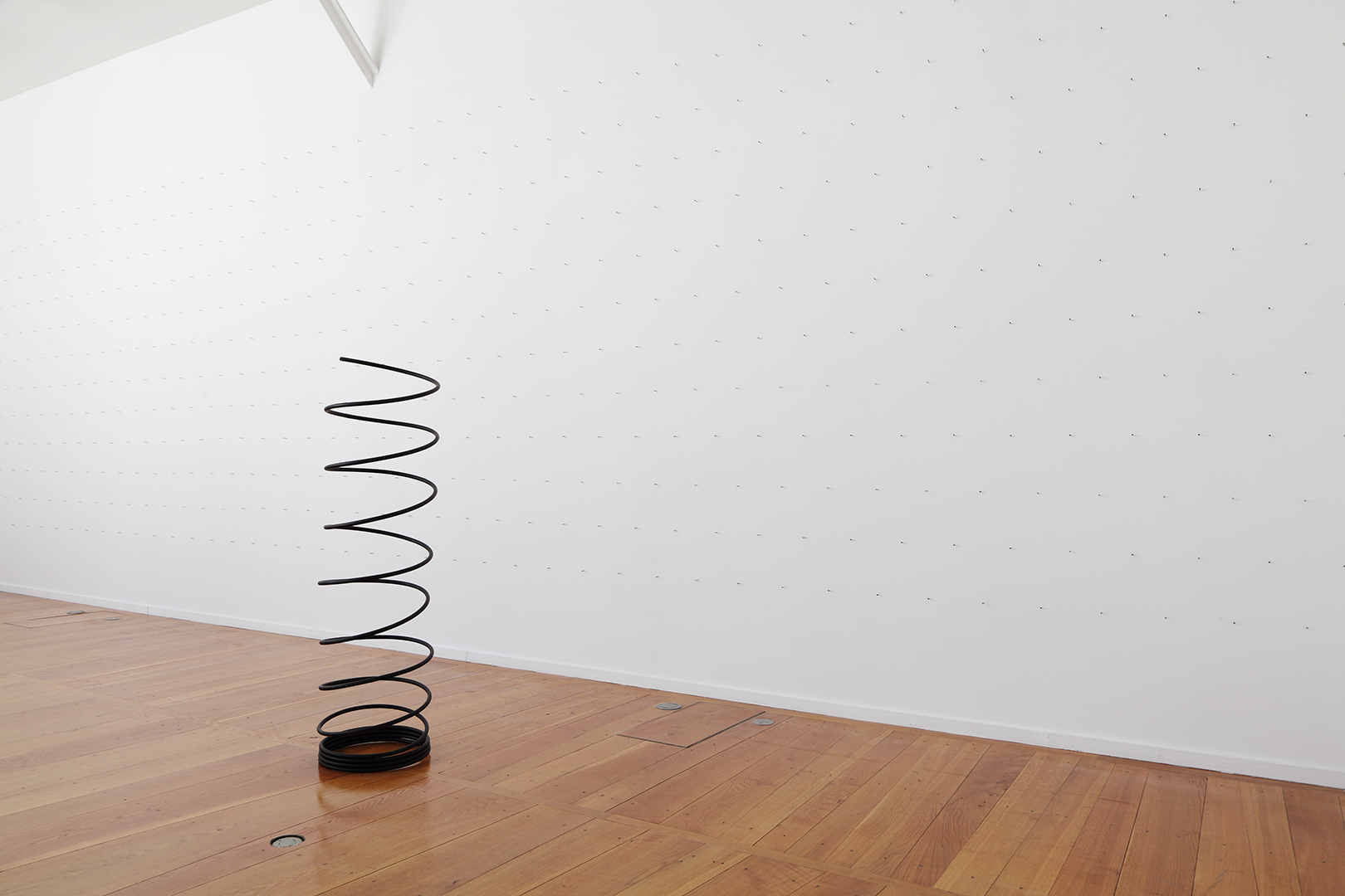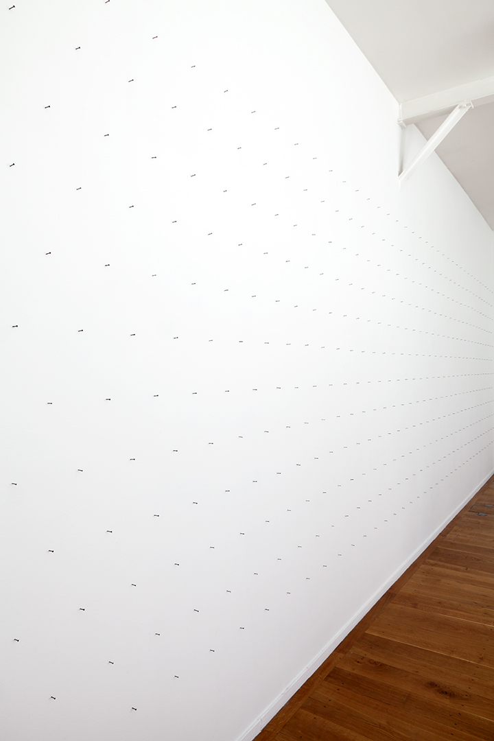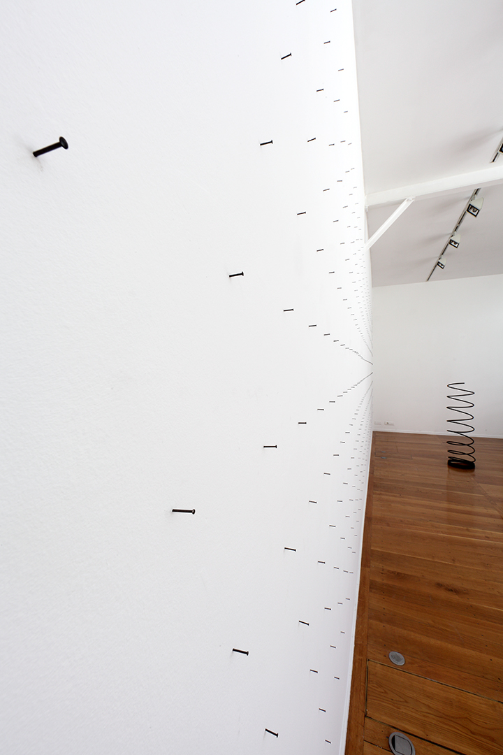 Through his immersion and saturation of the real, Denis Savary moves beyond it, turns it upside down, in order to push the spectator into a parallel reality. Here, the grotesque and the exotic dance in time, forming a poetry of the banal: a wooden fence becomes an abstract painting, a wall of nails looks as if it is waiting for a painting, a two meter high spring appears fragile, as if it is just about to fall. His manipulation of scale underlines the architectural elements of these objects and upsets the usual order of things: advertising panels find themselves inside a building in a long straight corridor, and the spring has become so large that the movement of the bounce, fundamental to the object itself, has become absurd.