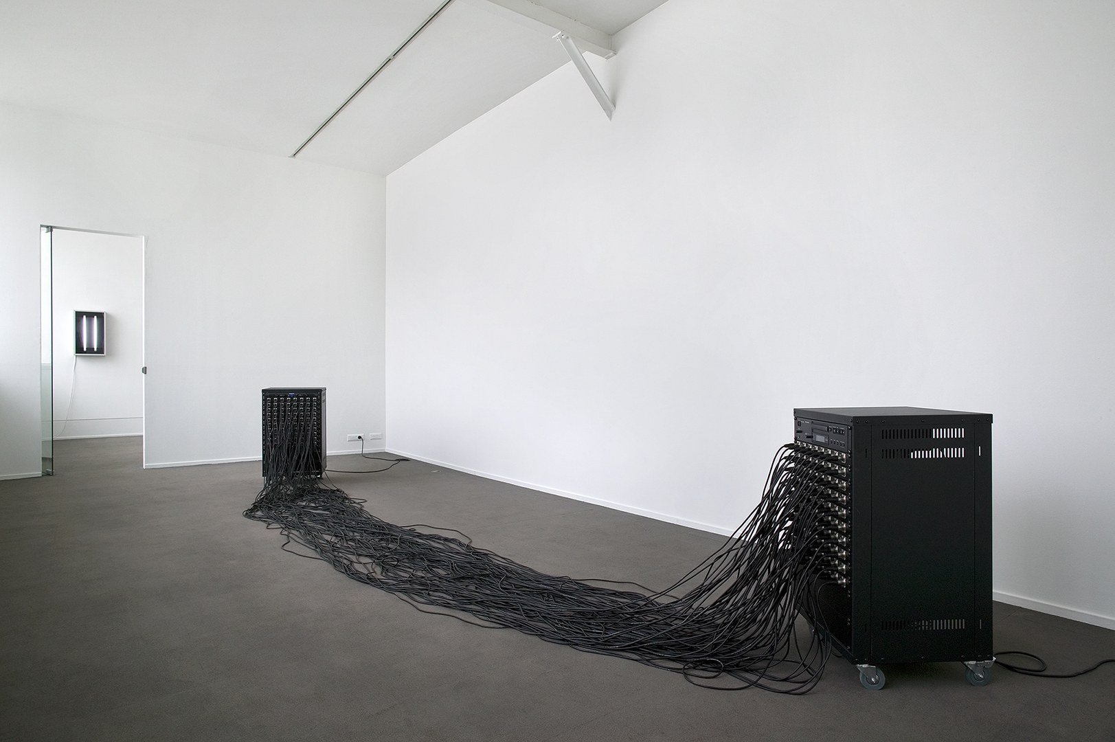 Dominique Blais assembles the conditions of possibilities of mental representations. Many works exploit the concept of absence in order to leave room for a coexistence of other things, of insertions, and thus of the imagination. This is particularly apt of the sculptural installation Transmission (2009),** in which two sound docks are connected in a baroque labyrinth of tangled electrical cables, circulating an inaudible sound that is only manifested by the discreet dance of the luminous diodes. Before this work and the flux of its imaginary music, we become the involuntary spectators of a secret conversation.