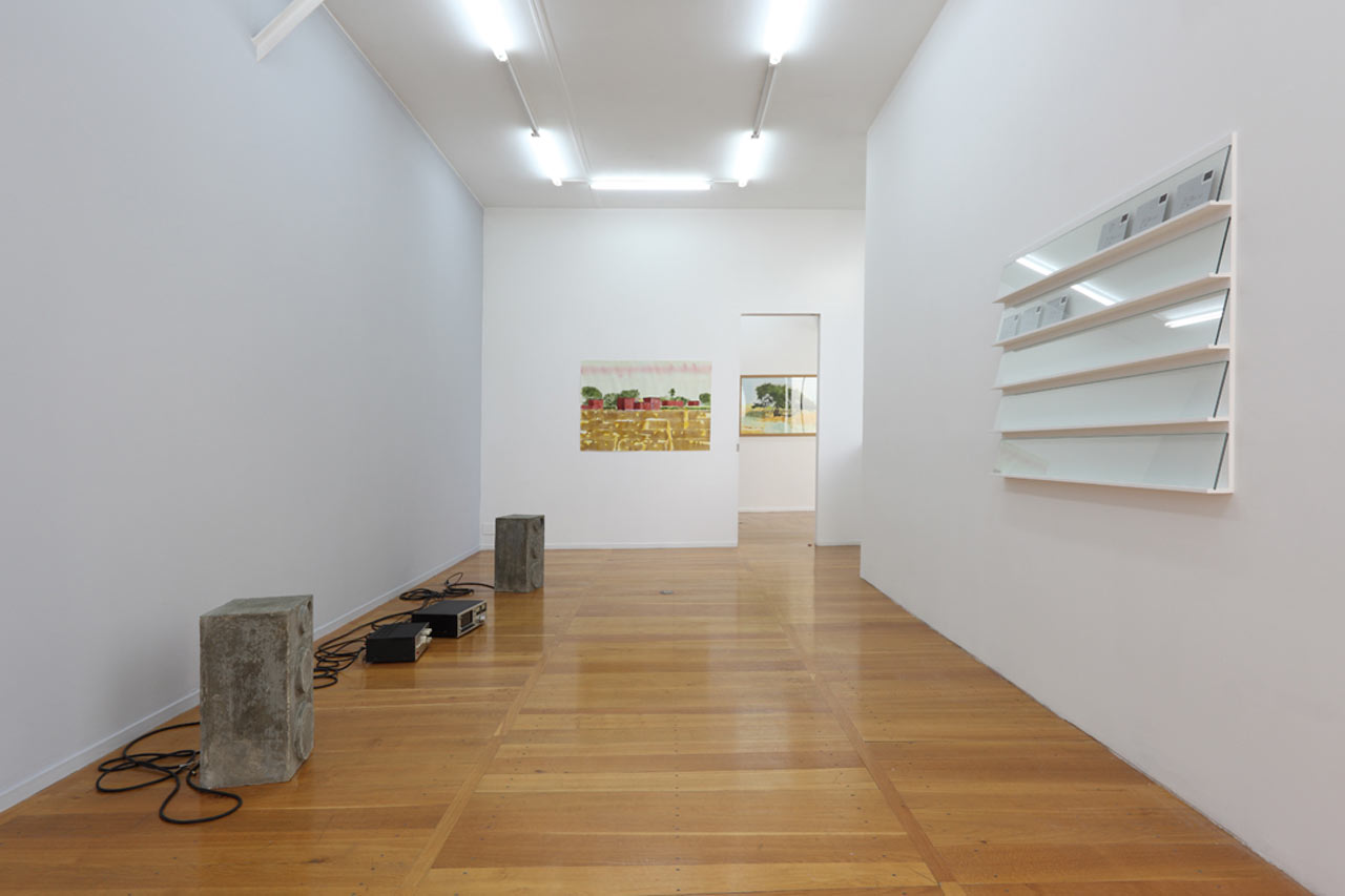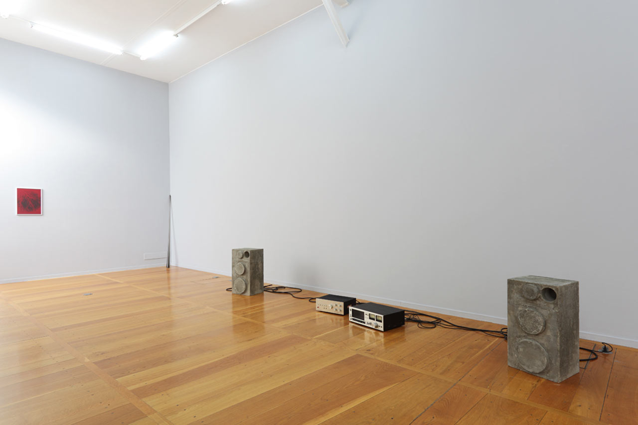 The artwork Concrete Soundproof is made up of a high fidelity stereo and two gray parallelepipeds sitting directly on the floor. The two concrete blocks, which seem to be faux speakers due to their shape and their position, are wired to a tape recorder and an amplifier. In reality, these shapes are the “negatives” or the inside shape of the speakers. The artist poured a mixture of cement and various other soundproofing materials into the wooden exterior of the speakers. After having first removed the speakers’ baffles, he dunked them in a mix of concrete fibers. Having become functional again, the apparatus plays music that is barely audible, similar to a soft humming that drifts throughout the exhibition space.
