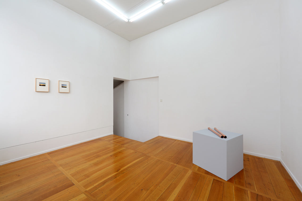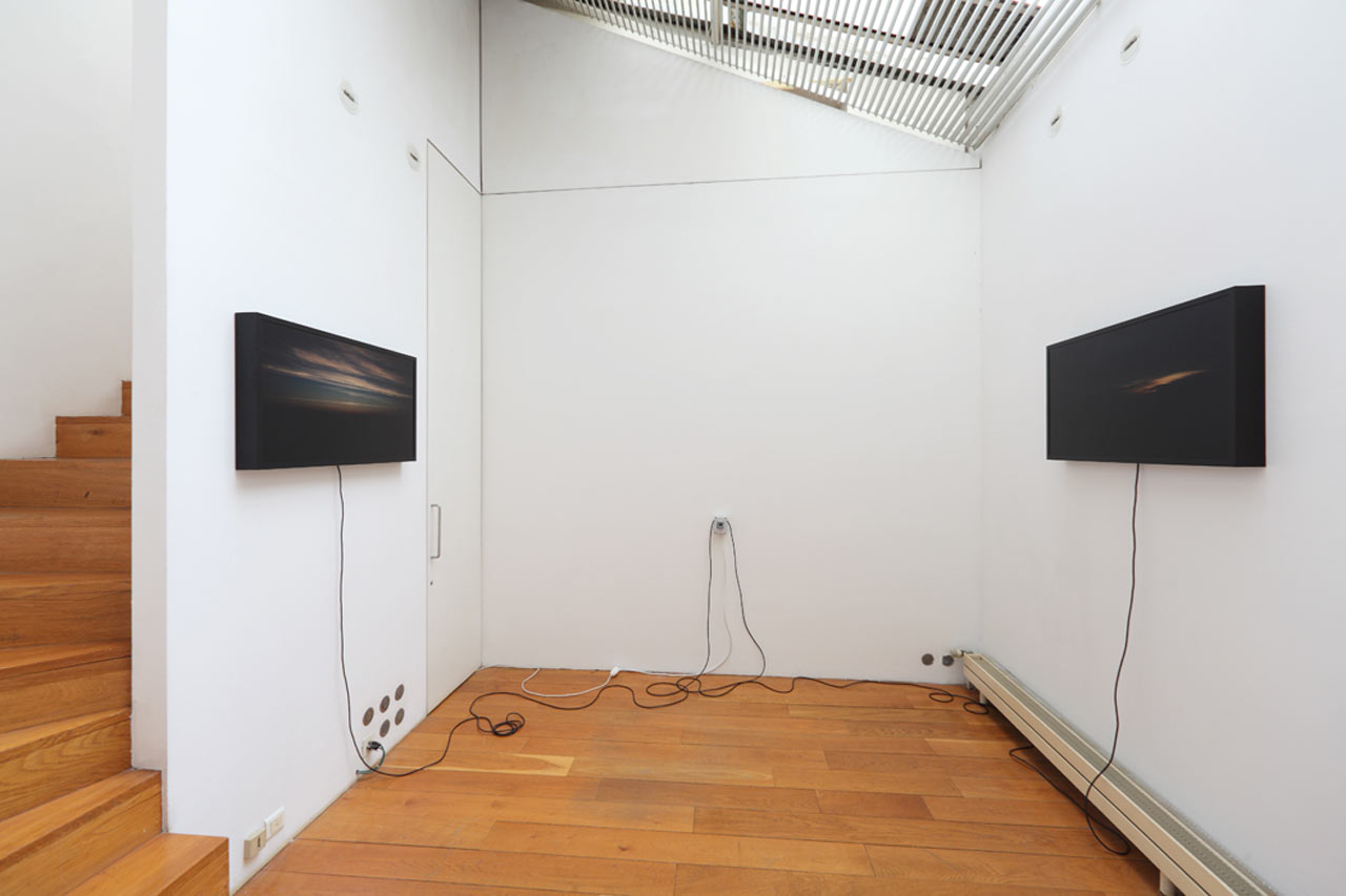 The diptych Ten Hours Stories (Jan.15), a series of framed photographs depicting the sunrise and sunset at Los Angeles January 15th, 2003, functions as parenthesis that opens and closes: an elliptical spacetime or a space of mental representations. A second piece, present in a hidden space in the gallery acts as a manifestation of this process. Two light boxes frame images of a sunset and a sunrise taken at Nida (Lithuania) and they illuminate for one minute a day, at the exact times that the pictures were taken.