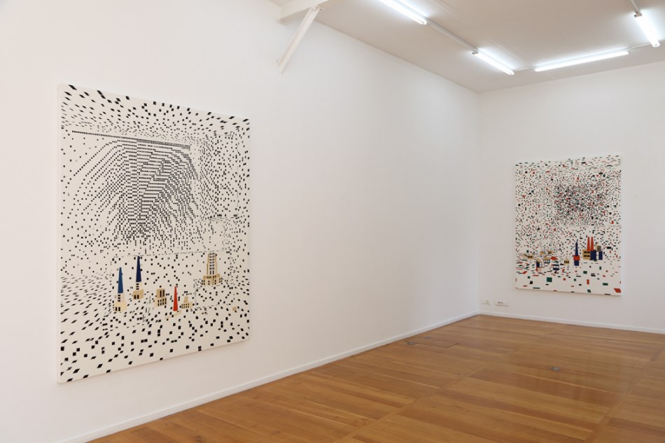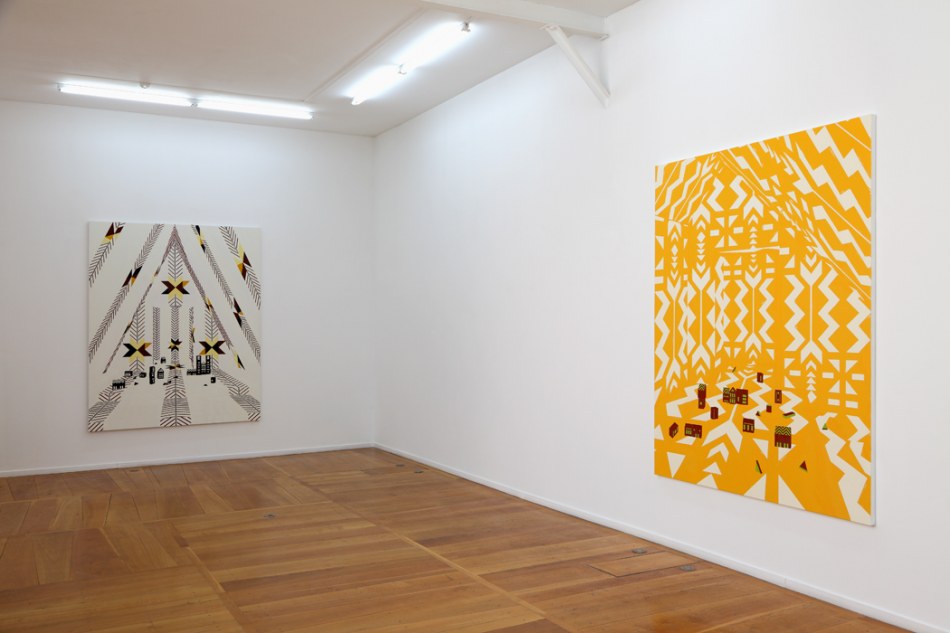 The consistent dual presence of the all-over backgrounds and display objects in Farah Atassi’s paintings allow her to create a dialectic where she confronts modernism with aesthetics that are generally considered as contrary, such as Expressionism and ornament. For example, in Toy Town II, the zigzags in the background interrupt the modernist grid and also echo Lyonel Feininger’s expressionist cathedrals. In Tabou I et II, German folk decorations graft onto the modernist framework. This interplay of opposing aesthetics was inspired by Fritz Lang’s Nibelungen, where we see a strange aesthetic mixture of Bauhaus and German folk art. With these new paintings, Farah Atassi creates secret and mysterious spaces that continue to fascinate us.