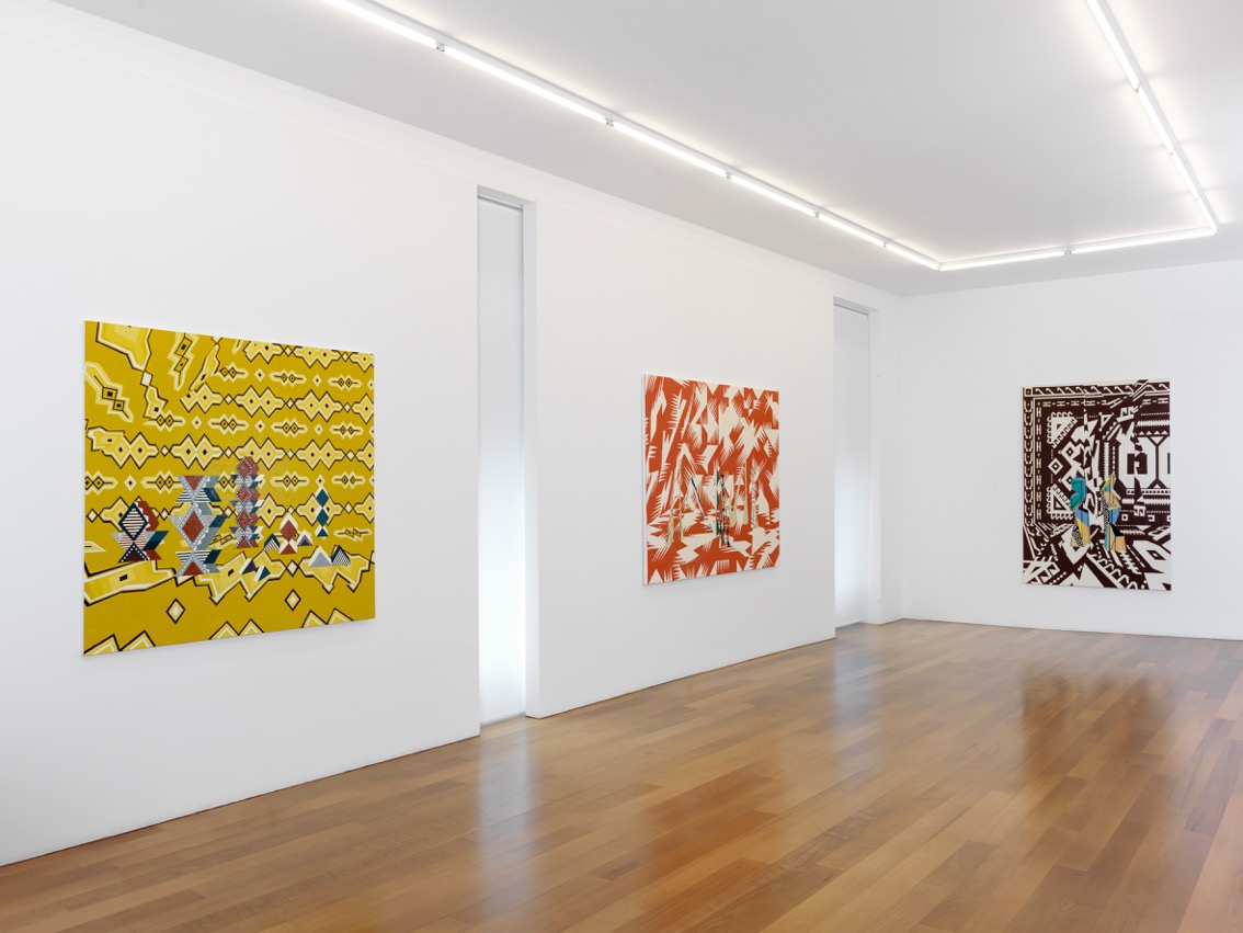 It’s true that at the beginning there’s a long process of stitching images together. These come from decoration books (patterned tiles, carpets, and architectural ornaments) and art history books. I take a lot of time before I actually start painting. Once my project is clearly planned, I start by defining a space on the canvas. Then I make a grid with adhesive tape that follows the painting’s perspective, like a 3D grid. I never use computer software. I use this grid to spread a pattern on the whole surface of the canvas. Then I begin placing objects in meticulously defined spaces, as if arranging them in a room. It’s like a composition built on a utopian space.