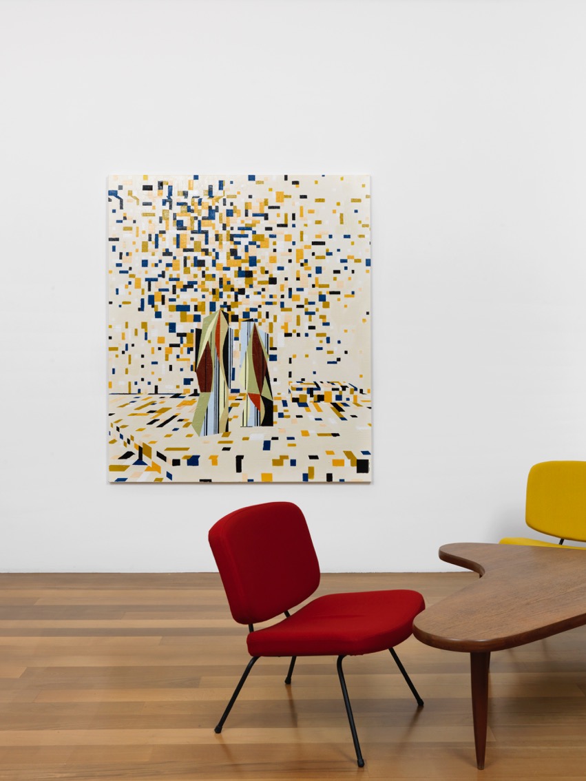 TC: Your paintings are a collection of shapes and patterns, evoking the idea of the collective as a space for co-existence, encounters, dialogue, a collection of shapes, of objects, of patterns, all facing a multitude of viewers. Surprisingly, several interpretations of your paintings mention their coldness, their disturbing, melancholic, and monastic aspect: paintings pervaded with solitude. Yet to me they look rather saturated, crowded, as if they reflect the movement of a kaleidoscope or a mechanical ballet.