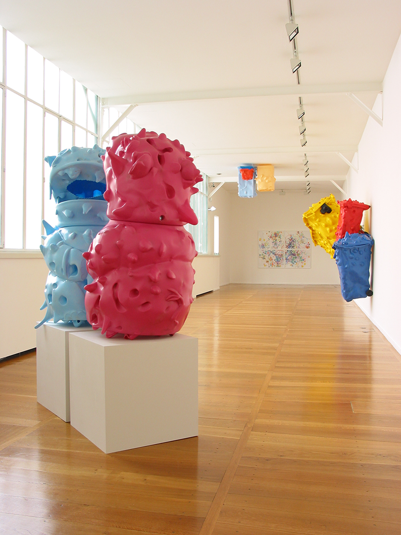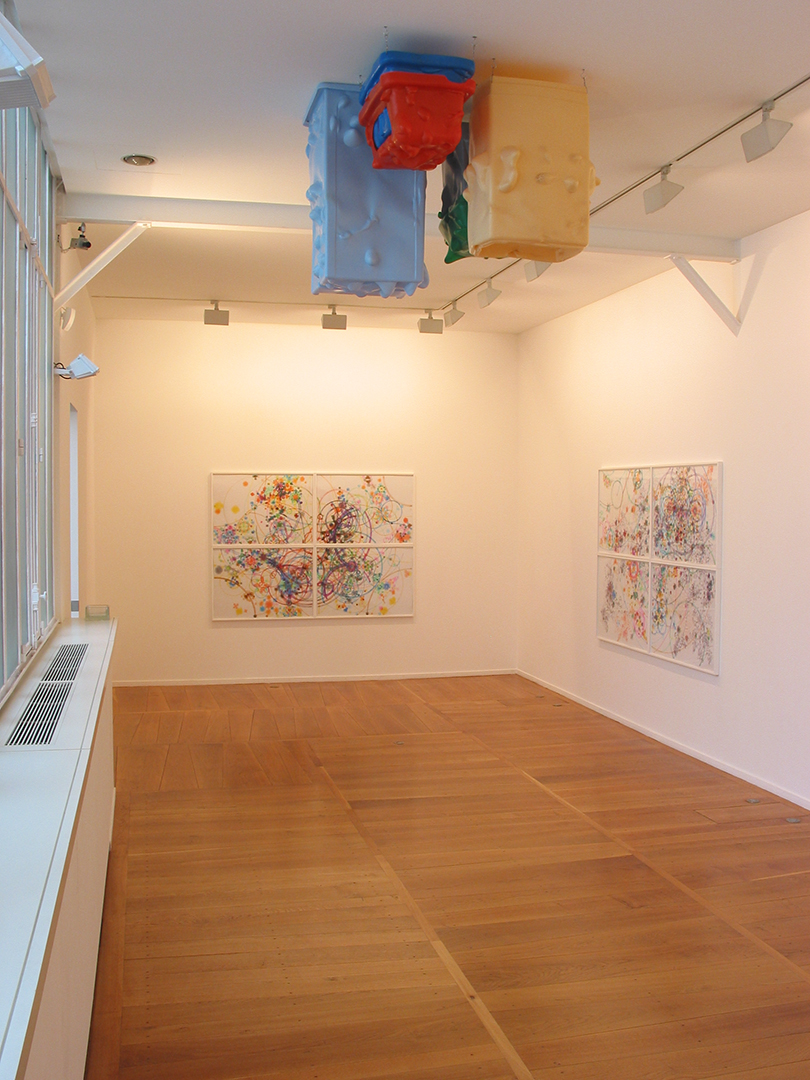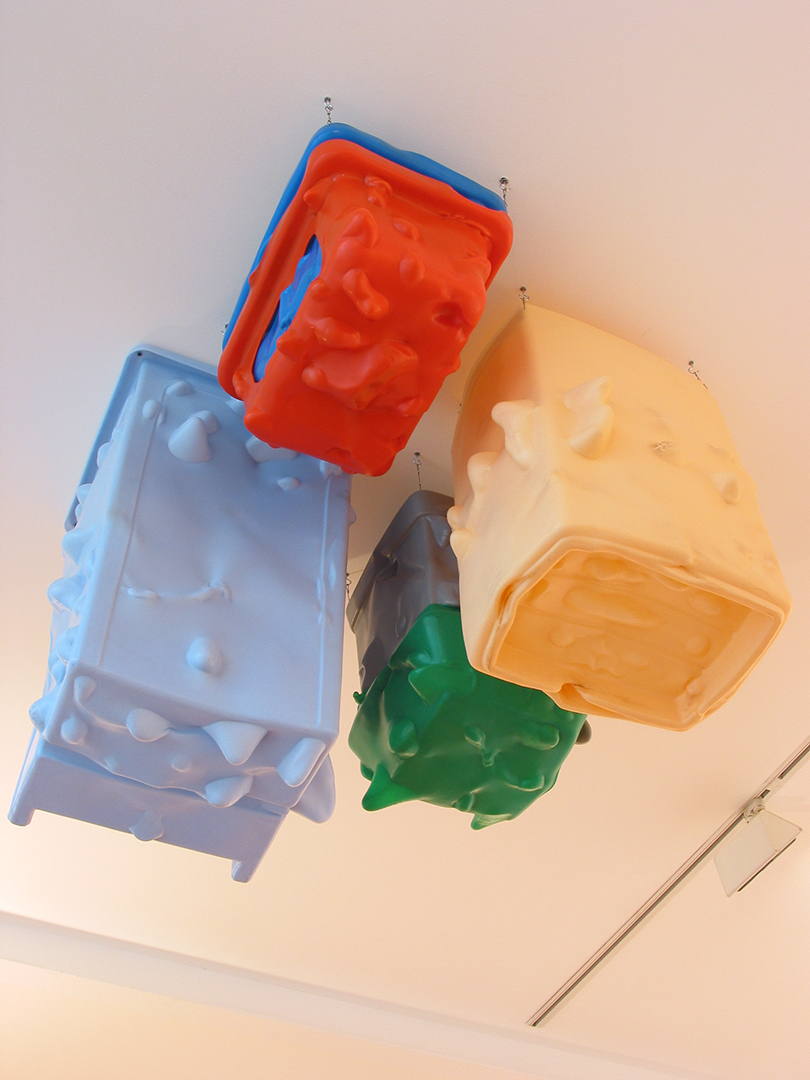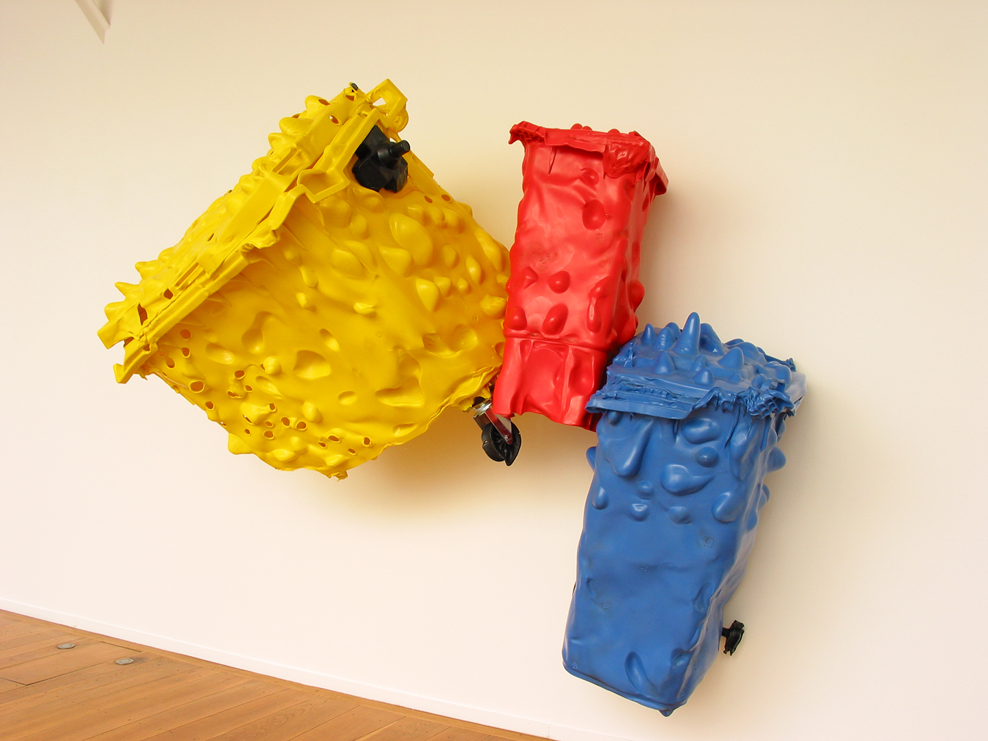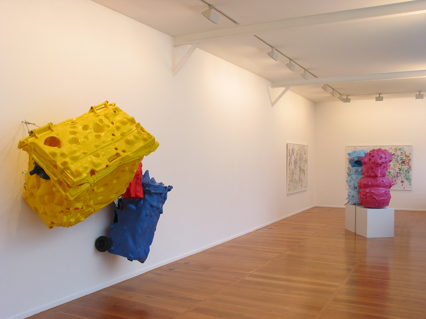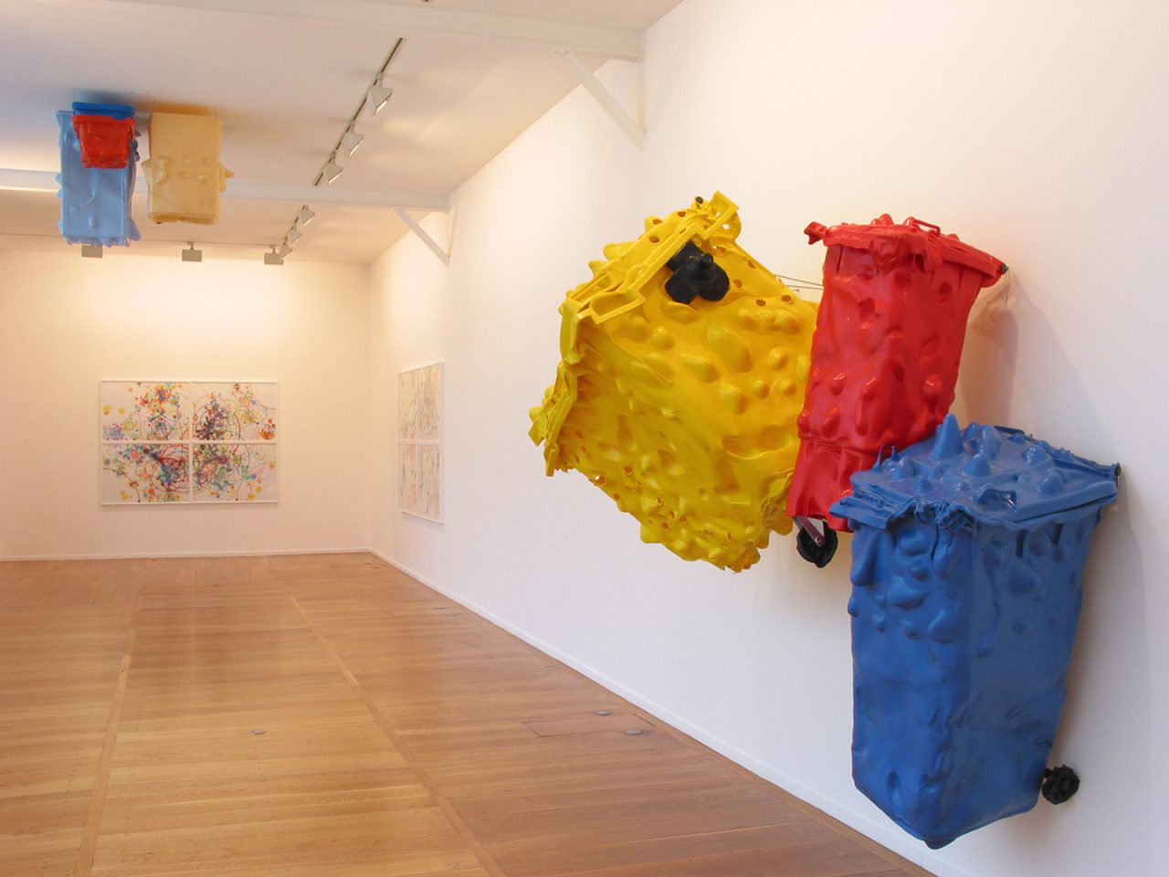 In these new works sets of bins are clustered together, a set of office bins hang stalactite like from the ceiling, while a set a bright primary wheelie bins protrude from the wall, the industrial colour coding that signals functionality is re-used and related to an abstract painter’s visual experience.