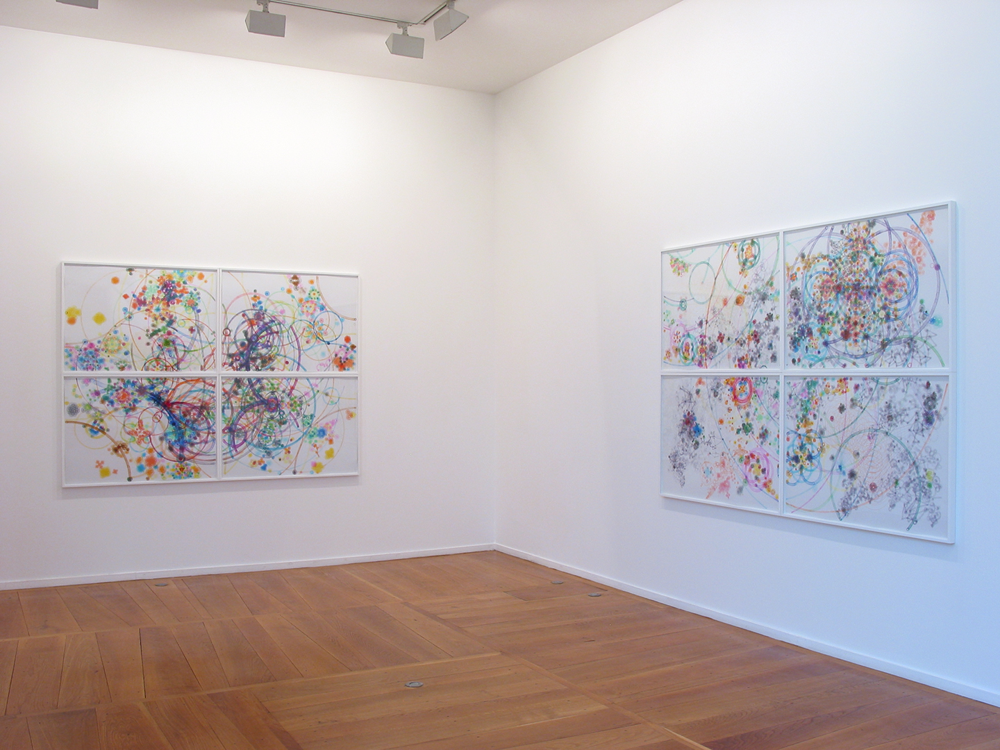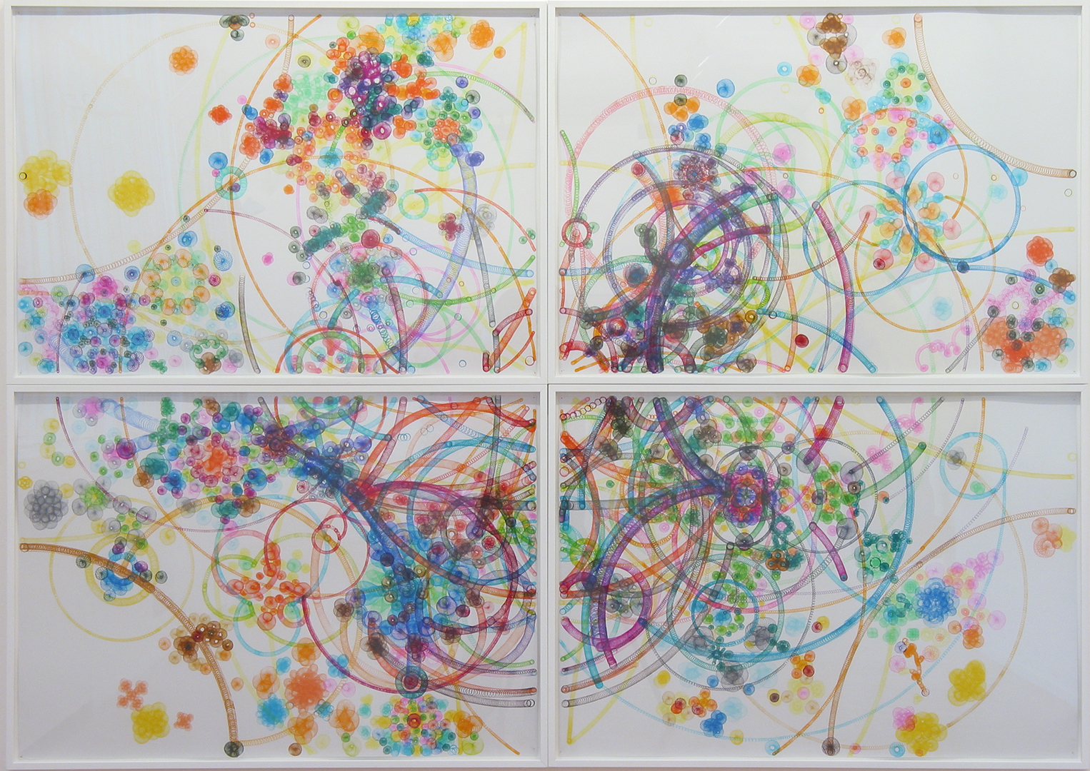 The artist will also present a set of ‘spriolator’ drawings made with a home-made toy. Made from «meccano», this contraption spins a pen in an endless spiral. These dense chaotic and colourful drawings contemplate a vastly elongated cycle like the rotation of the plastic or the endlessly long chemical chains that are plastic polymers. The skewed and obliterated