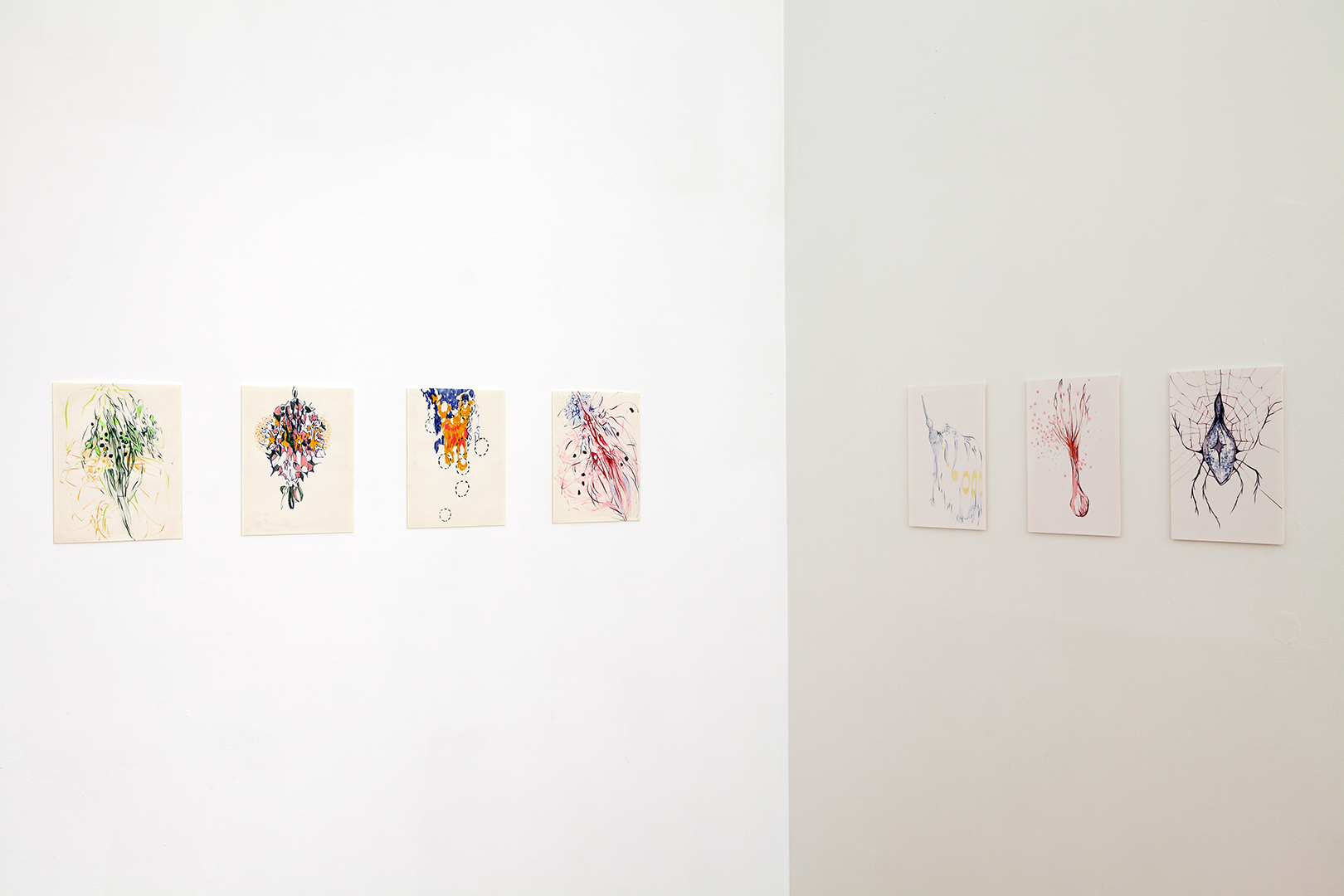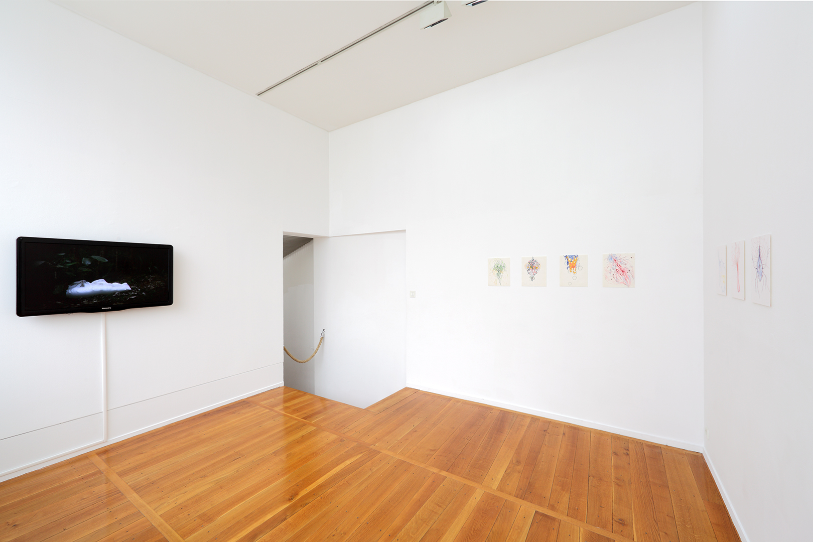 As always, her work functions at a variety of scales, expanding and contracting the viewer’s point of reference from micro, sub-atomic particles to the cosmic and metaphysical scale of the classic Romantic landscape. In many ways, these drawings are not only Impressionistic representations of natural landscapes, but due to their almost heroic scale and the wandering eye of the viewer, like Monet’s ‘Nymphéas’, they are landscapes in and of themselves. These are thick, enveloping formal gardens of entire ecosystems – where life blossoms and flourishes, only to decay and die (or perhaps breathe new life). There is an acute, iridescent use of light –articulated by an unconventional palette suggesting South American flora and fauna – compounded by the matt surfaces of dry media on paper, materials absorbing the viewer into the physical support as it pulls the viewer into its open-ended narrative. Time eerily stands still, even as we contemplate forms which seem to grow and catch us in its thickets. The effect is simultaneously light due to its soft and comforting mammalian nature, and almost threatening in its ability to remind us that nature can overwhelm the physical body.