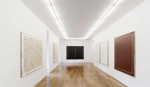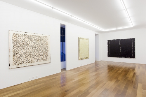 By drawing furrows, the artist fashions the motif and isolates it, revealing the undercoat. Smoothed and scratched, the painting’s surface beckons near to discover the coats in which shapes are engraved. The canvas offers different readings and thus needs interpreting. The represented picture becomes a sensation. The point is no longer to describe a landscape or to conceptualize a space, but on the contrary to express the sensitive universe. The monochrome areas’ sobriety and the limited vocabulary allow the gathering and the identification of inner and outer spaces.